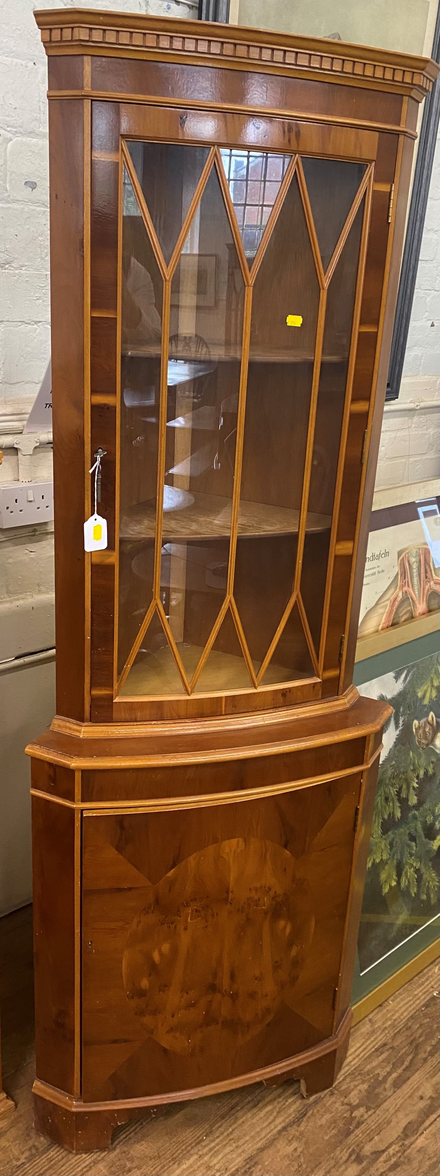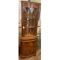 A Modern Yew Wood Veneered Corner Display Cabinet. With a single glazed door. 182cm x 65cm