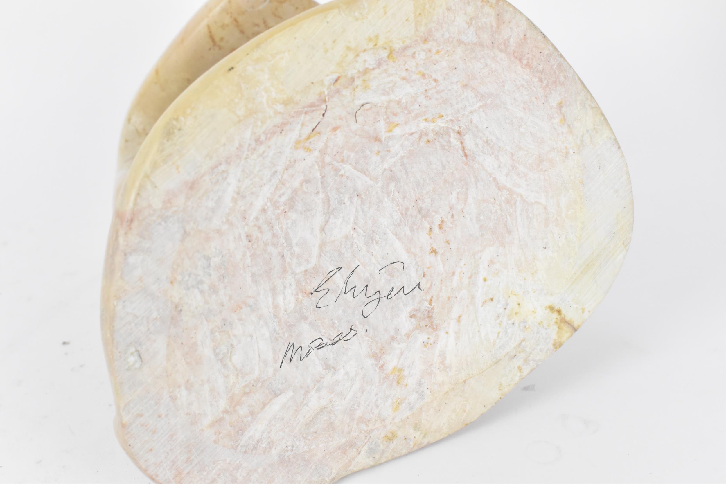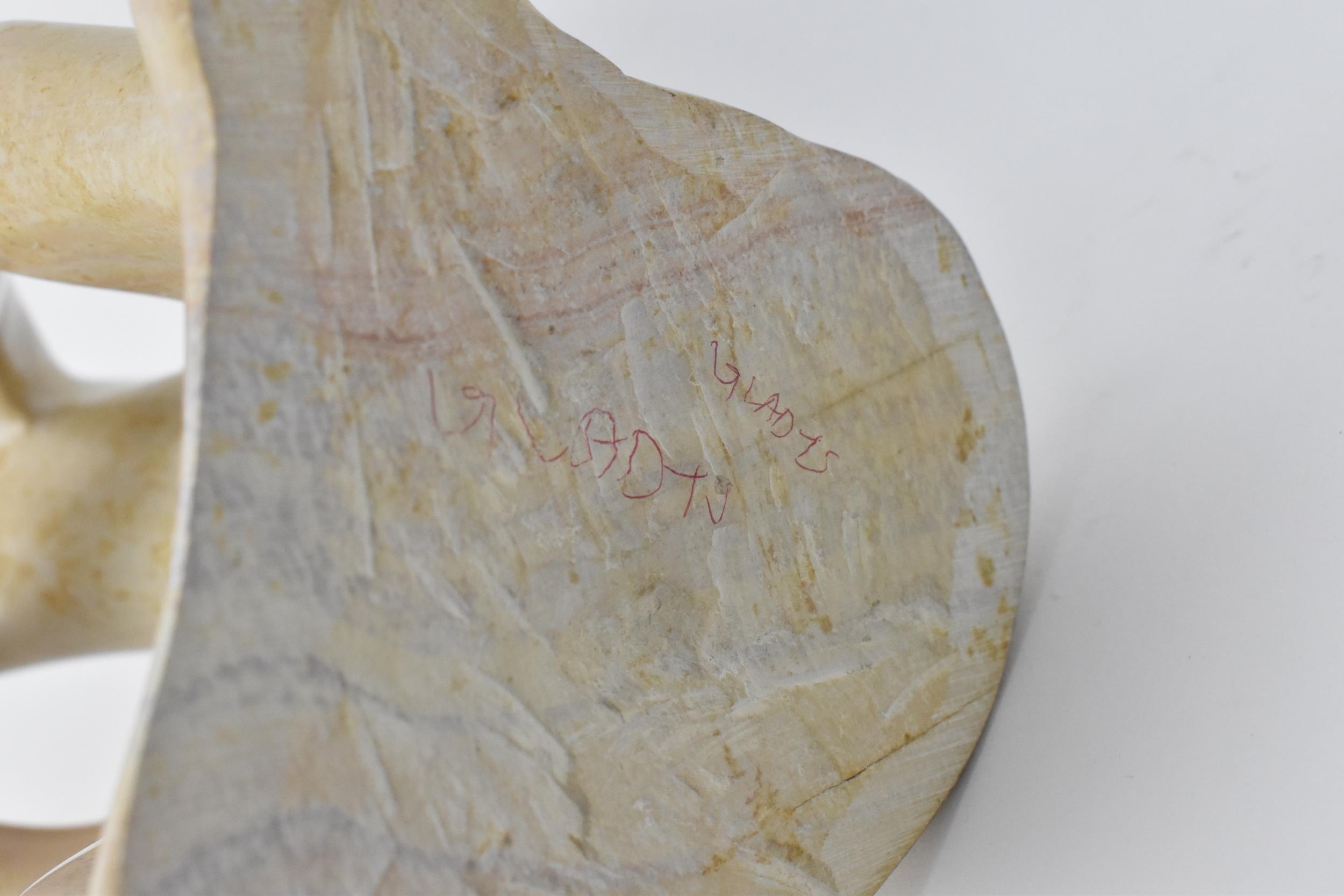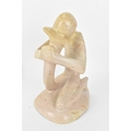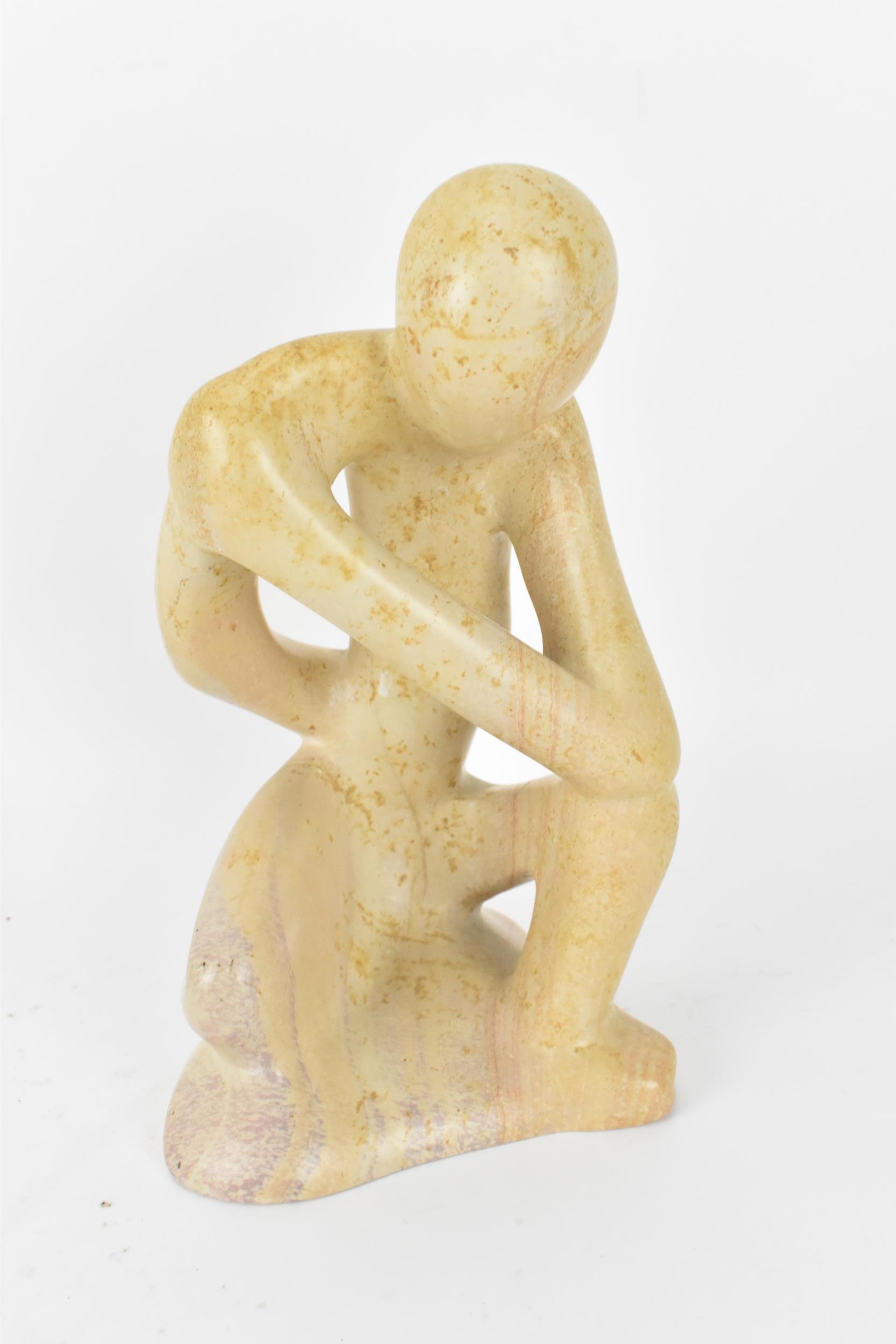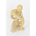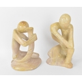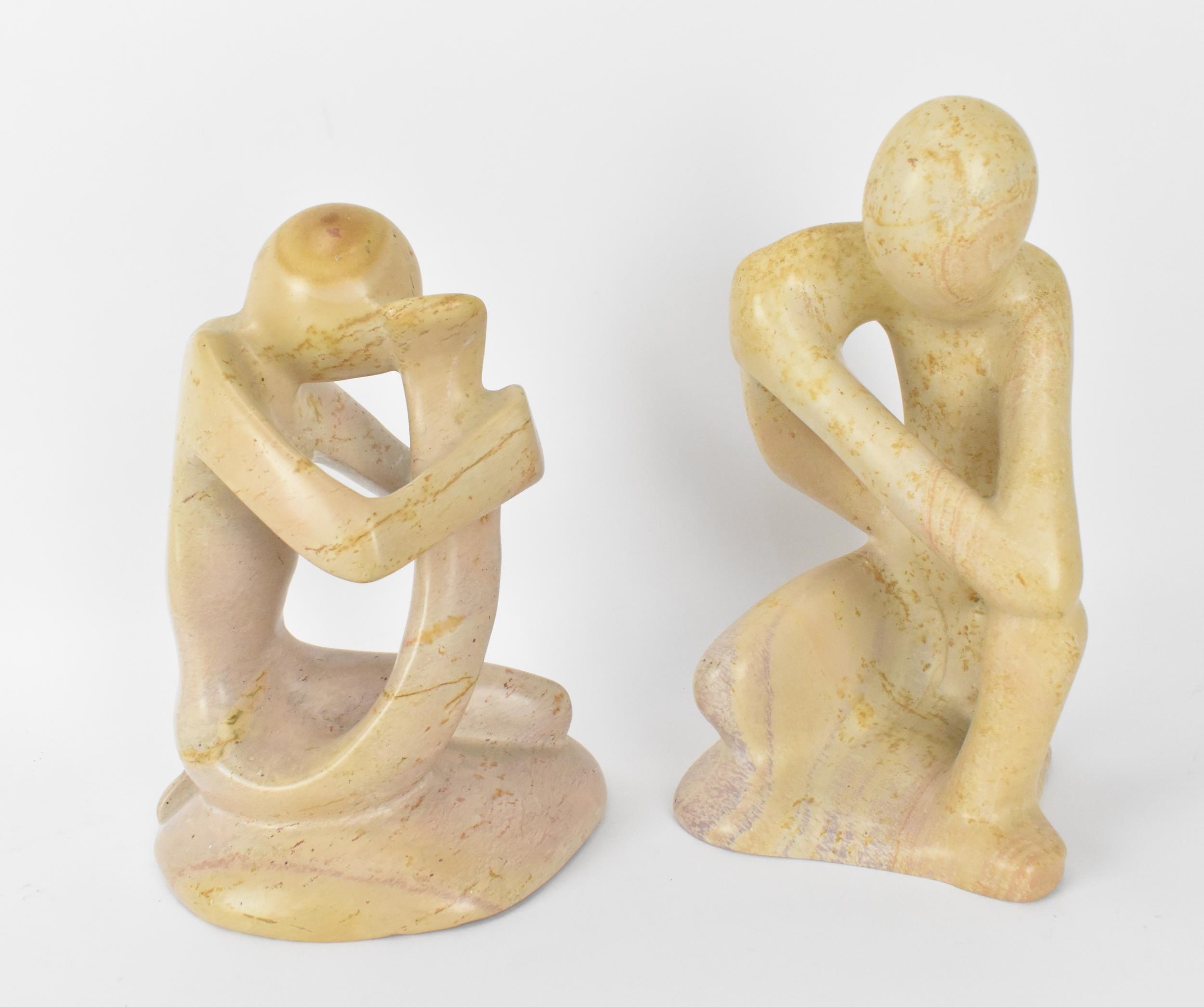 Two African soapstone figural sculptures, one modelled as a man holding his foot to his head, the other modelled as a a kneeling man resting his elbow on his knee, each signed in pen to underside, one reading 'Gladys ???' the other 'Elyhen???', tallest 22 cm high