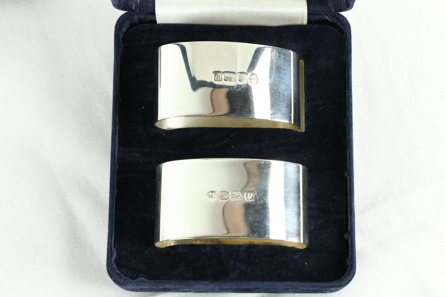 A Sheffield silver Sauceboat, c. 1890, 111 grams; a Sheffield silver Sauce Ladle, 31 grams; a pair of modern cased silver oval Napkin Rings, 70 grams; a silver Golf Tee and a silver Ball Marker, cased. (a lot)