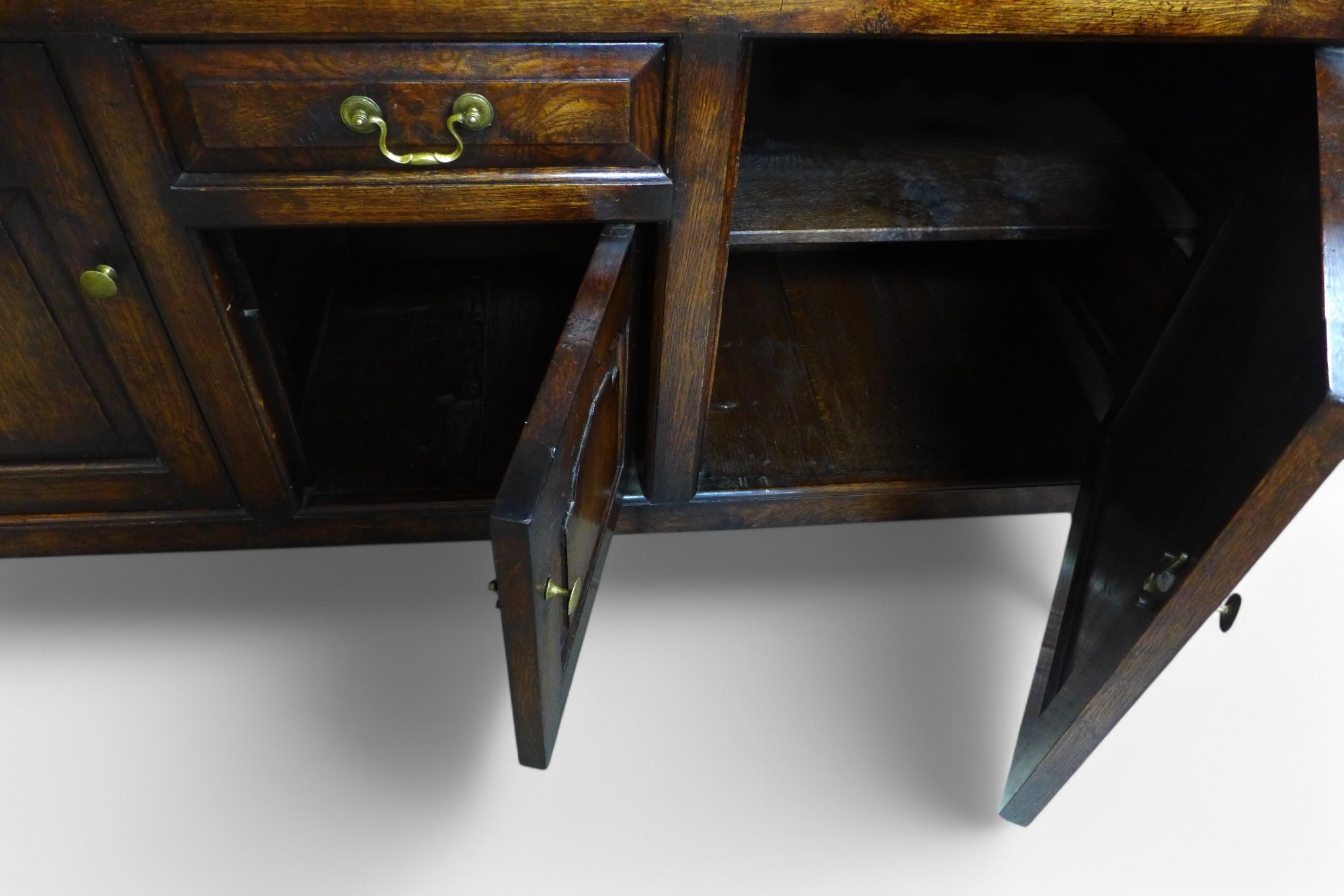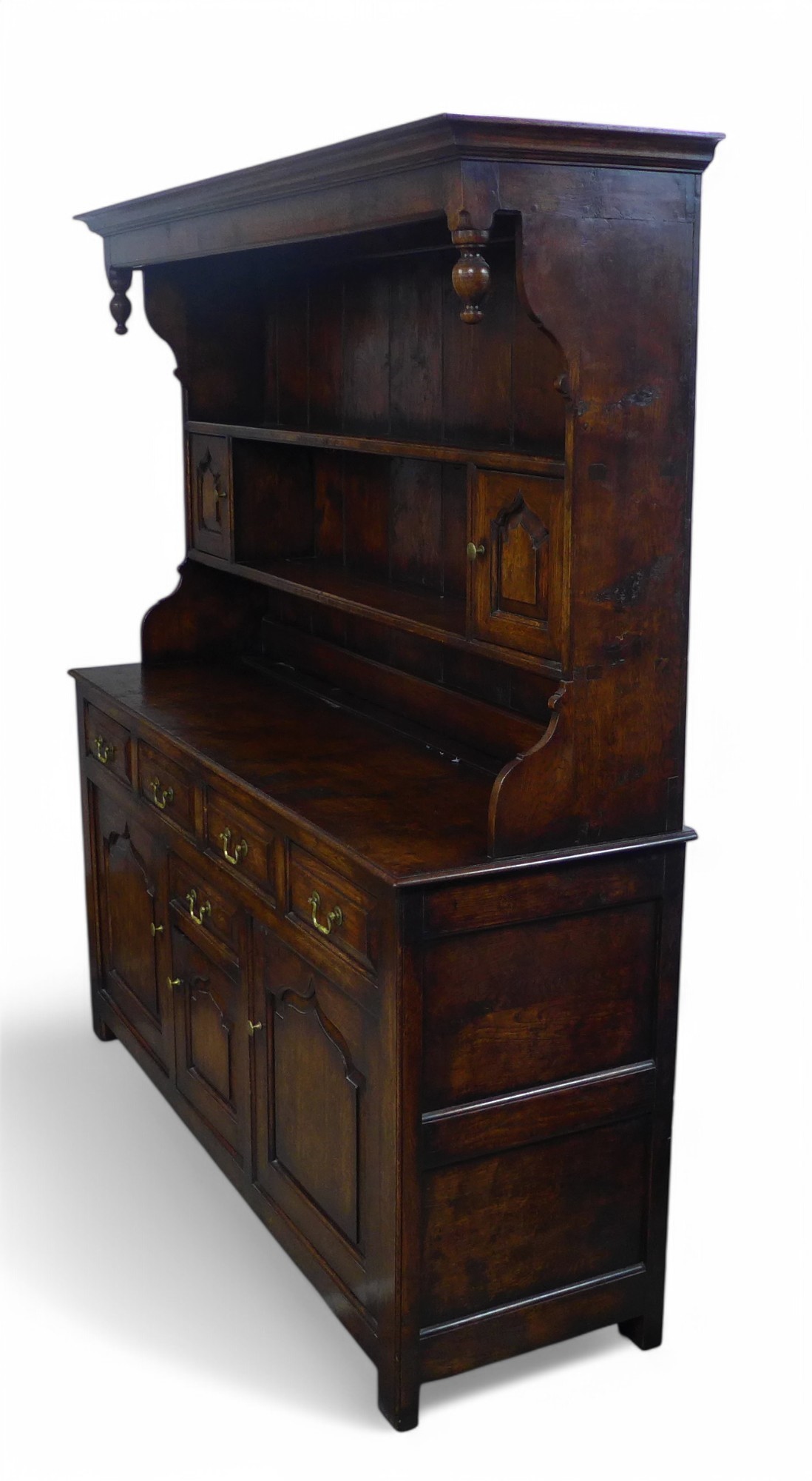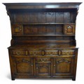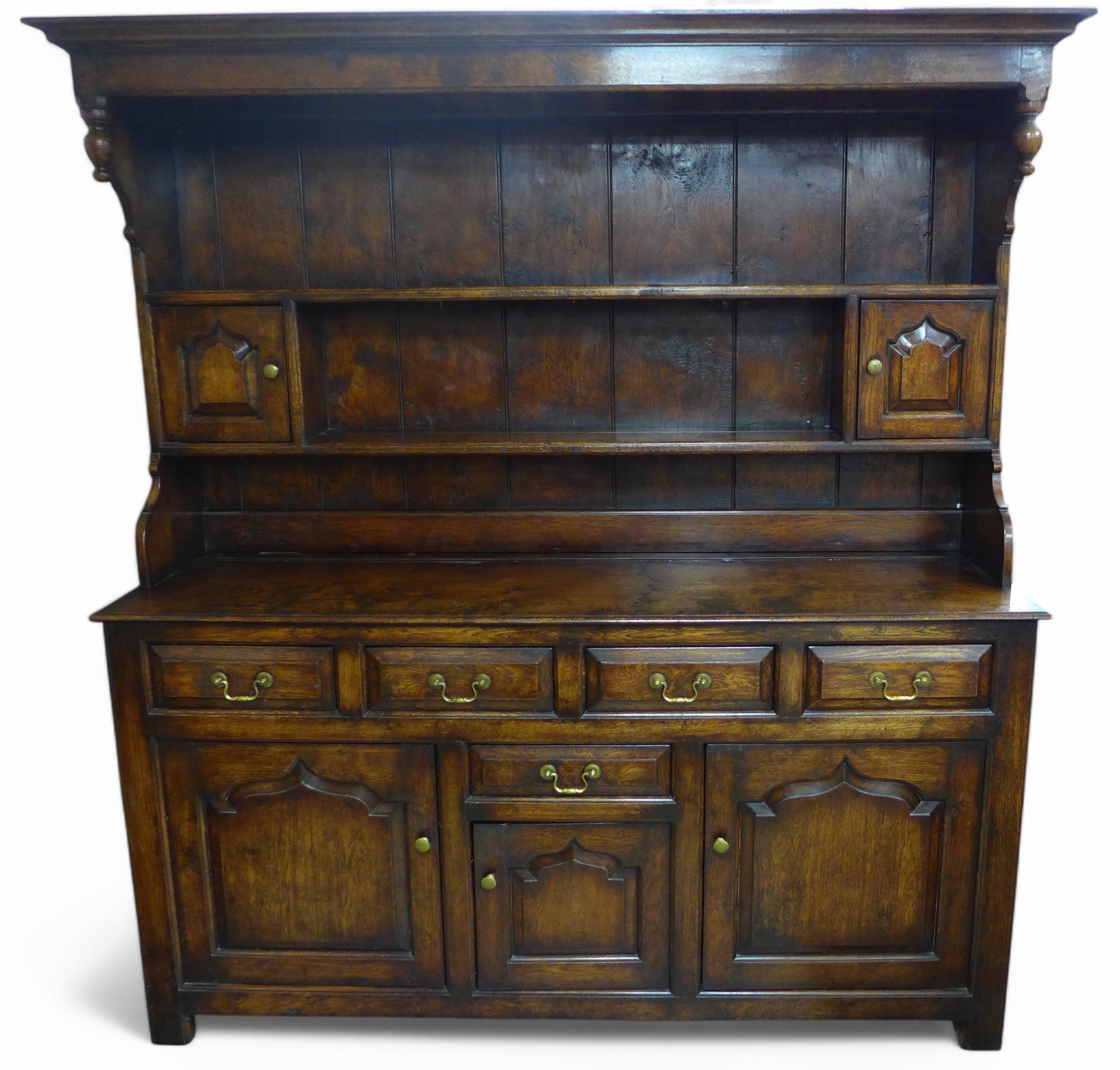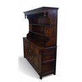 An 18th century style oak dresser, Bylaw Furniture Makers, the open rack top having two small cupboards above a five drawer three door base, 175 by 51 by 187cm high.
