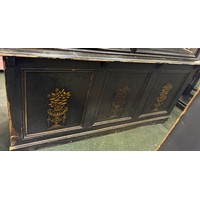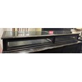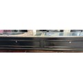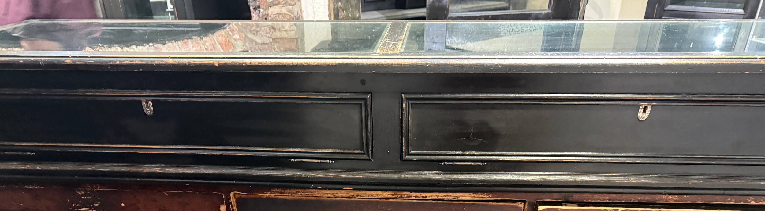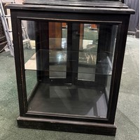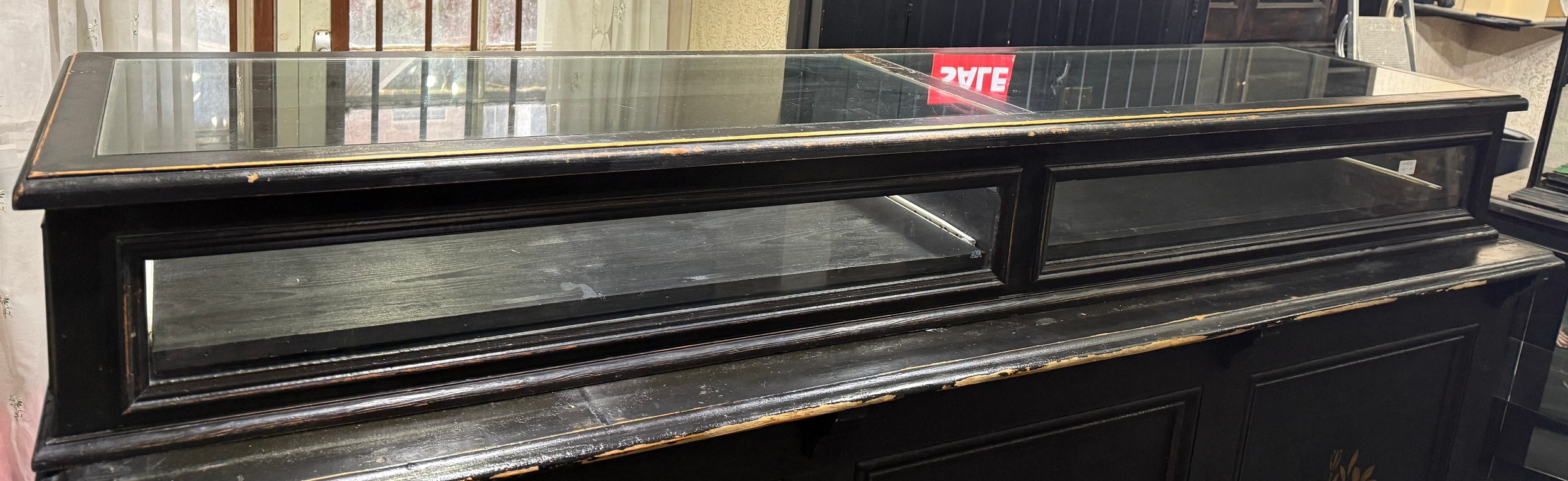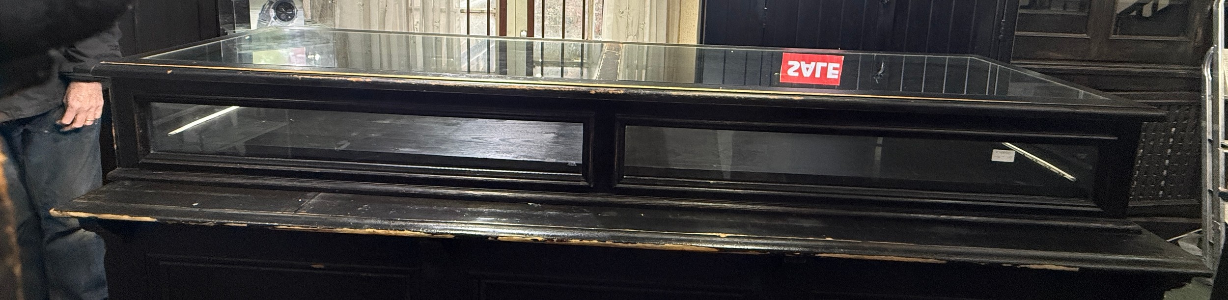 A modern pine counter topped display case with sliding shelves. 190cm w x 46cm d x 23cm h.