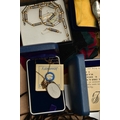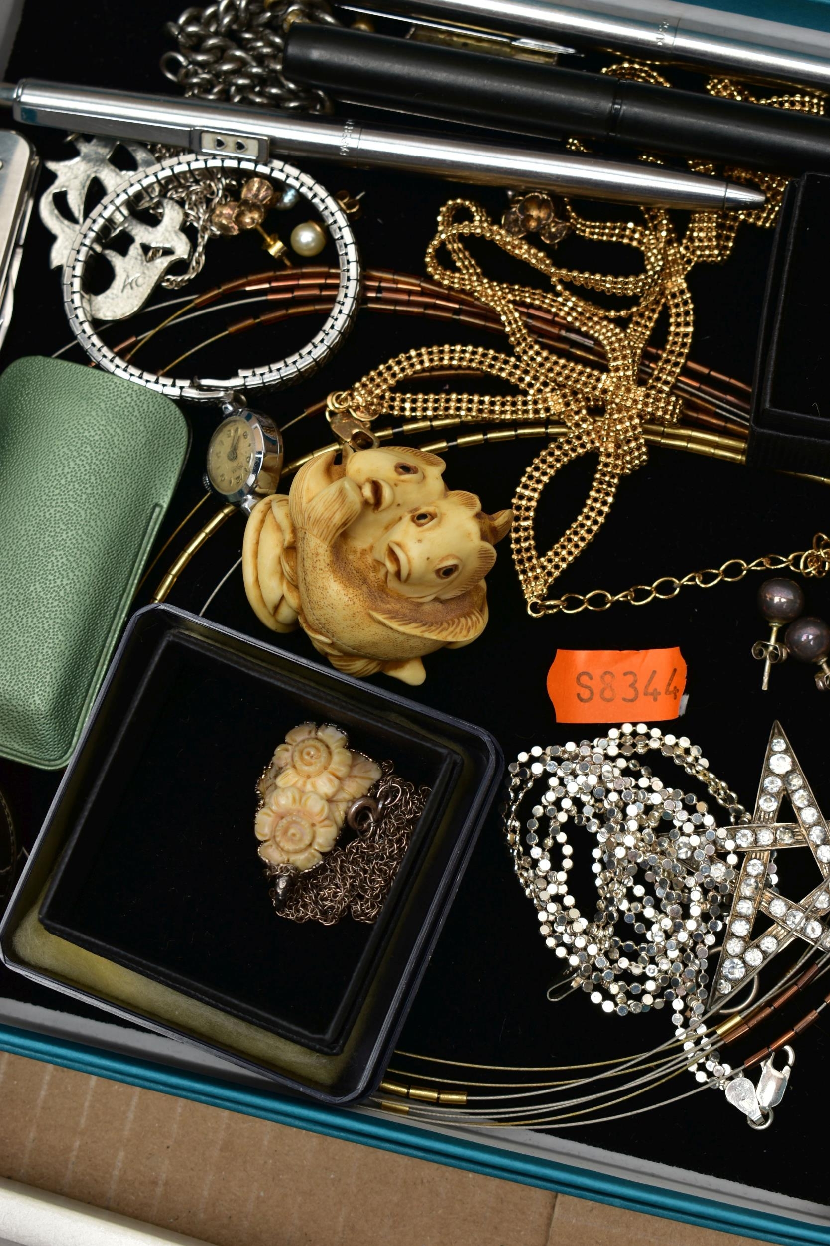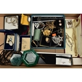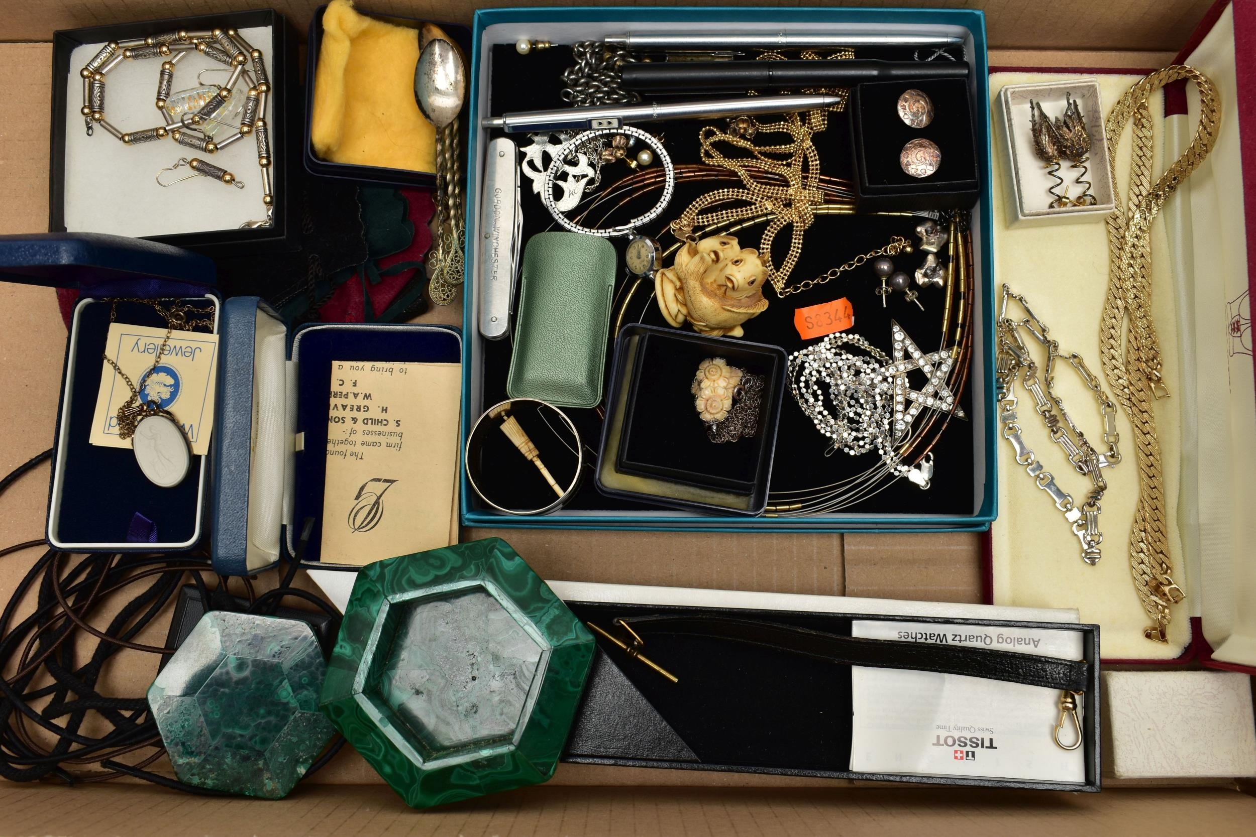 A MALACHITE BOWL AND ASSORTED ITEMS, hexagon form, comprised of malachite panels, fitted with a removable lid, also including a selection of costume jewellery, two Paper mate pens, a fountain pen, together with a small selection of other items