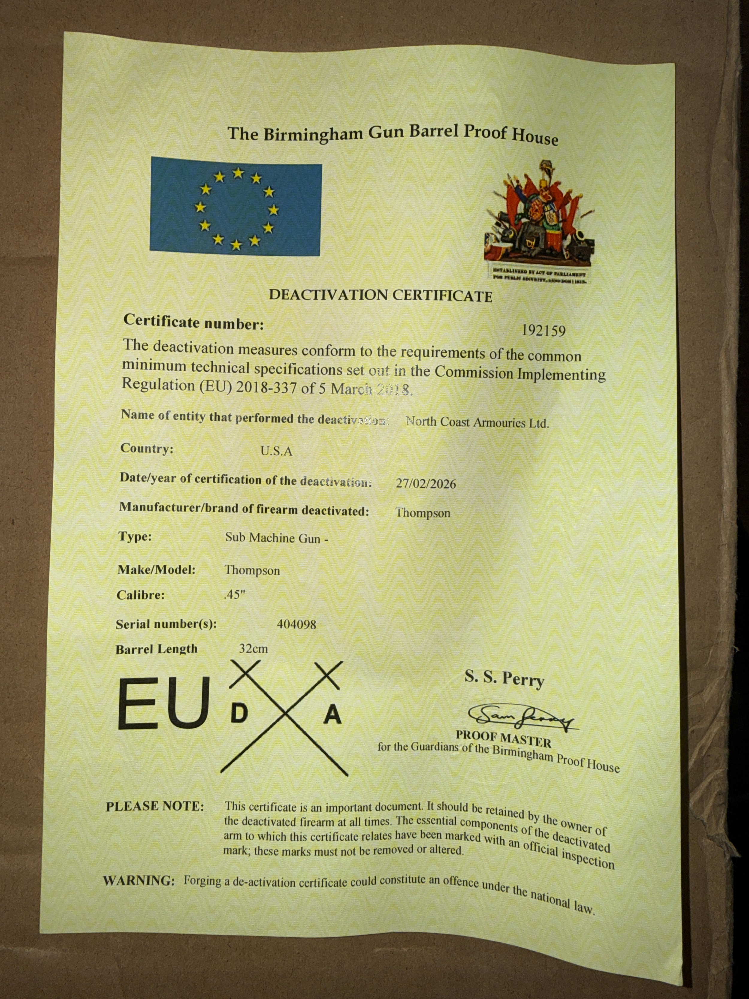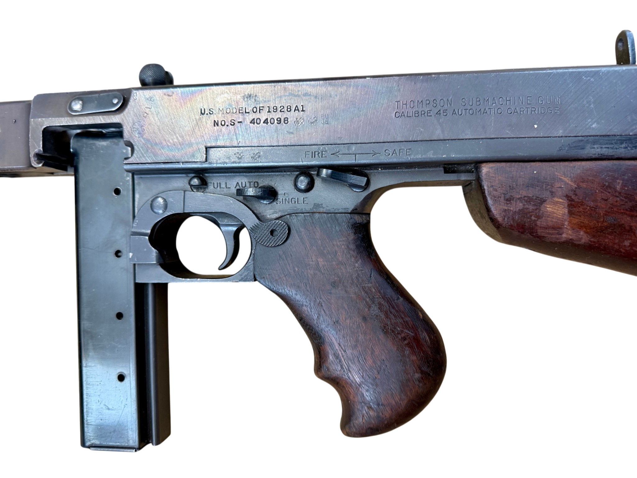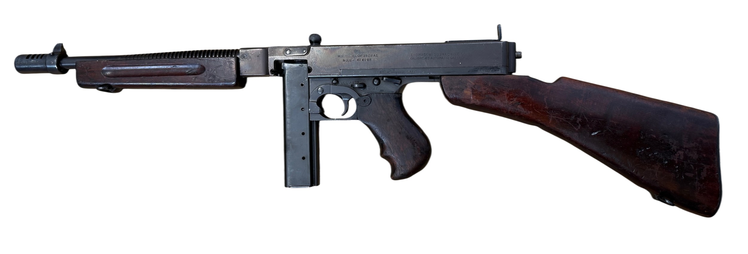 A deactivated American Thompson Sub Machine Gun, calibre .45'', barrel length 32cm, serial number 404098. With deactivation certificate.