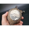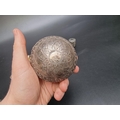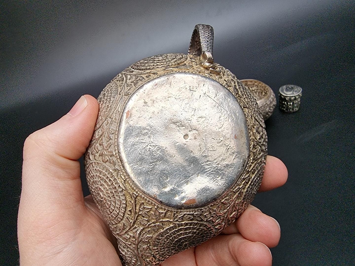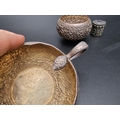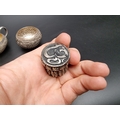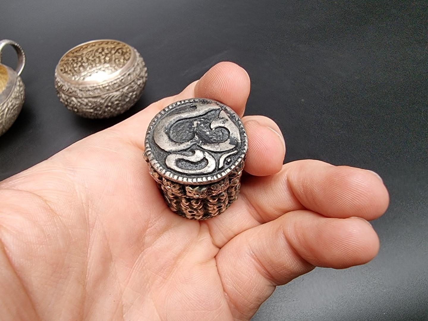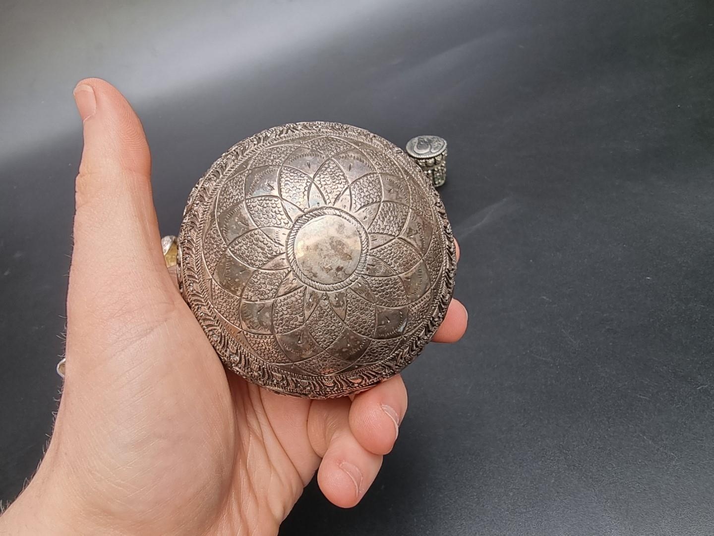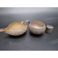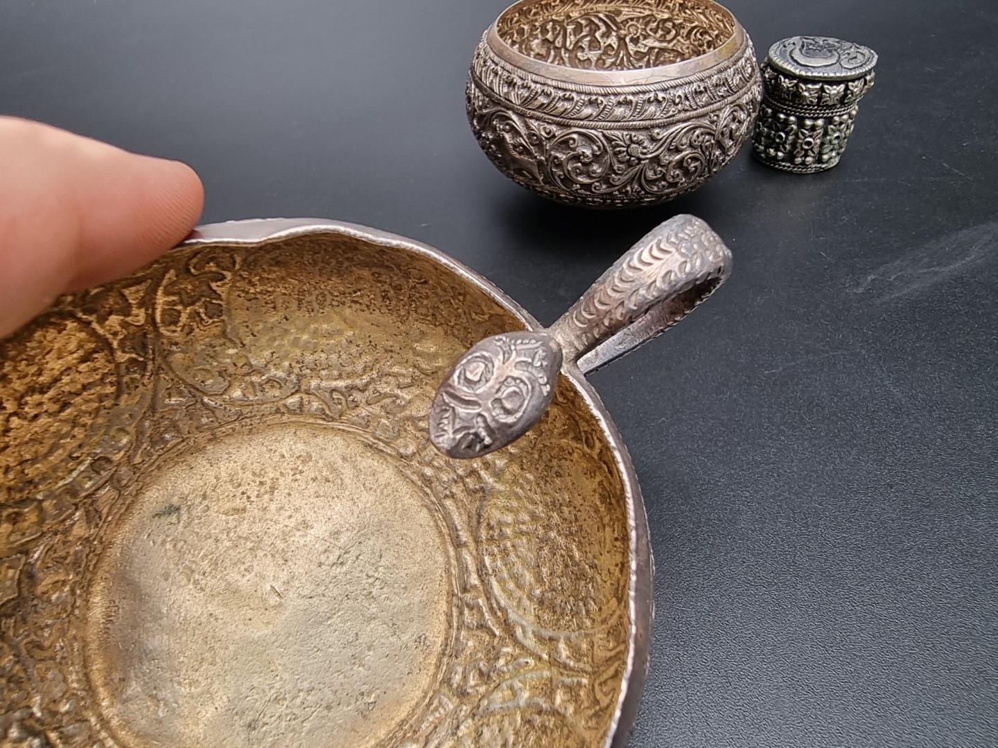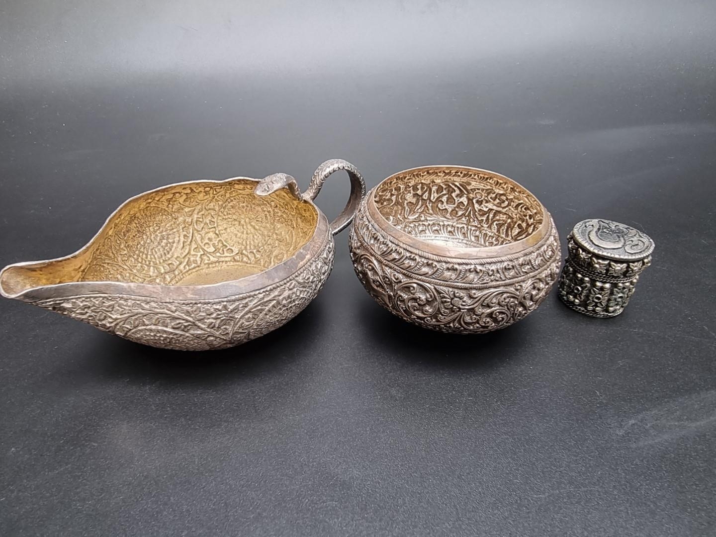 An Indian silver plated sauce boat, having serpent handle, 13.5cm long; together with an Indian white metal circular bowl, 8cm diameter and an Eastern metal pillbox, 3cm high. (3)