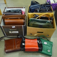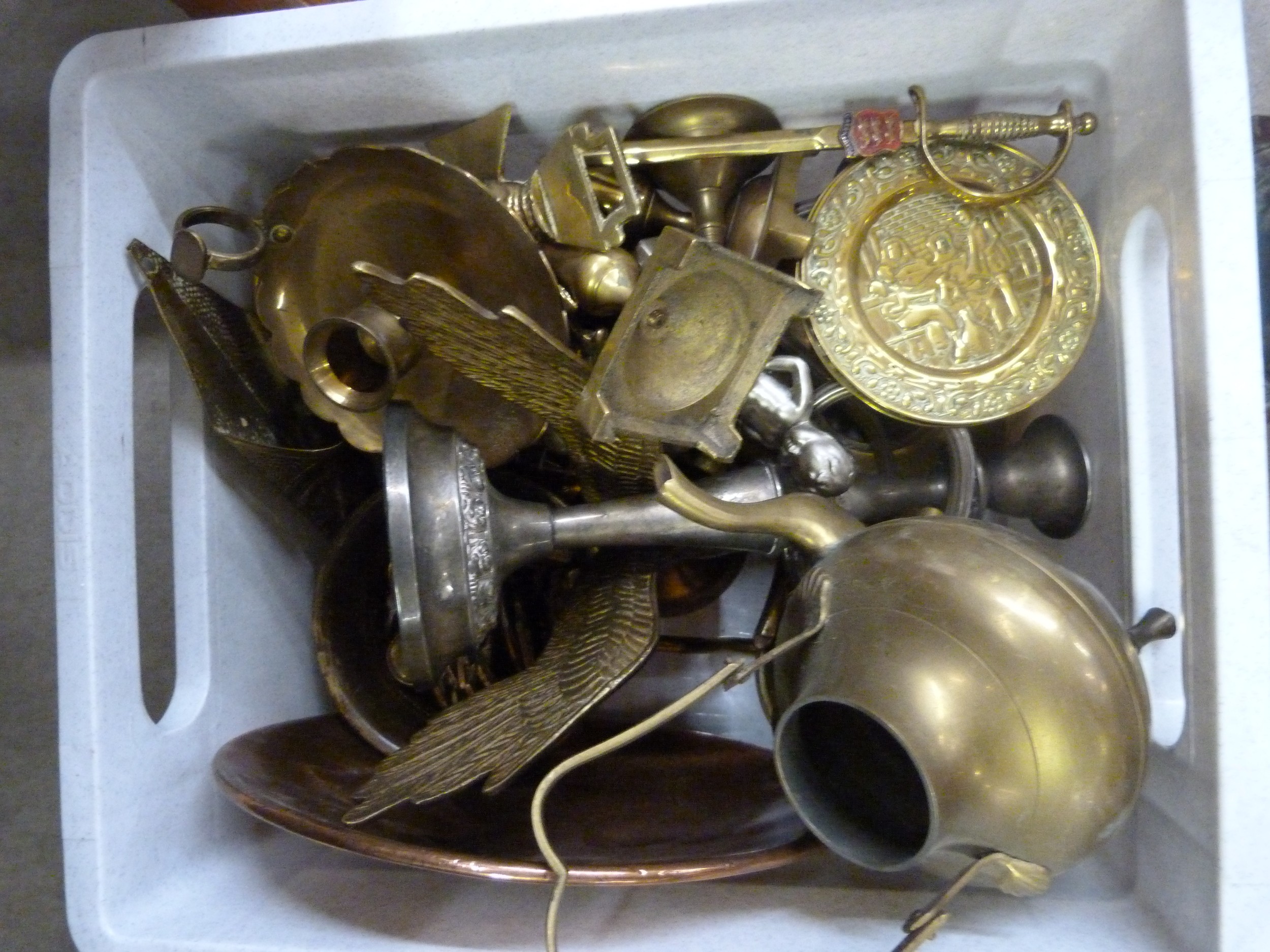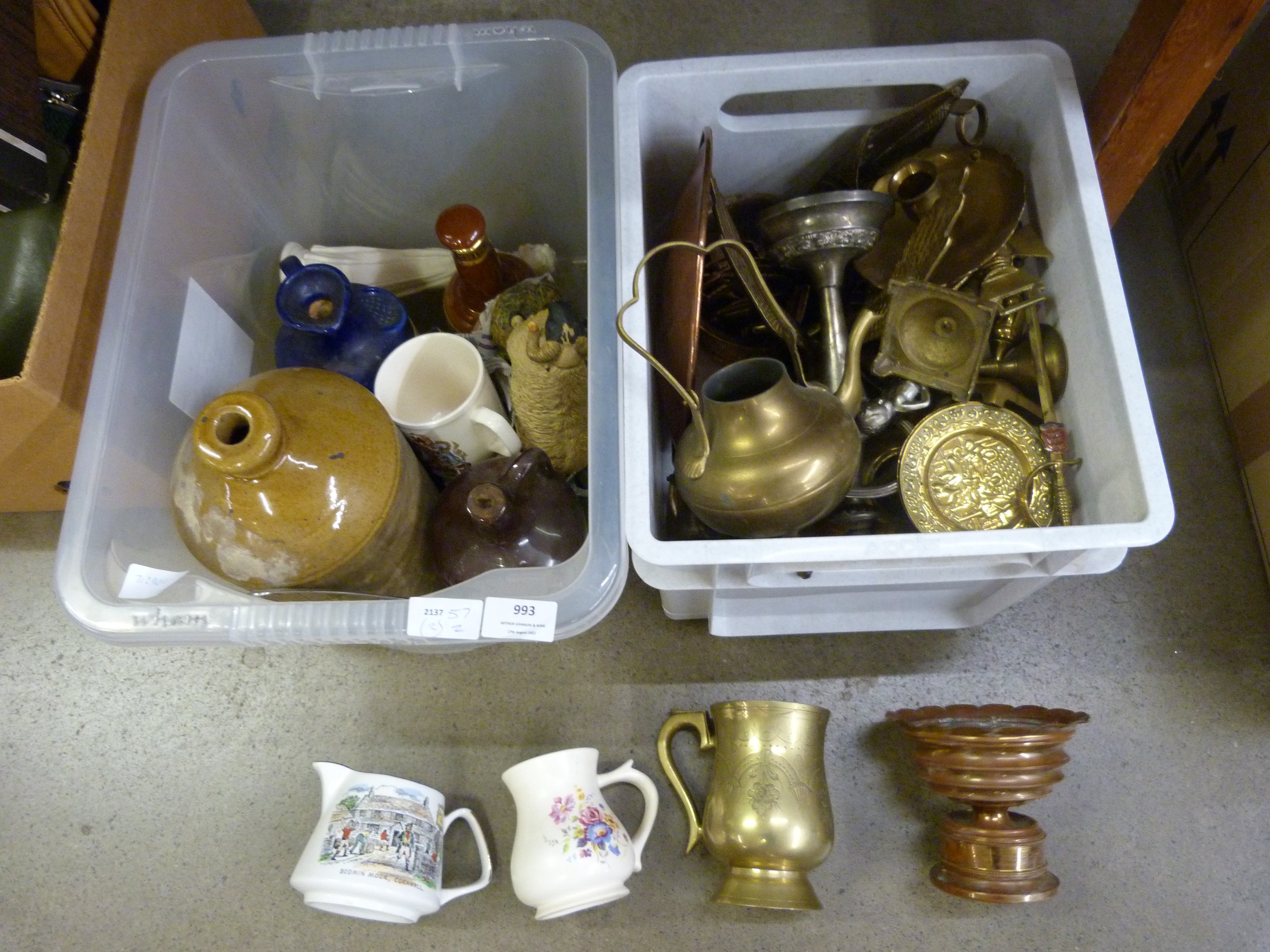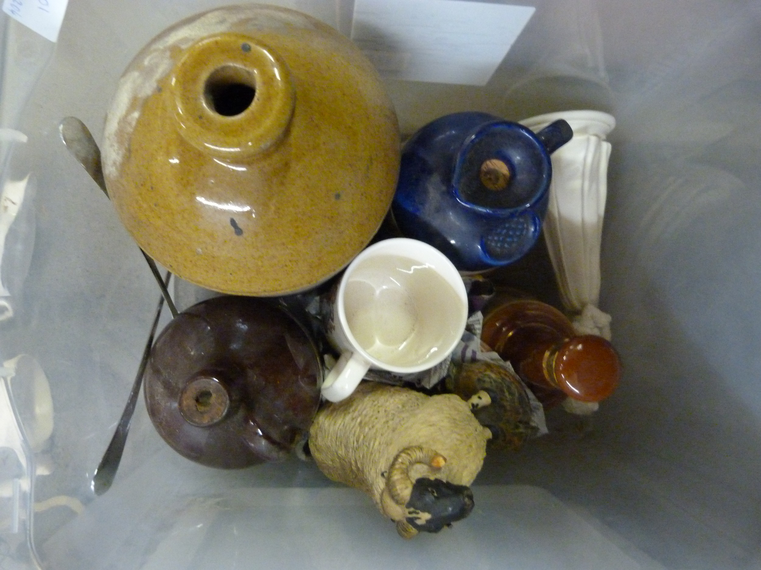 A box of metalware and a box with a stoneware bottle, two whisky decanters, etc. **PLEASE NOTE THIS LOT IS NOT ELIGIBLE FOR POSTING AND PACKING**