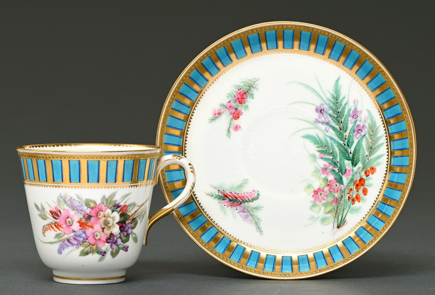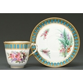 A Royal Worcester teacup and saucer, c1875, painted with wild flowers and leaves in a gilded and bleu celeste border, saucer 13.5cm diam, indistinct impressed mark