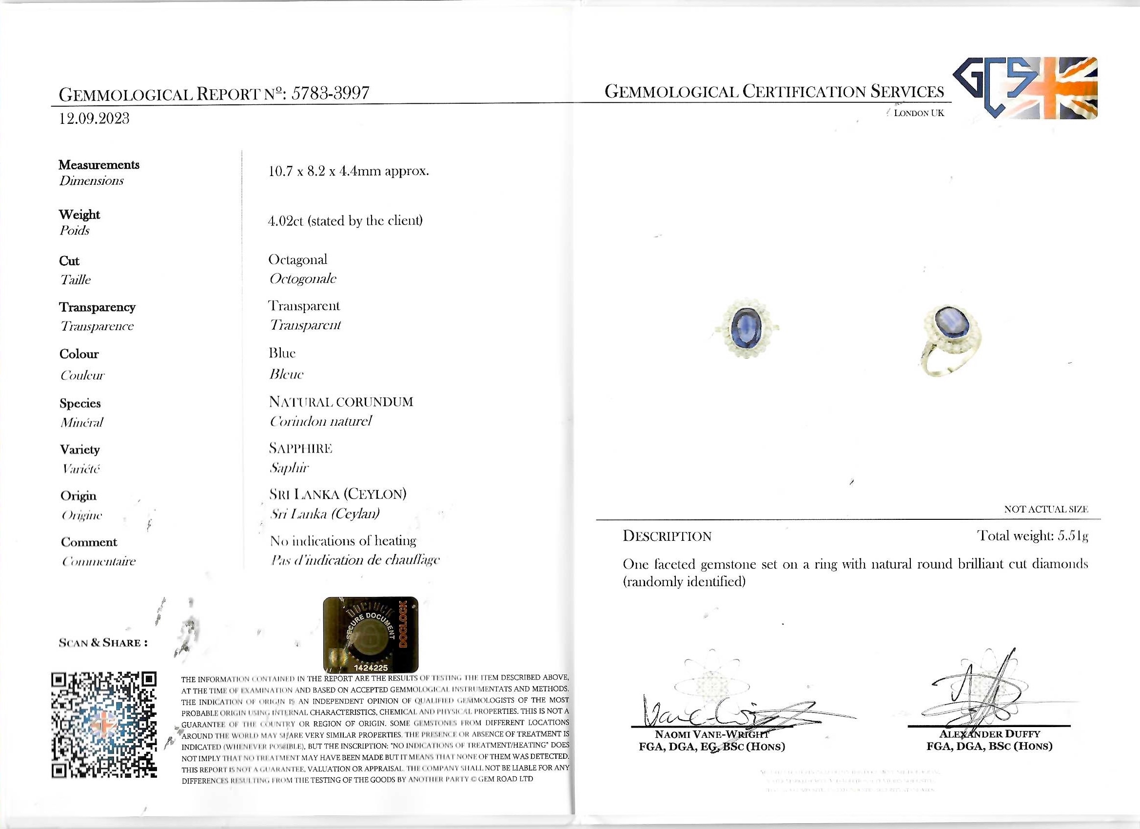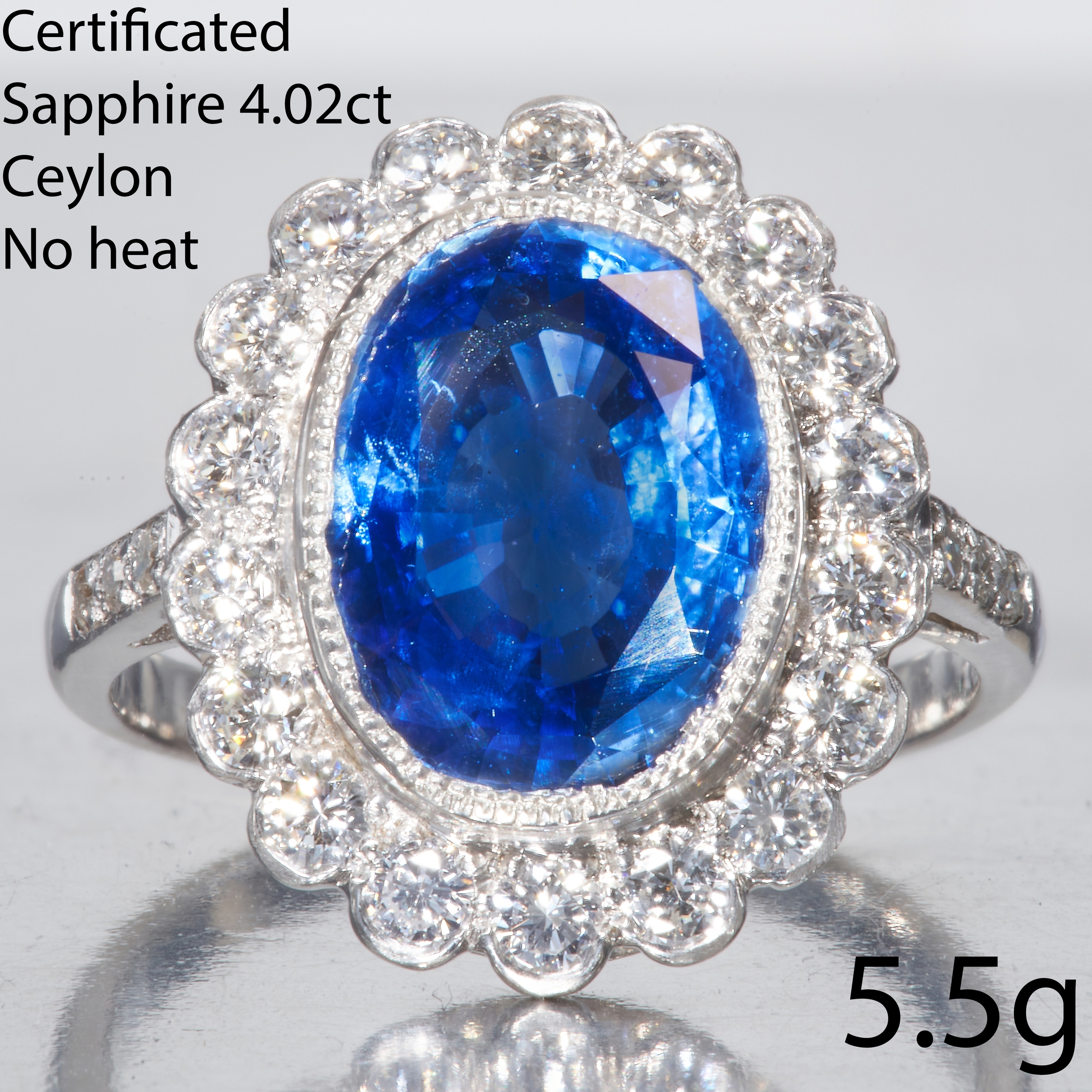 CERTIFICATED CEYLON NO HEAT SAPPHIRE AND DIAMOND CLUSTER RING,