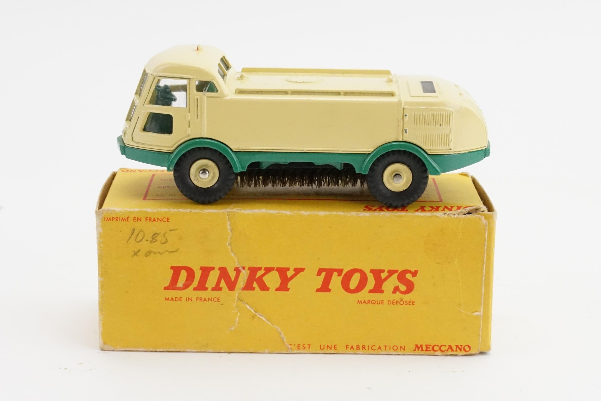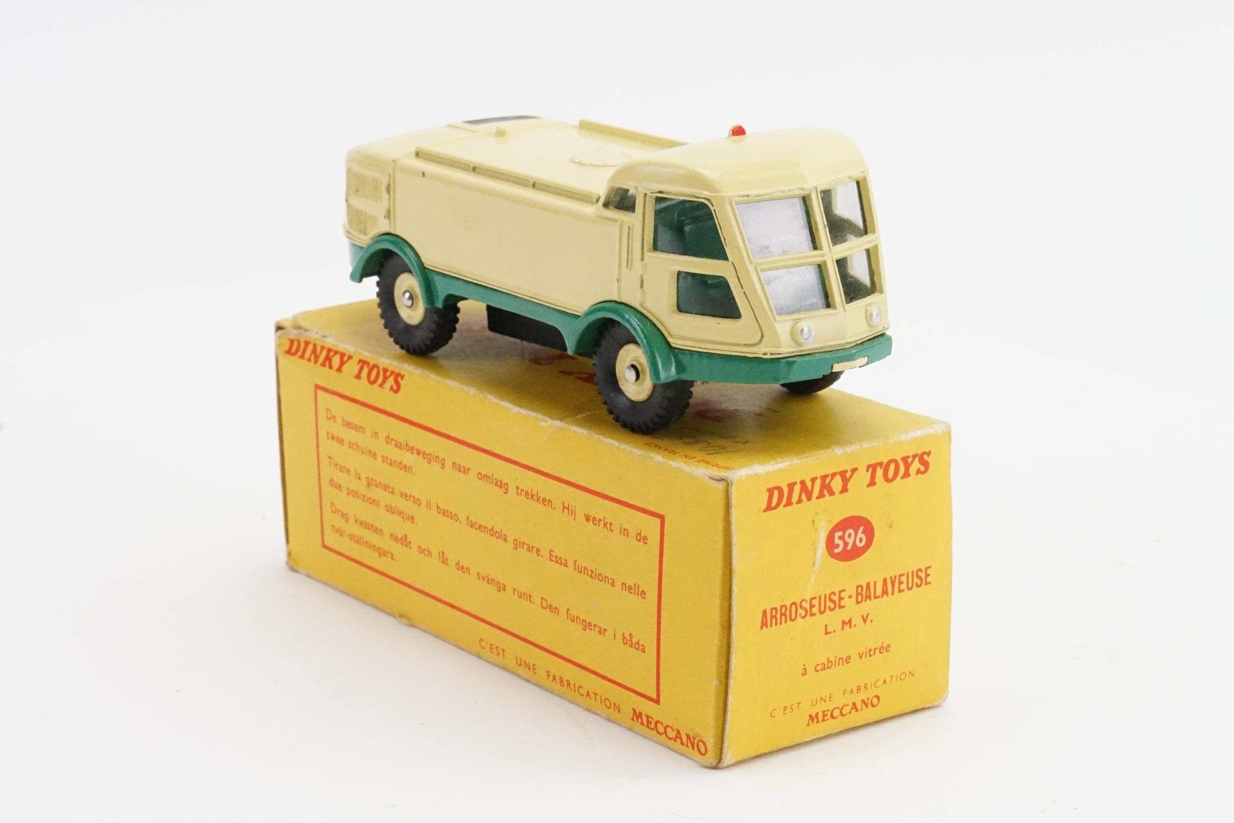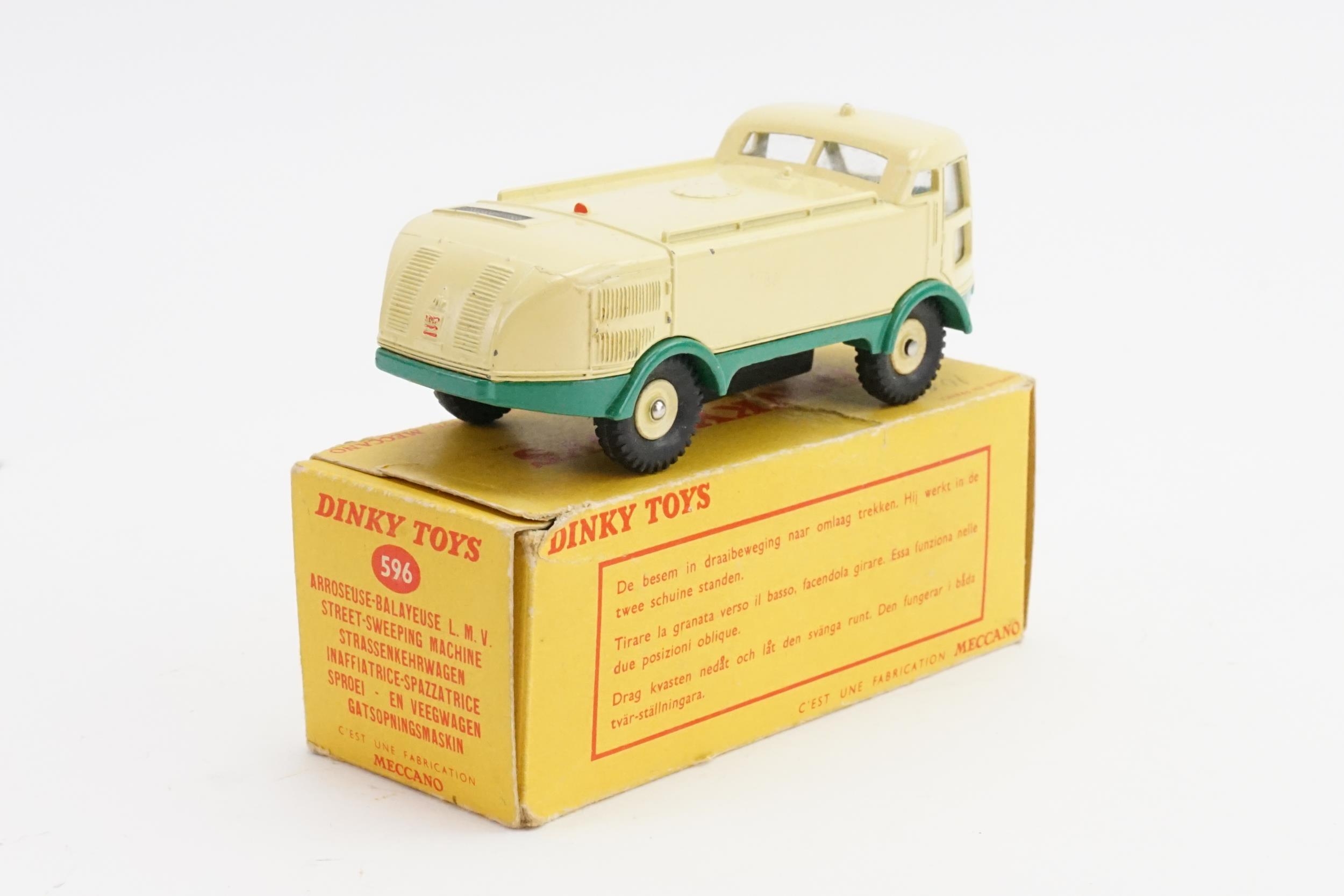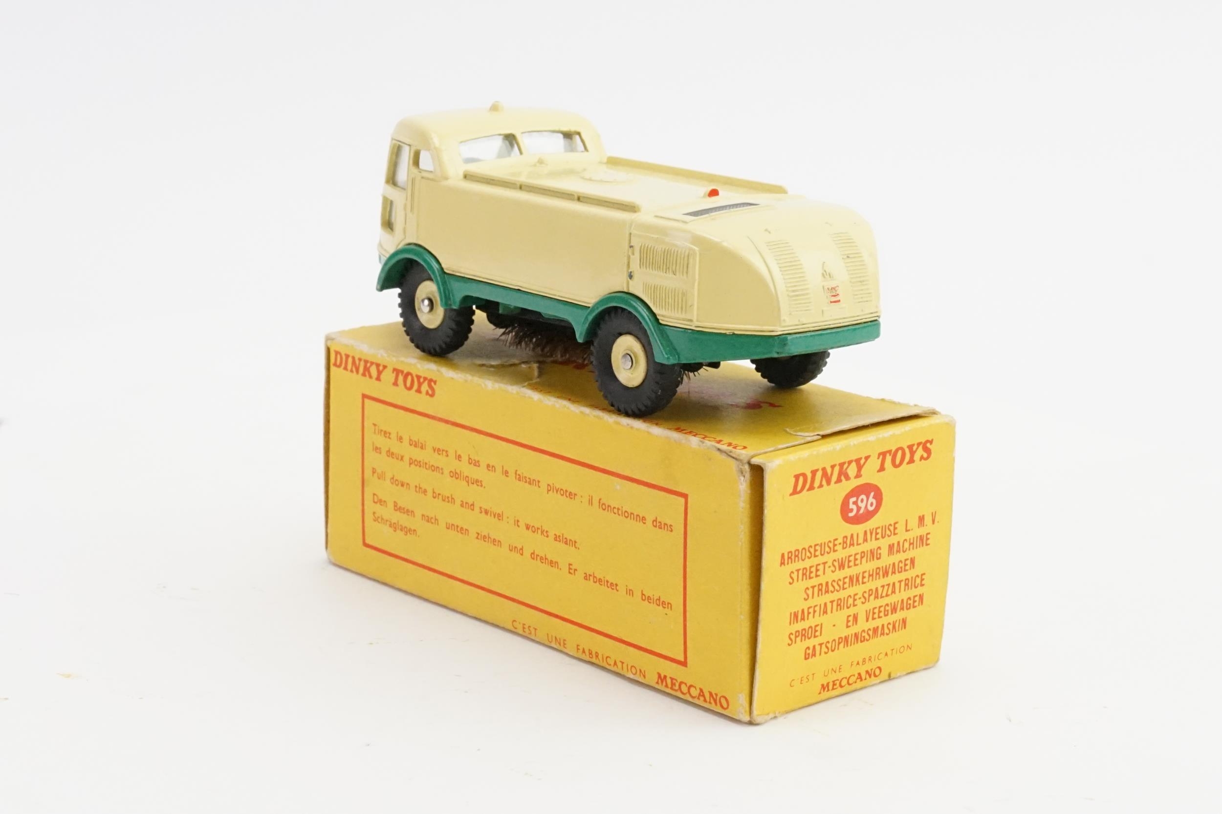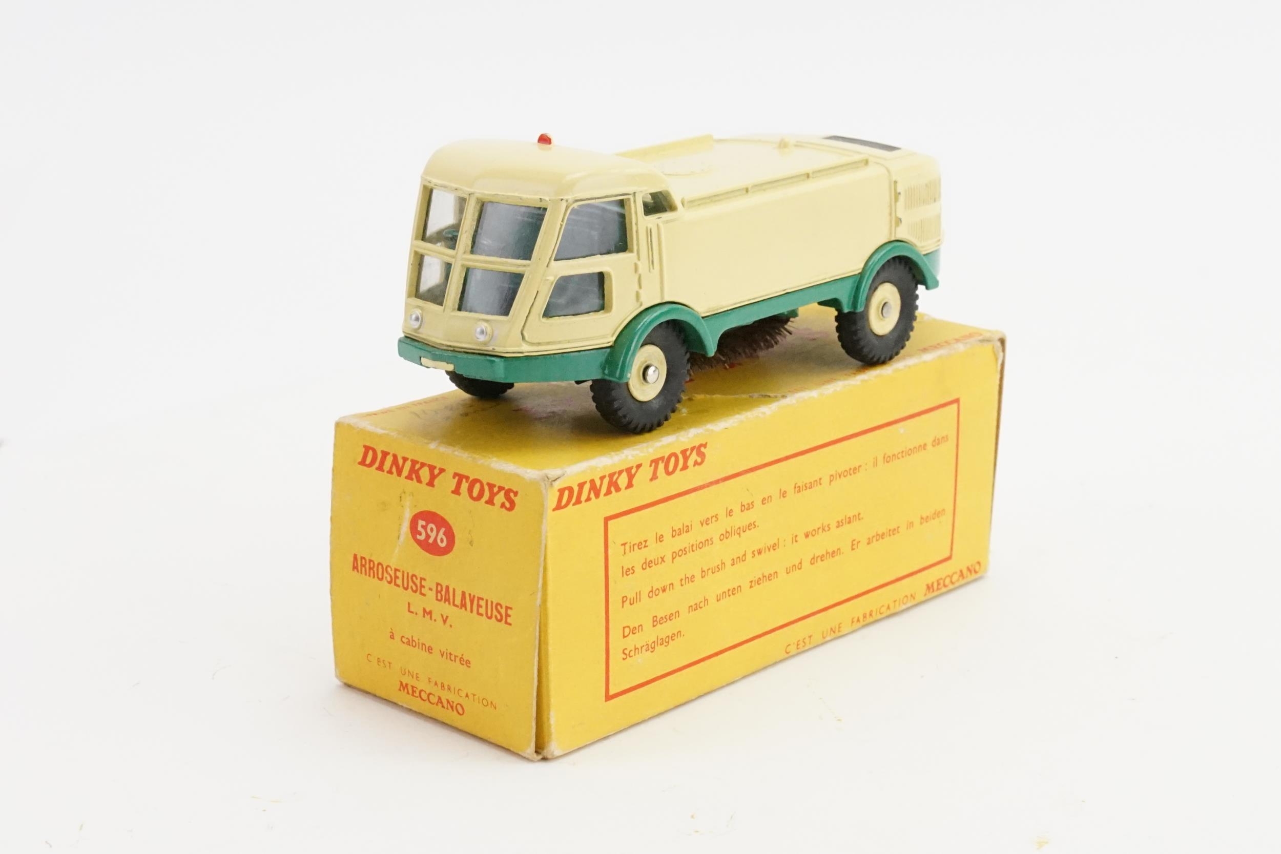A French Dinky Toys No: 596 "Arroseuse-Balayeuse Road Sweeper" finished in Cream & Green with Cream Hubs & Treaded Tyres. The model iis in Very Near Mint Original Condition & comes in a Good Original Box.