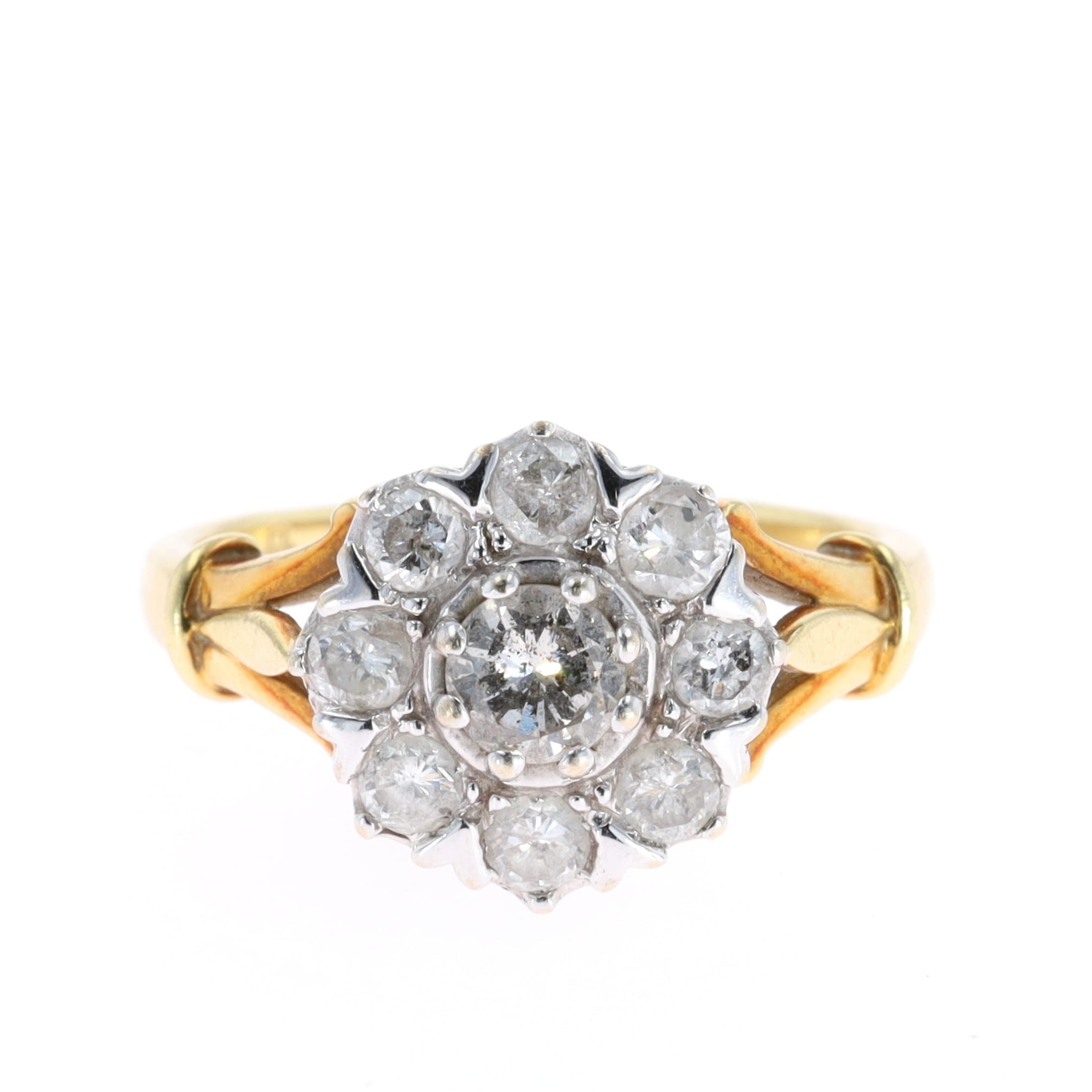 Diamond 18ct Gold Floral Cluster Ring. This piece is hallmarked 750 on the inner band. The ring is a UK size O, weighs in total 5.5g.