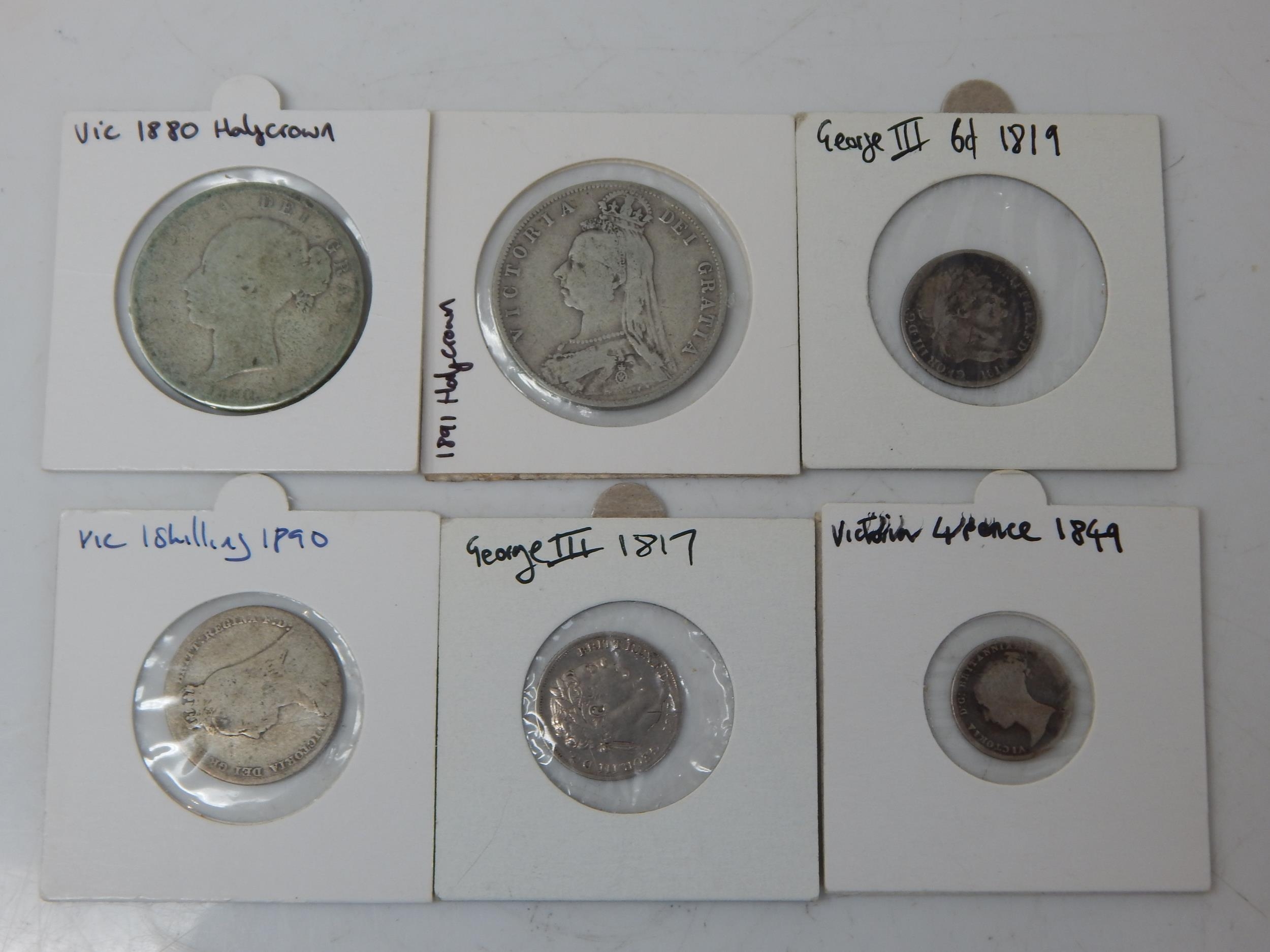 George III Silver Sixpences 1817, 1819; Victoria Silver Groat 1849; Victoria Young Head Silver Halfcrown 1880, Victoria Jubilee Head Silver Halfcrown 1891, Victoria Silver Shilling 1890 (lot)