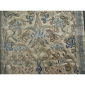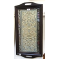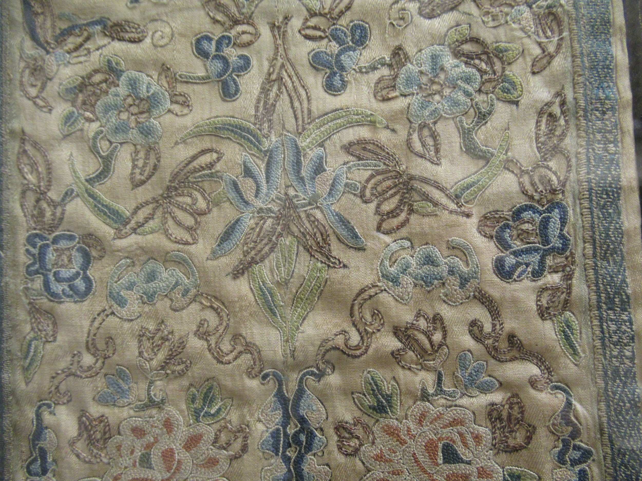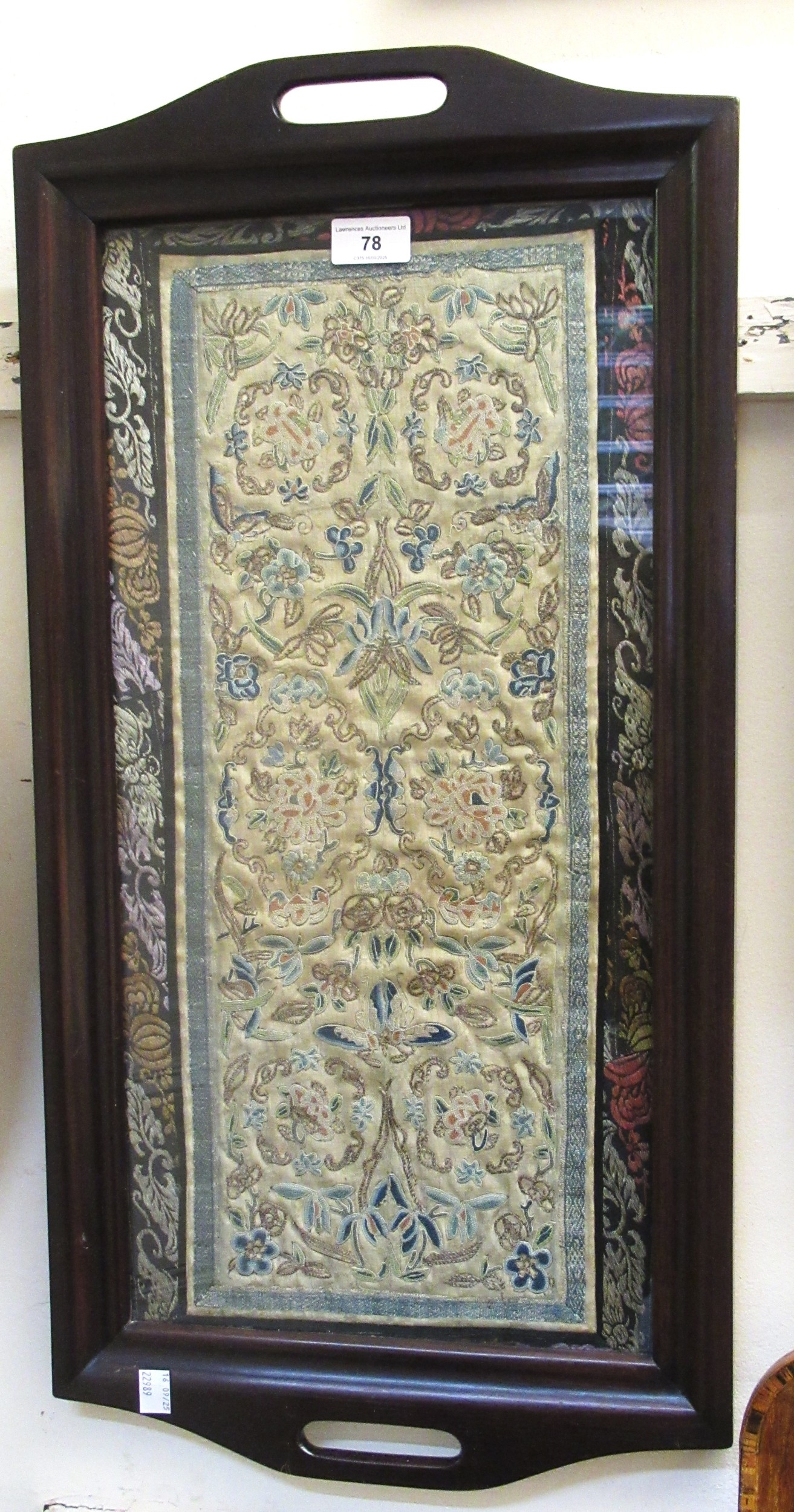 Pair of Chinese silkwork sleeve panels decorated with various flowers, stitched and mounted as one panel, 55 x 27cm, in a wooden two handled tray mount, 69 x 35cm overall tray size