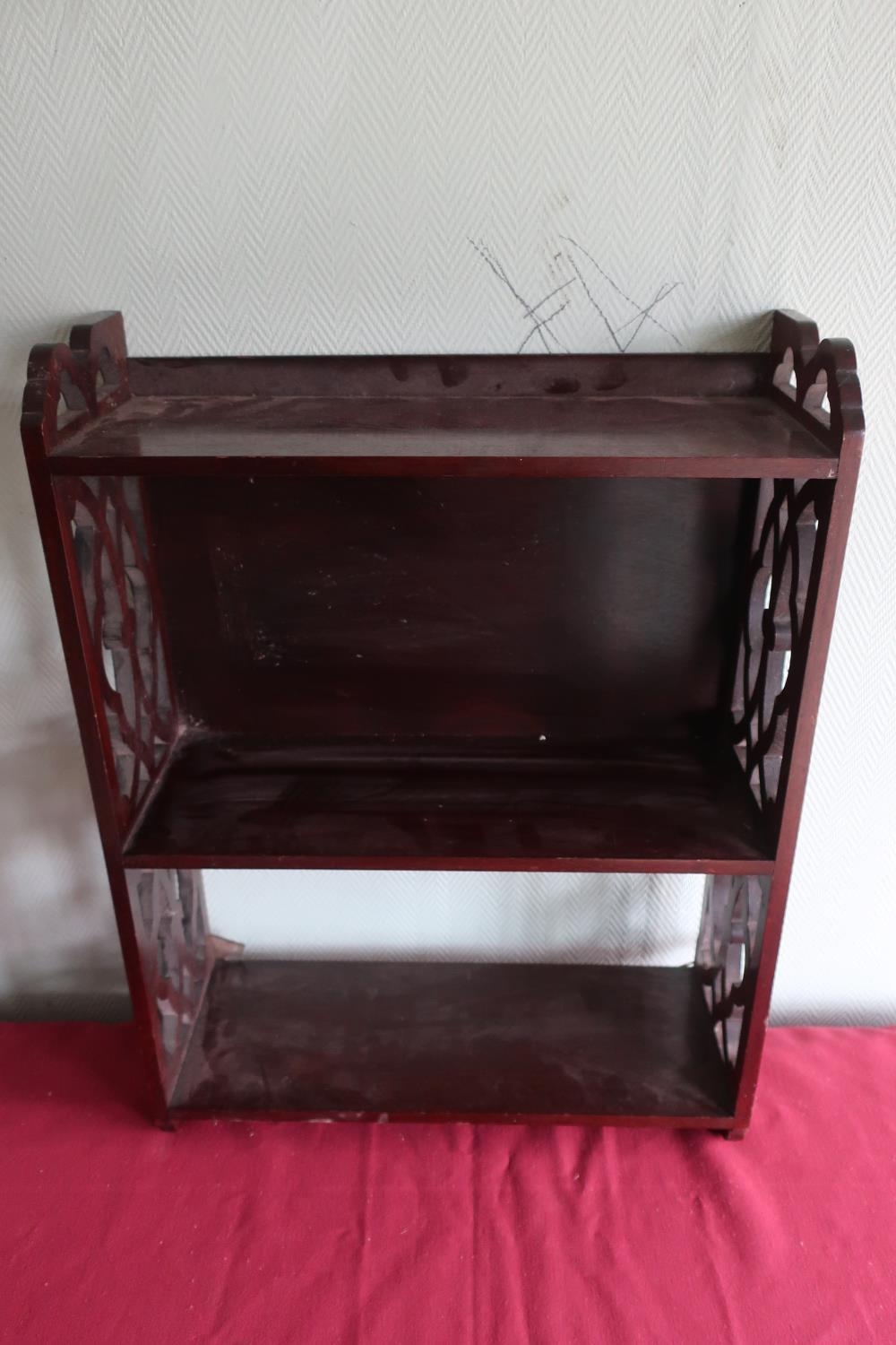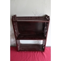 Edwardian mahogany three tier wall shelf with fretwork sides, W41.5cm D15cm H55cm