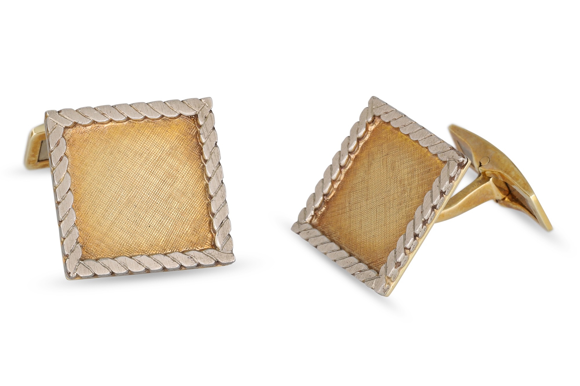 A PAIR OF 1970'S CUFFLINKS, of square form, mounted in 14ct white gold, with box, 16 g
