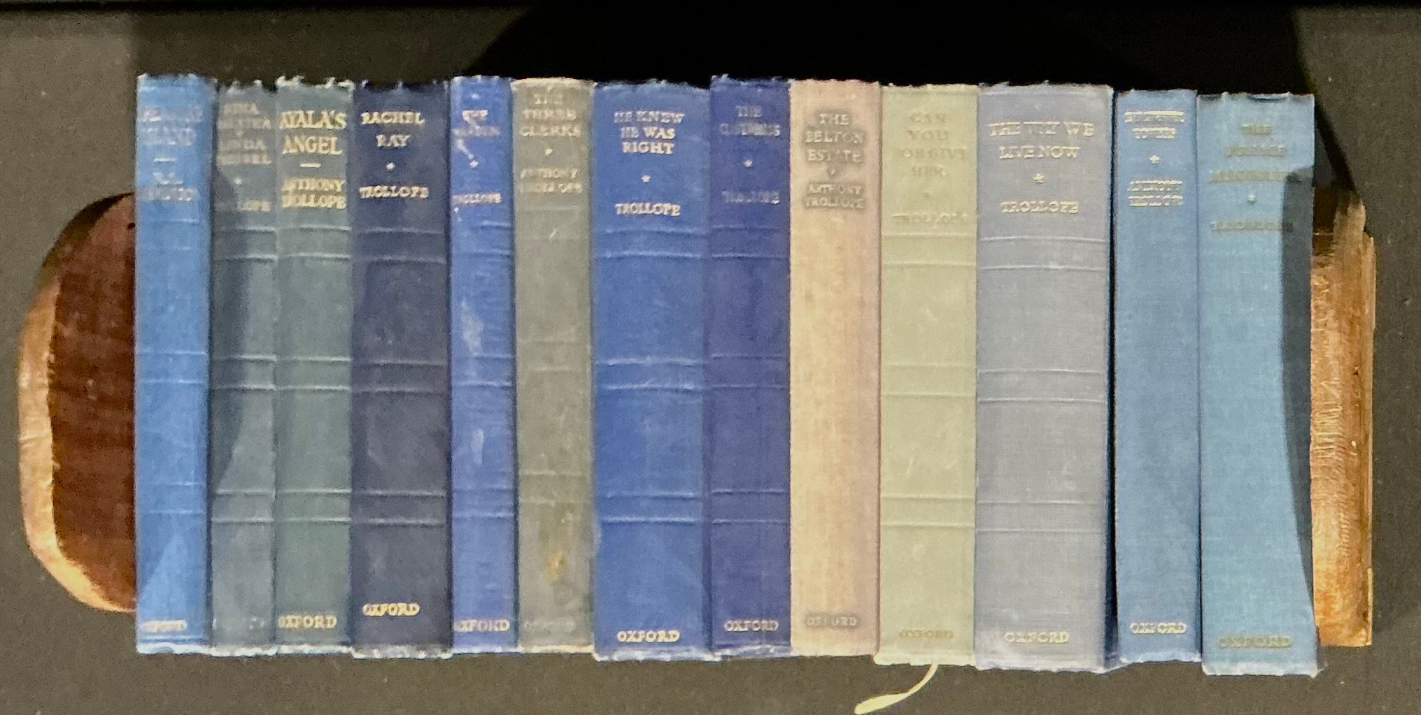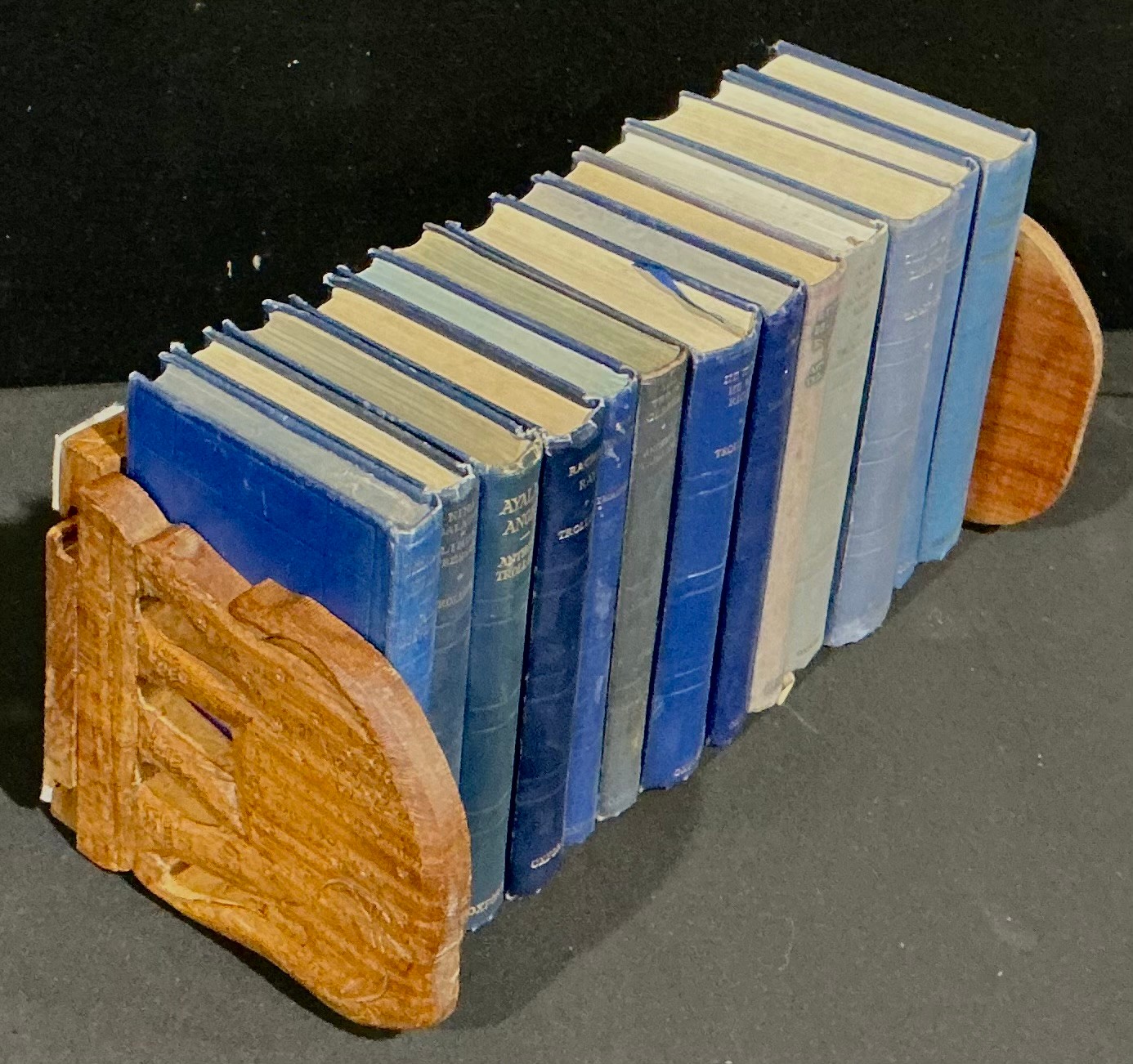 Literature – Trollope (Anthony 1815-1882): 12 approximately uniform vols. Oxford, University Press the World’s Classics, 1951 and other dates, 16mo, bound embossed blue boards, gilt titles to spines: Ayala’s Angel, Barchester Towers, Can You Forgive Her? He Knew He was Right, Nina Balatka and Linda Tressel, Rachel Ray, The Belton Estate, The Claverings, The Prime Minister, The Three Clerks, The Warden & The Way we Live Now, also Stevenson, R. L. Treasure Island, bound en suite, all on/with an early 20th century carved teak sliding book rack, the hinged endpieces modelled as Indian elephants 13 x 5 in (23 x 12.5cm) (qty)