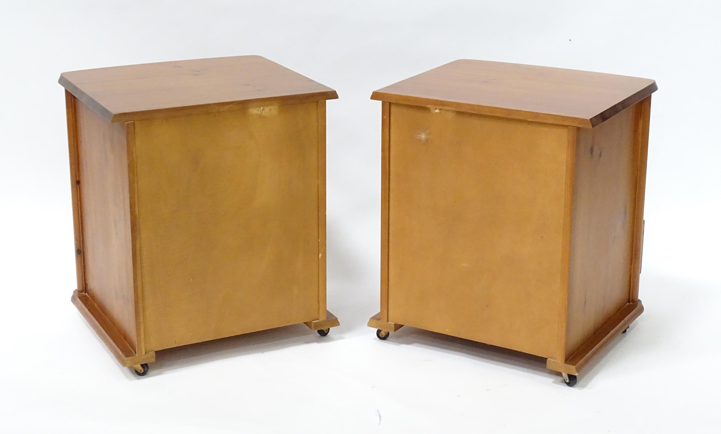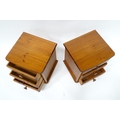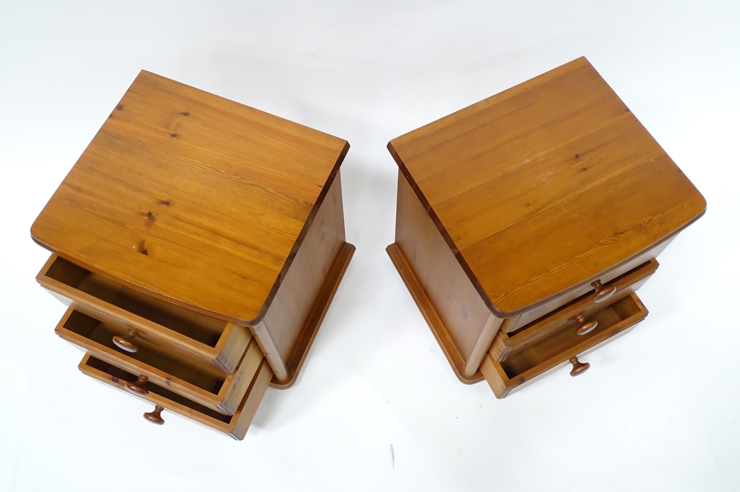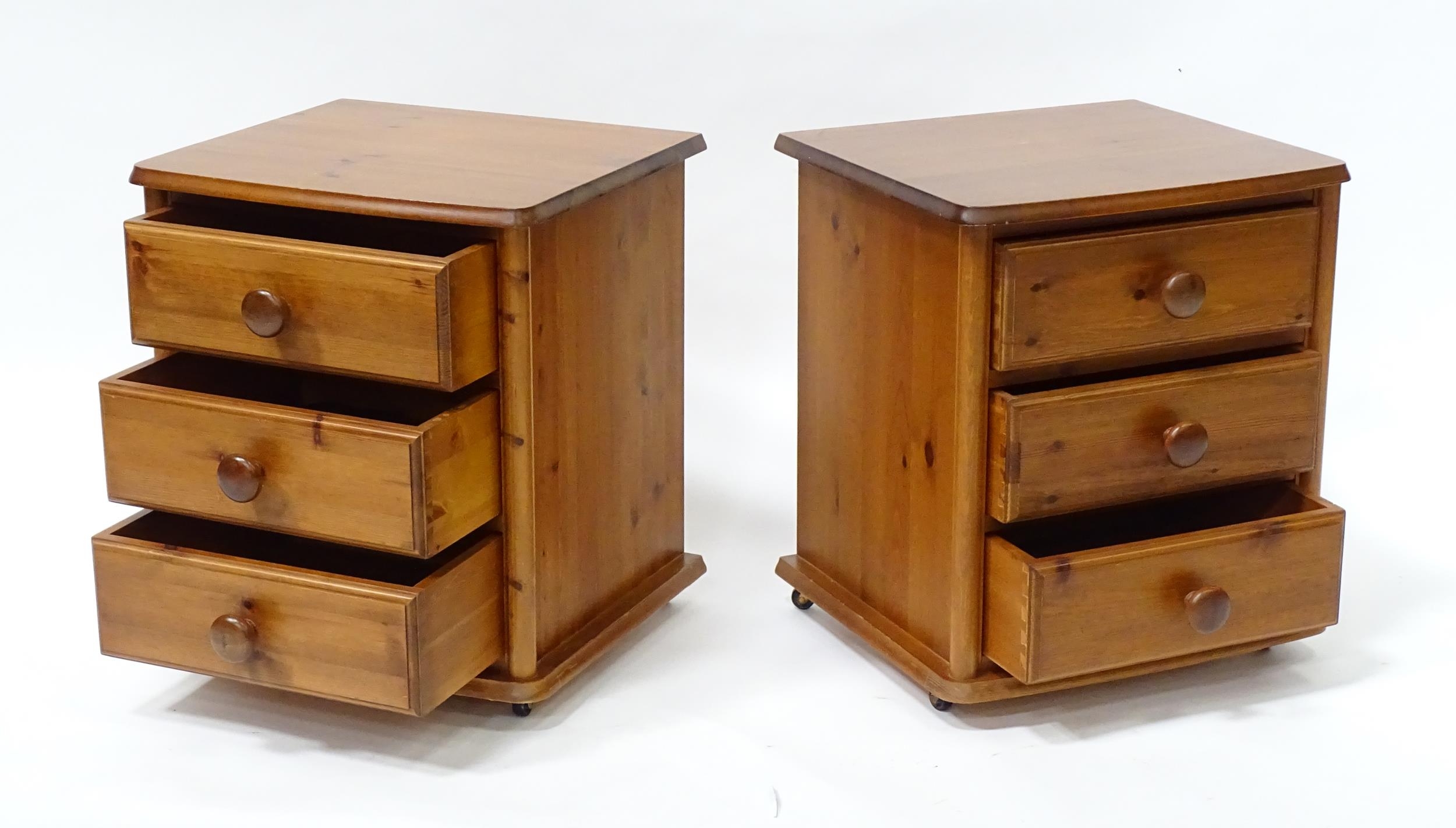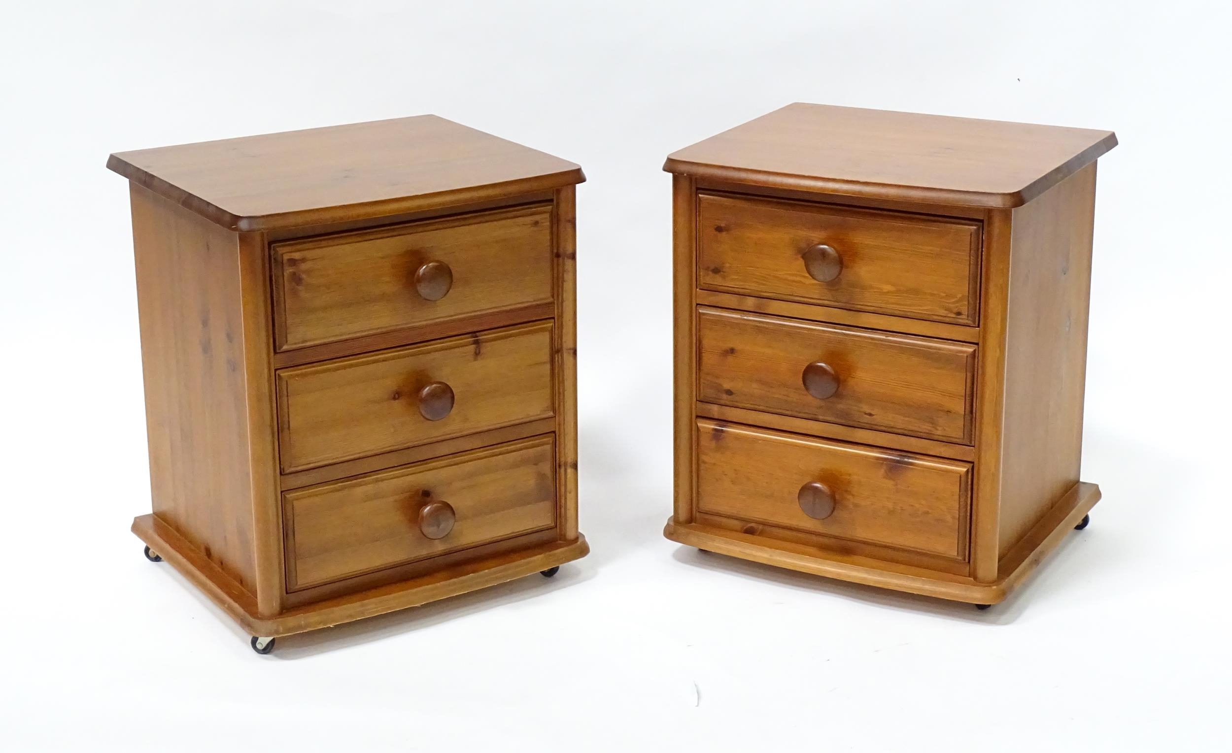 A pair of pine bedside cabinets, each with three drawers with turned wooden handles. 18" wide x 17" deep x 22" high.