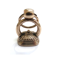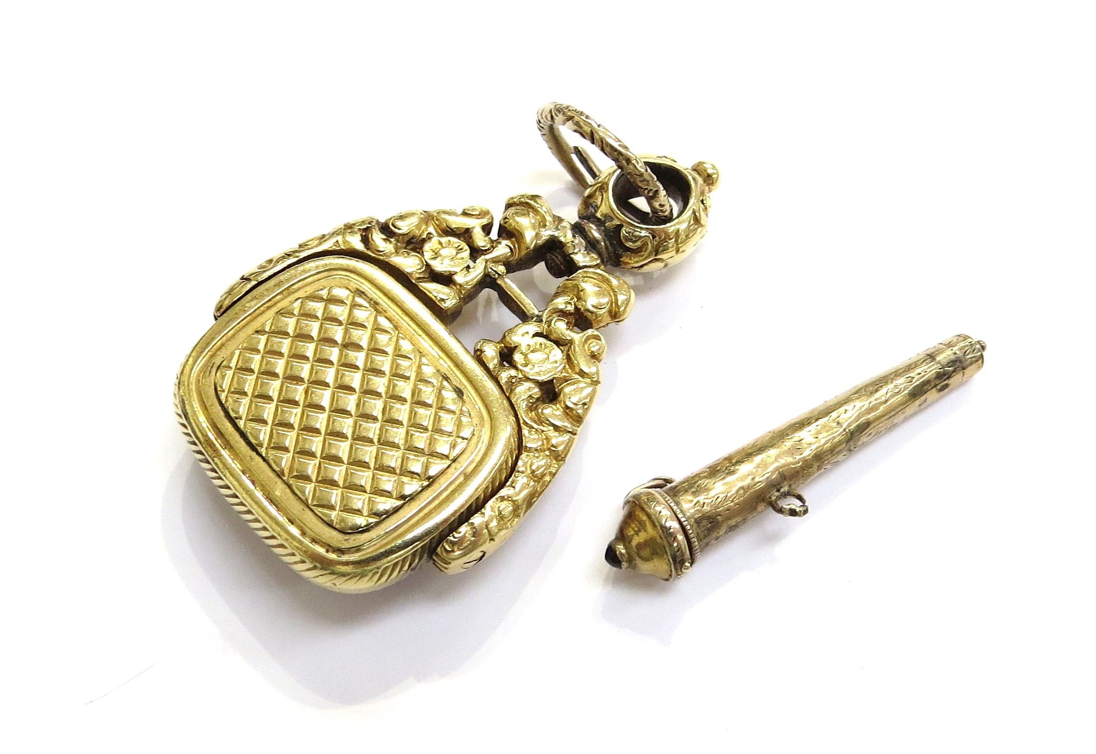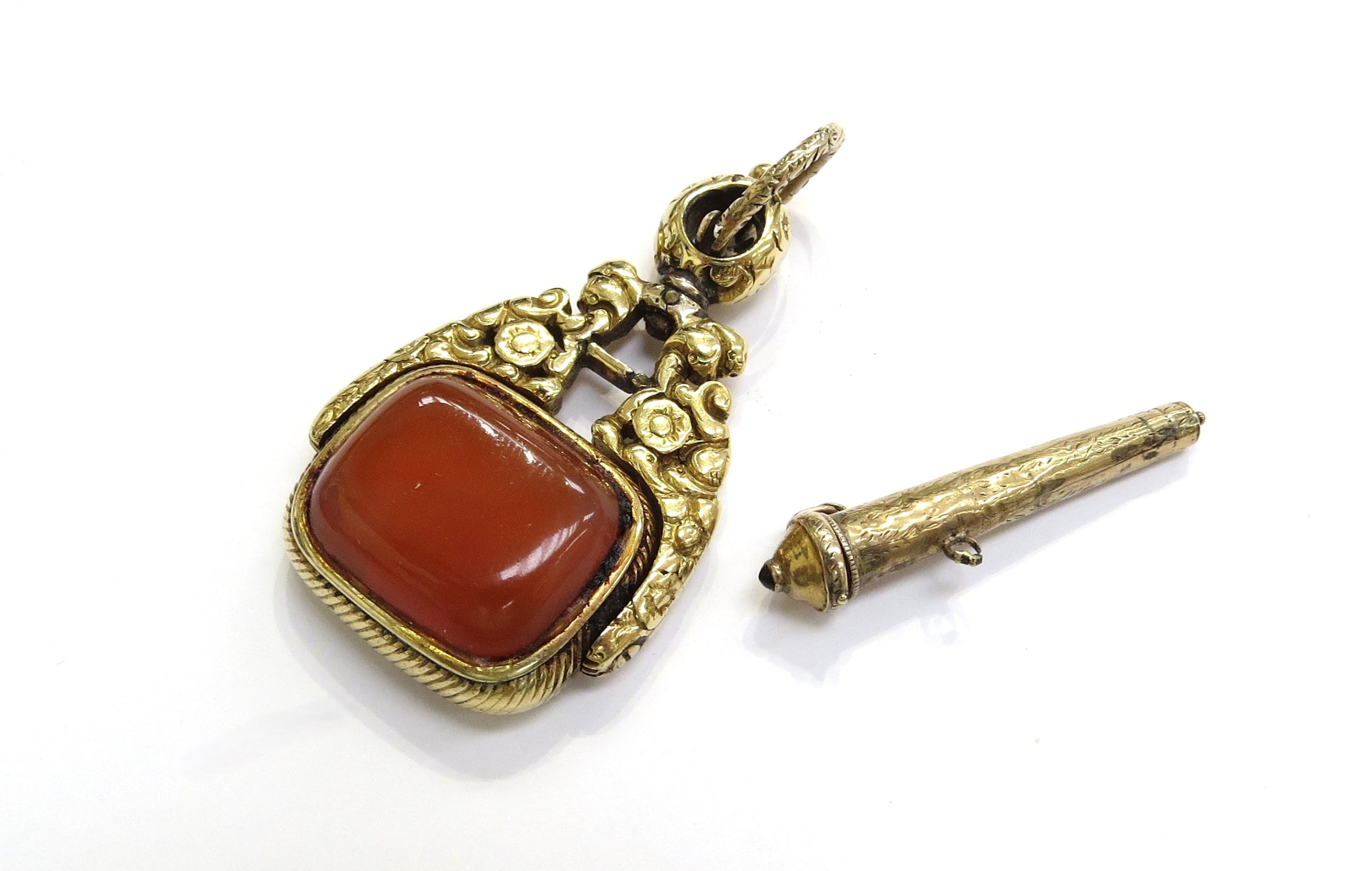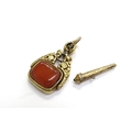 A Georgian swivel fob with cornelian panel and a cone shaped lidded vessel charm