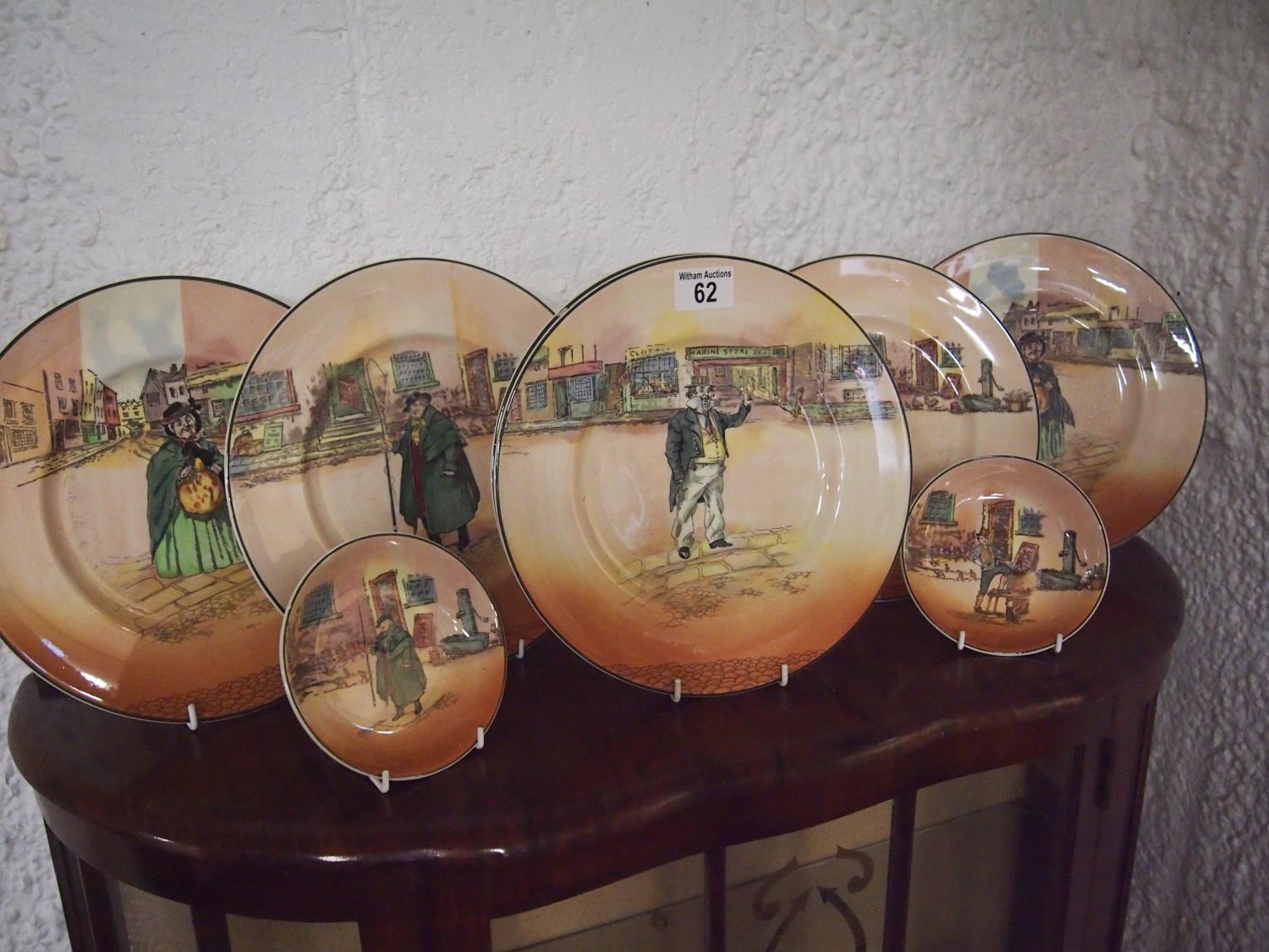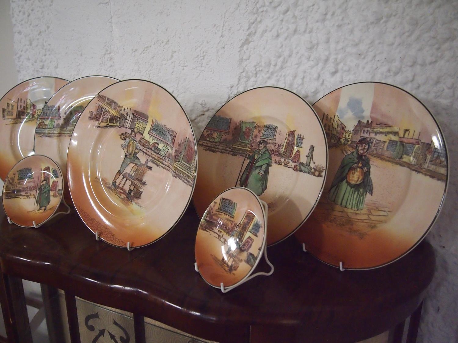 Royal Doulton Dicken's ware items, six dinner plates plus two smaller circular dishes