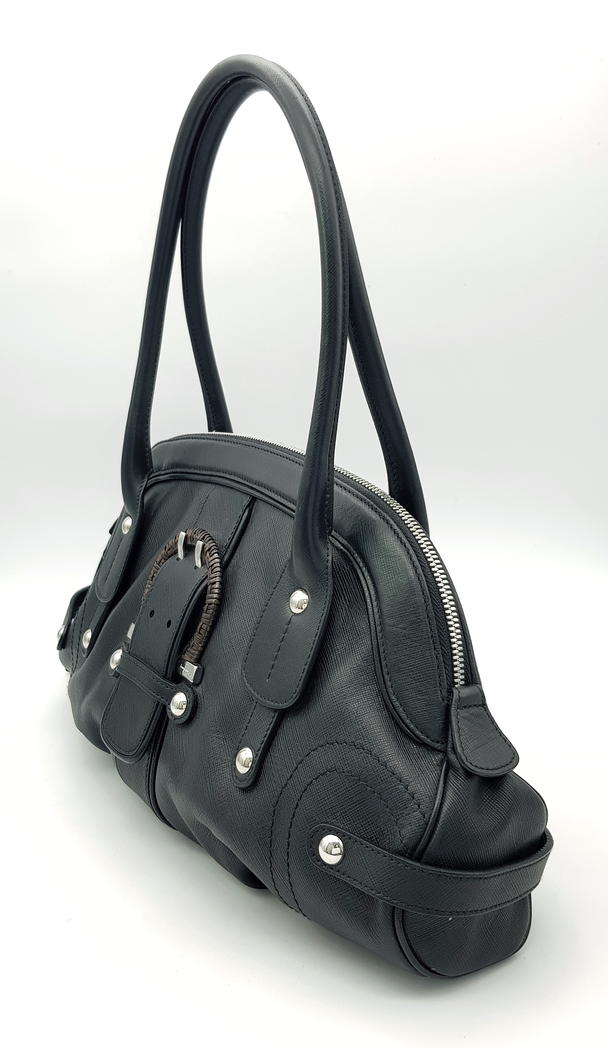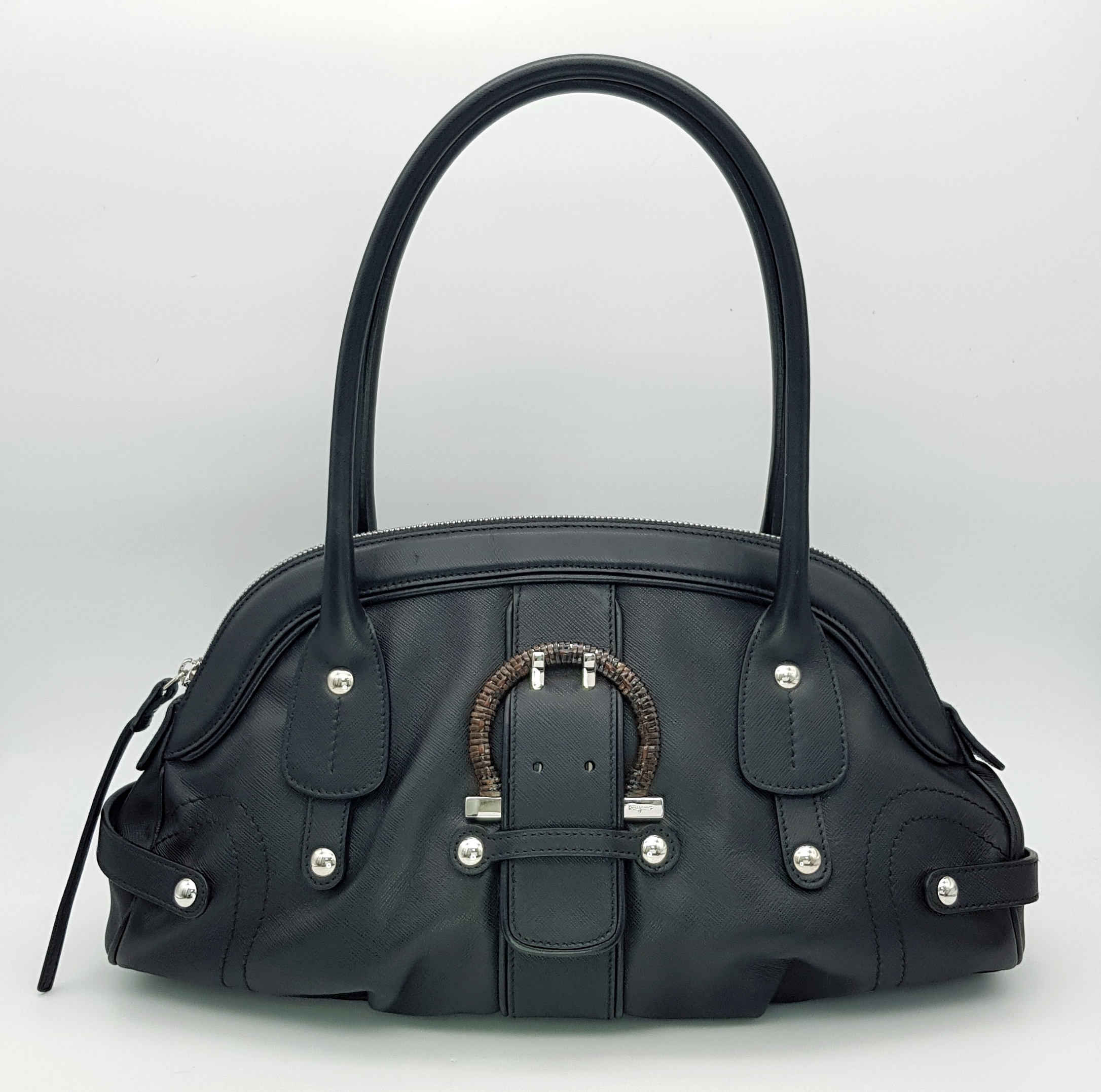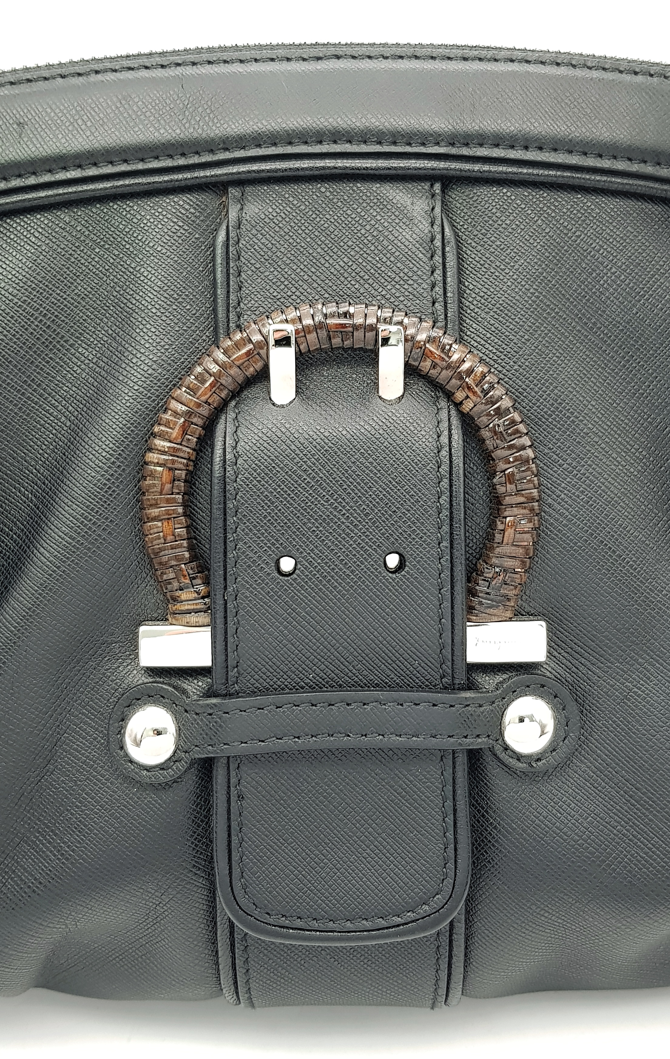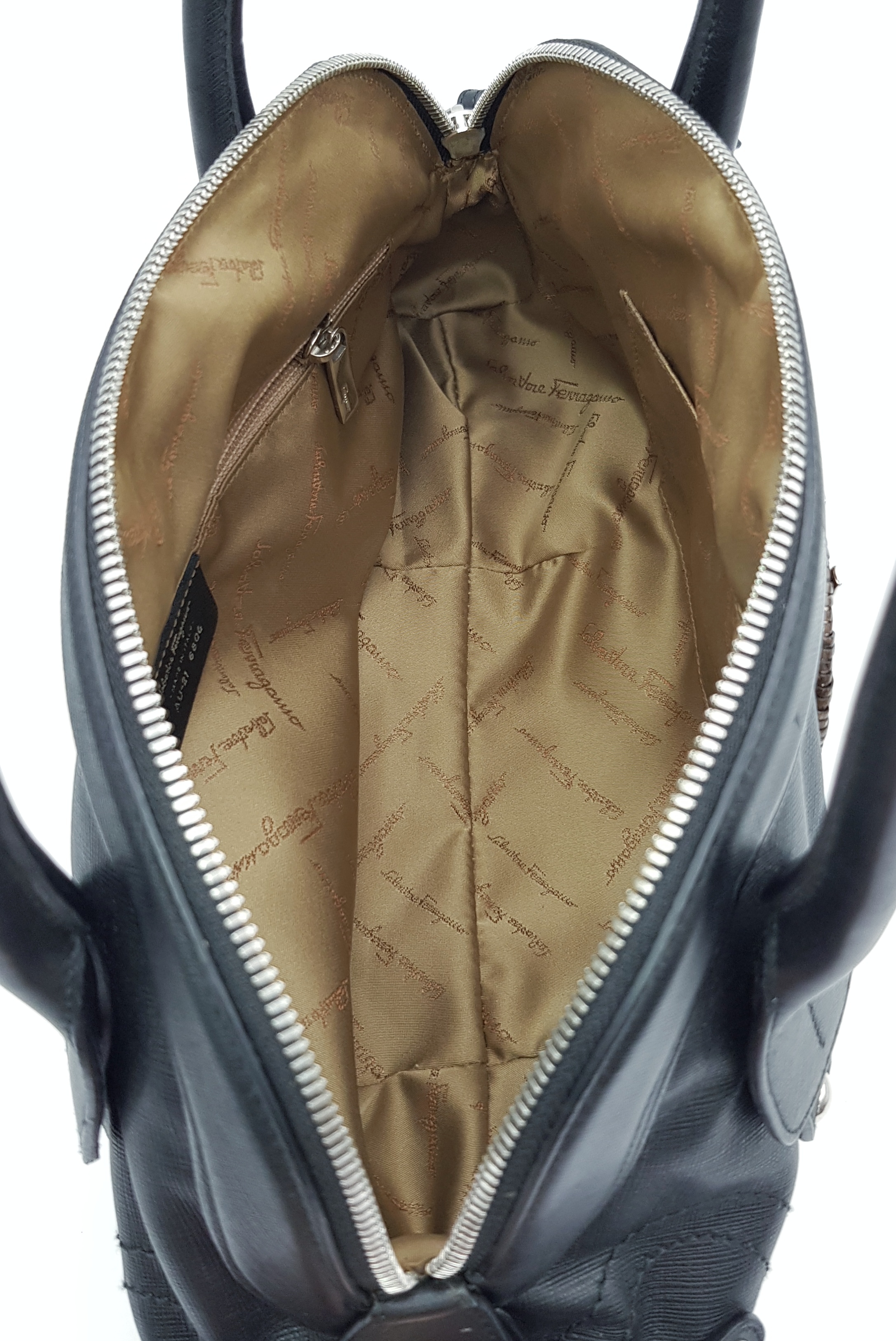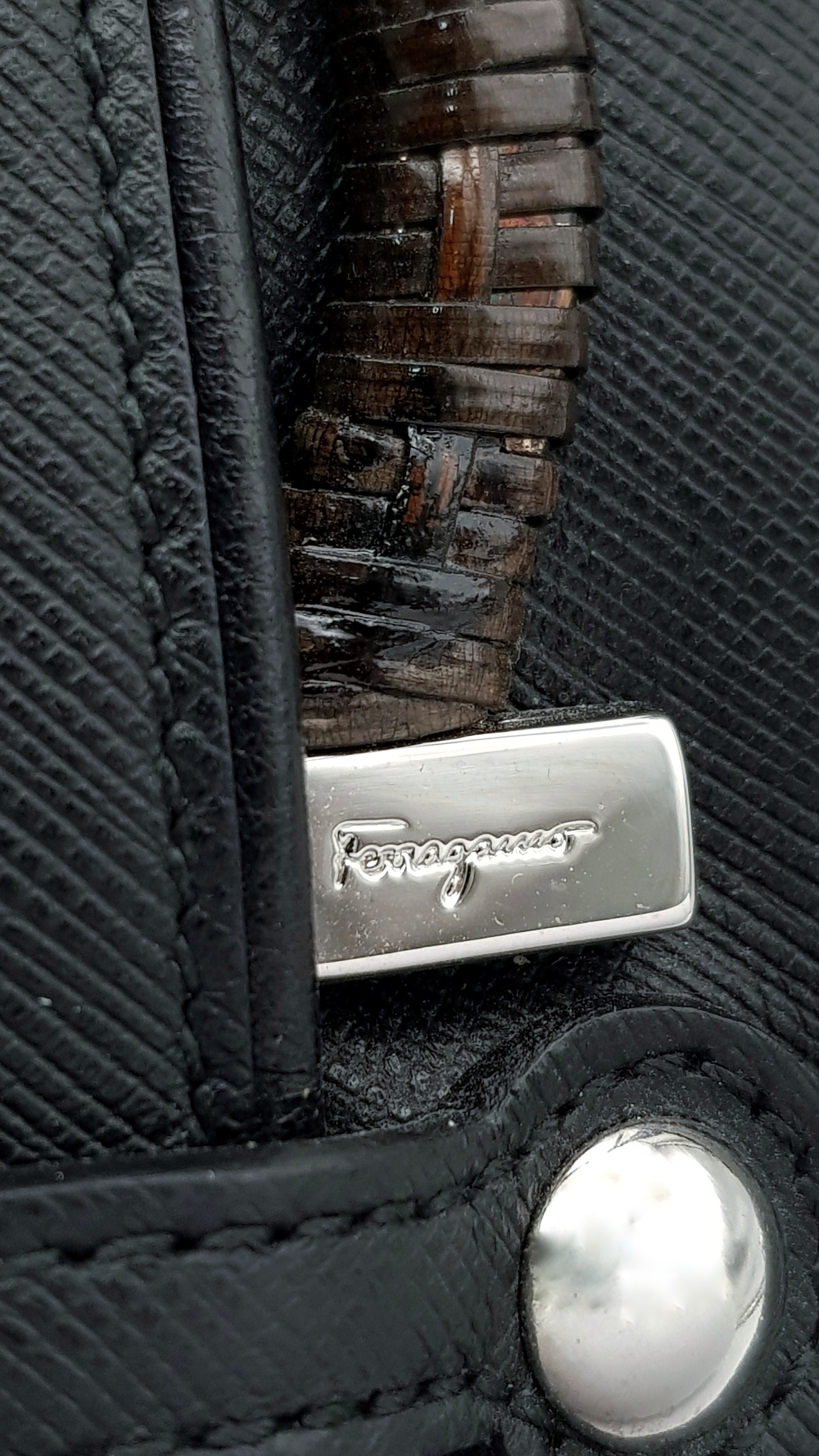 A Salvatore Ferragamo Black Leather Handbag. Crafted in structured black leather with silver-tone hardware, featuring a distinctive front Gancini-inspired buckle detail with woven leather accent. Designed with dual rolled top handles and a zip-top fastening opening to a beige logo jacquard-lined interior, fitted with a zipped pocket and slip compartments. In good overall condition with light signs of use, including minor creasing to the leather and light wear to the interior. Please see photos for details or request a condition report. Measurements: W36 X L23 X D12 cm. Ref: 27513