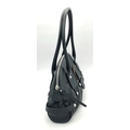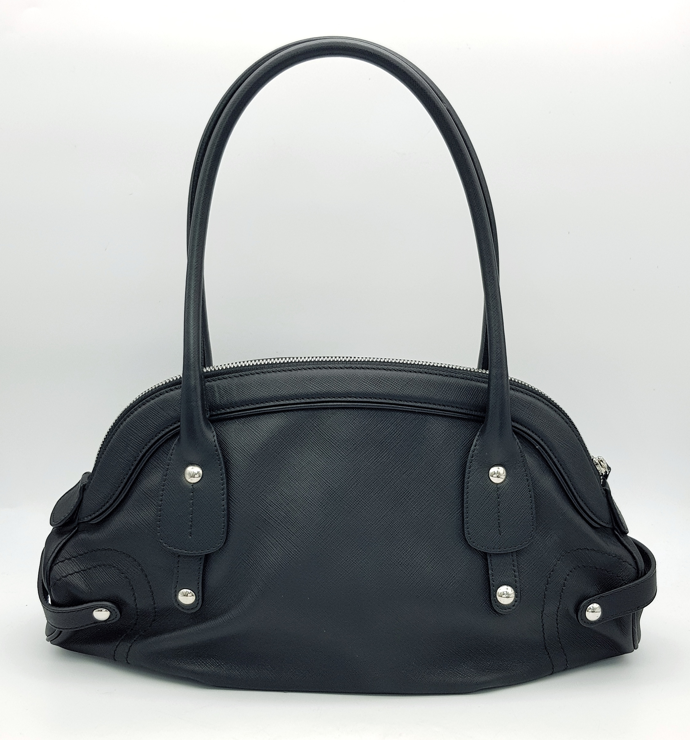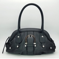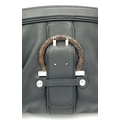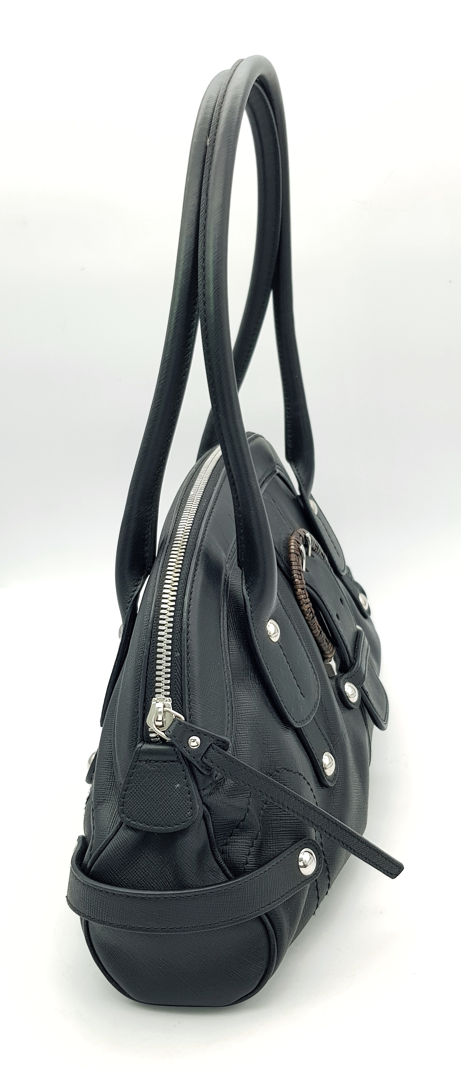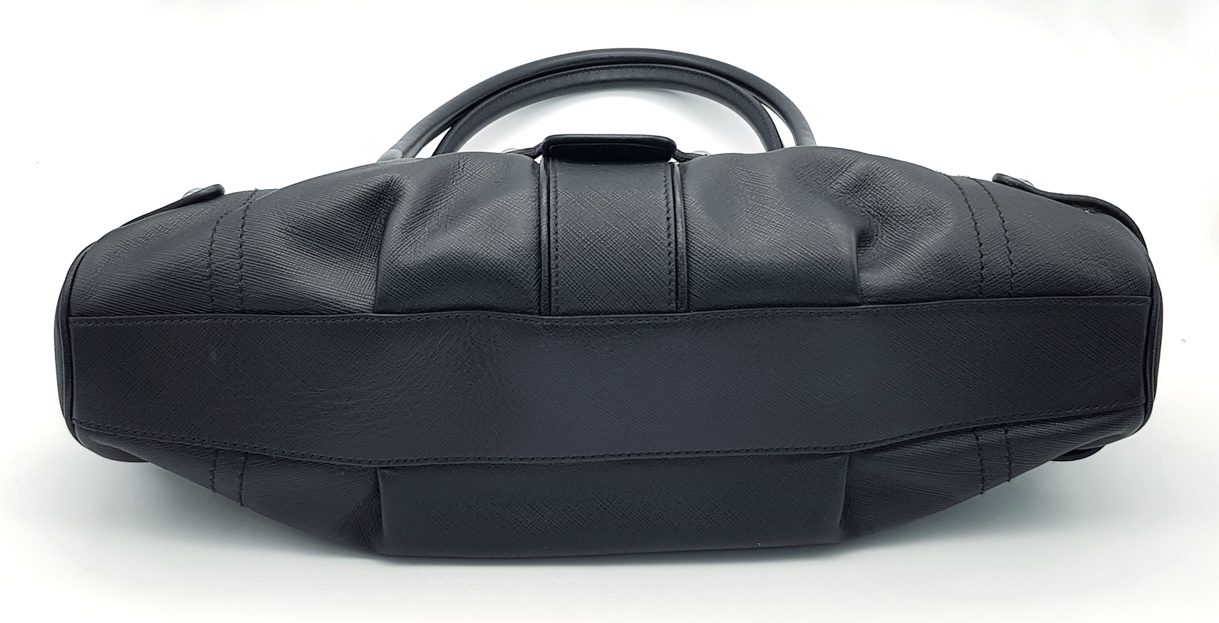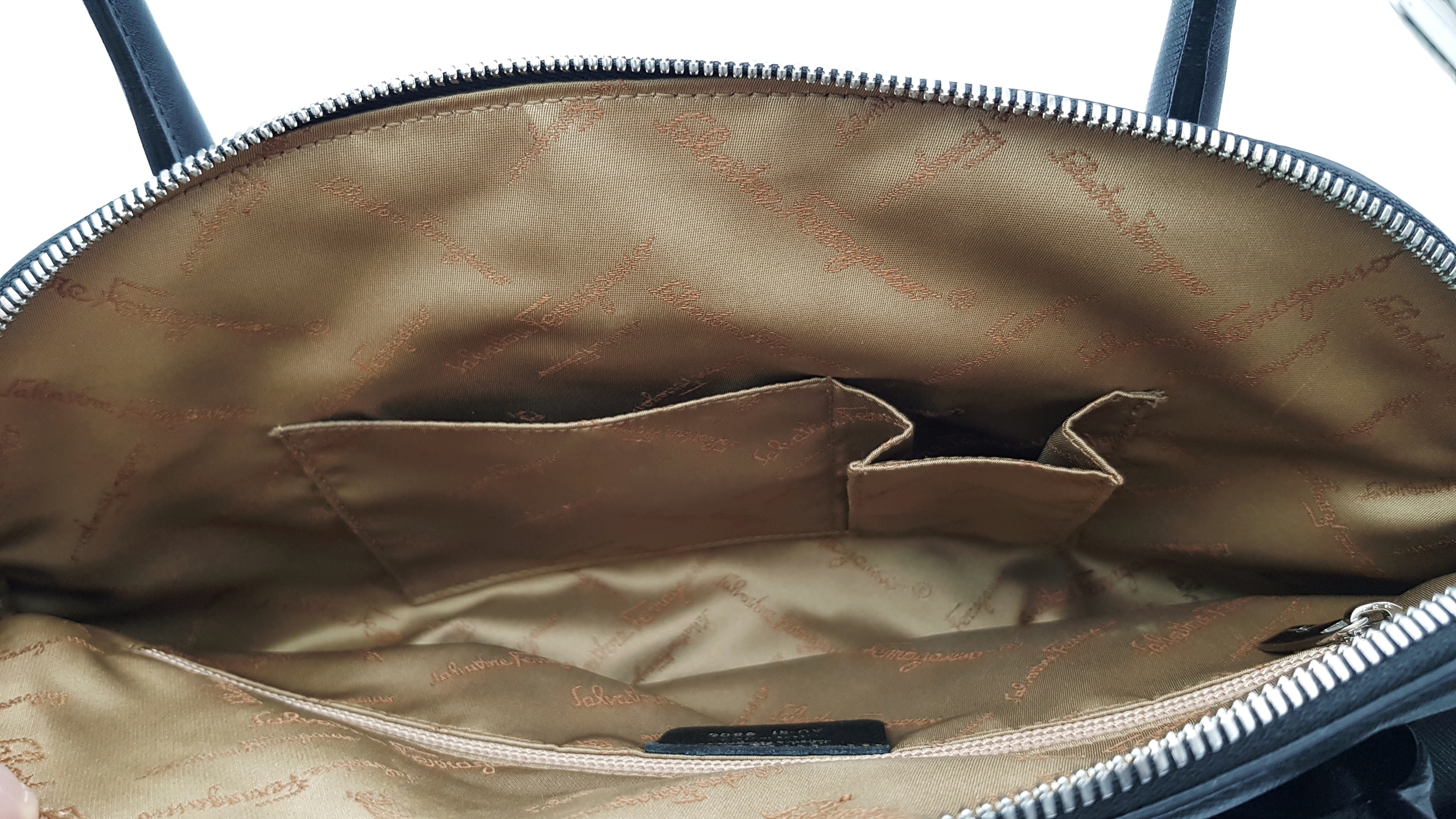 A Salvatore Ferragamo Black Leather Handbag. Crafted in structured black leather with silver-tone hardware, featuring a distinctive front Gancini-inspired buckle detail with woven leather accent. Designed with dual rolled top handles and a zip-top fastening opening to a beige logo jacquard-lined interior, fitted with a zipped pocket and slip compartments. In good overall condition with light signs of use, including minor creasing to the leather and light wear to the interior. Please see photos for details or request a condition report. Measurements: W36 X L23 X D12 cm. Ref: 27513