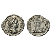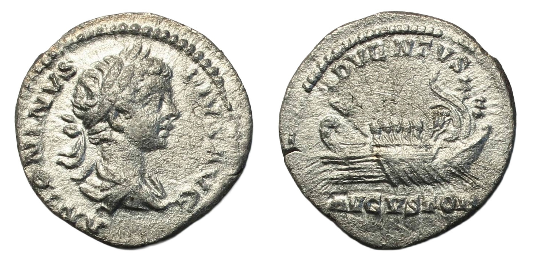 † Caracalla (198-217 AD) Denarius Rome mint, laureate and draped bust right, rev. galley left, with rowers and passengers, 2.42g, (RIC IV 121, RSC 8). Porous surfaces, particularly on obverse, otherwise good very fine
