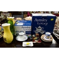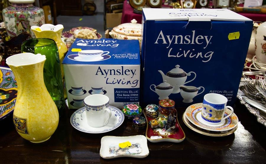 AYNSLEY "ASTON BLUE" 4 PLACE TEA SET, VASES, 4 ENAMEL BOXES ETC