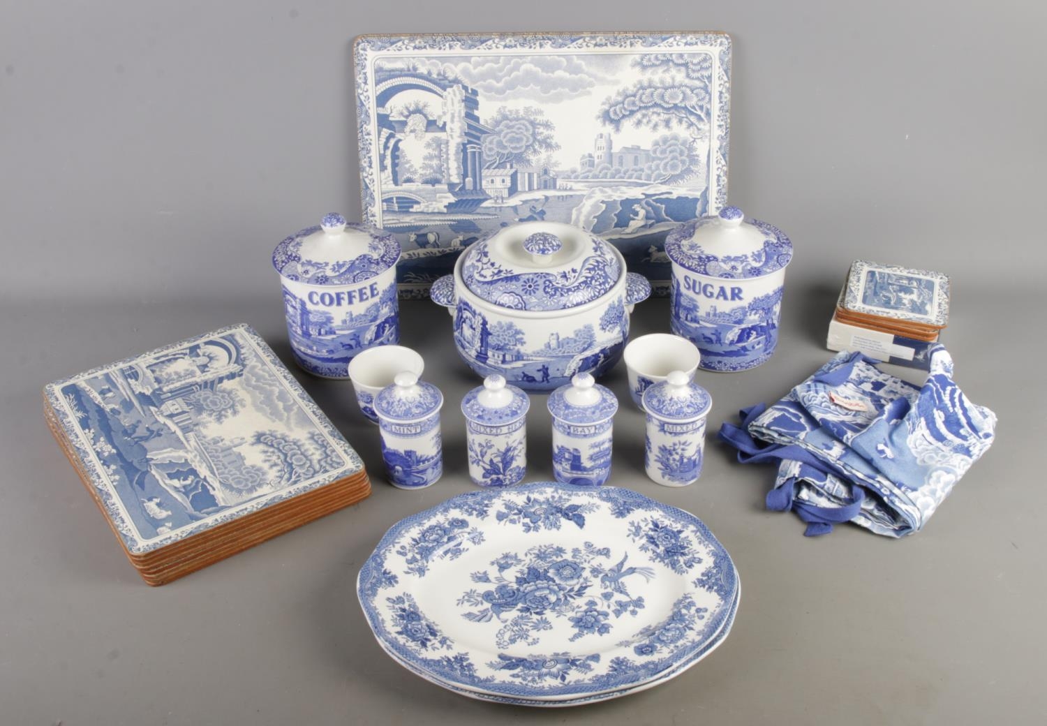 A collection of Spode blue and white ceramics and other examples; Including lidded Italian jars Coffee, Sugar and other spice jars, placemats, coasters, apron alongside two blue and white Enoch Wedgwood plates.