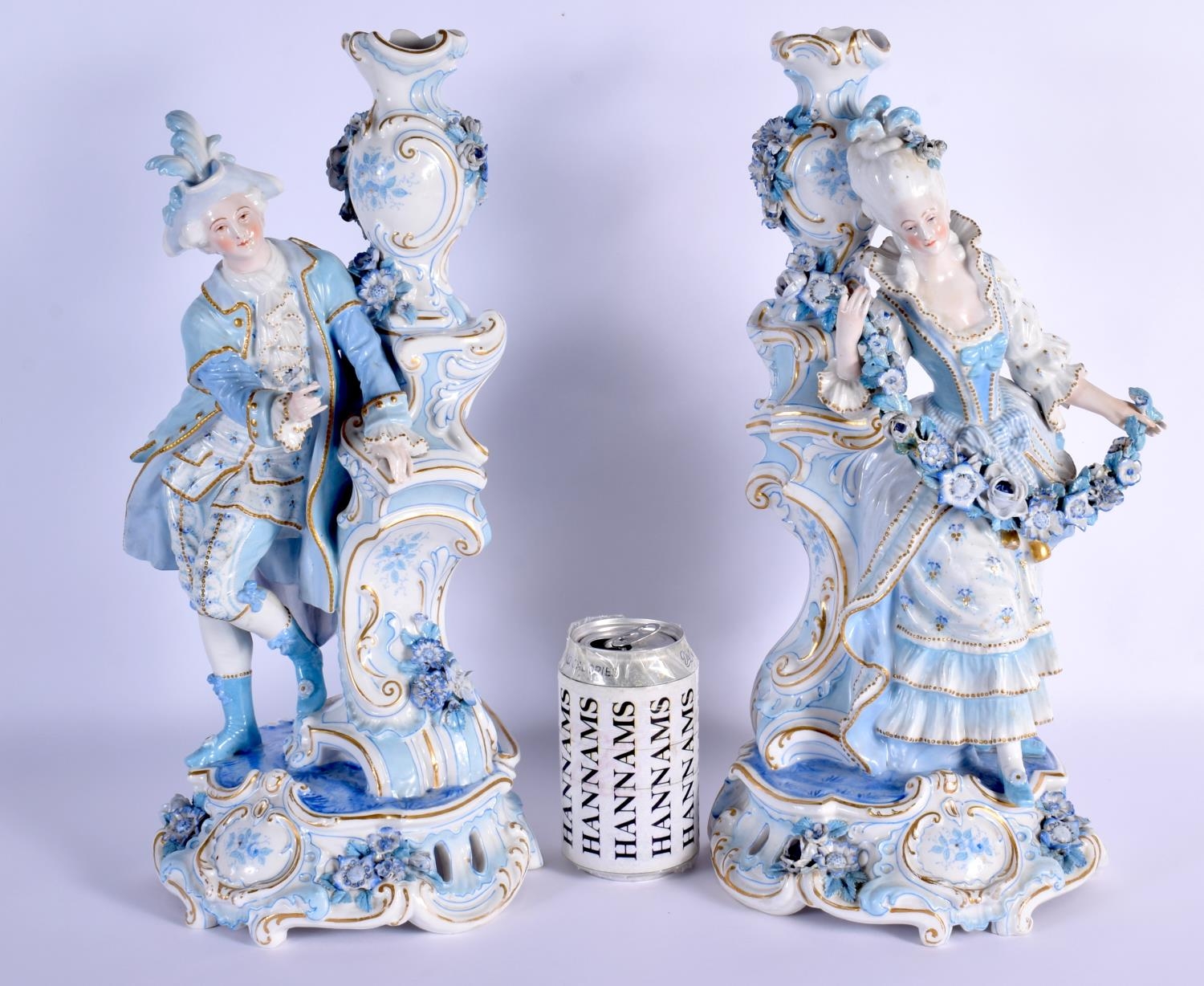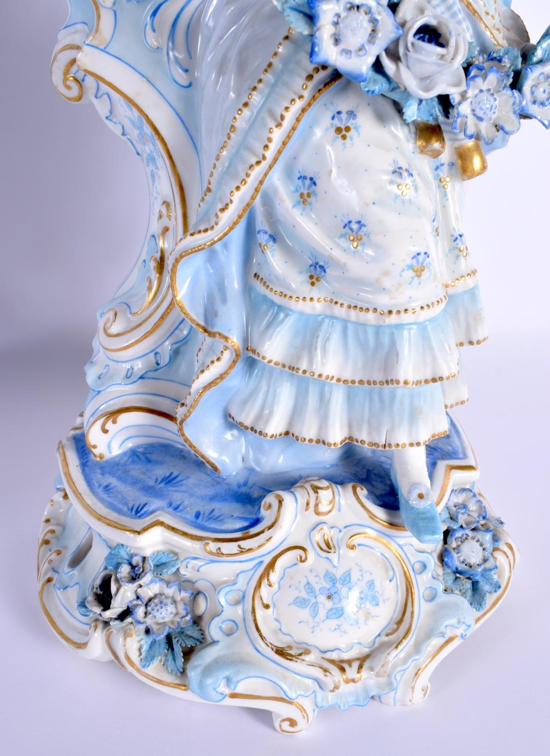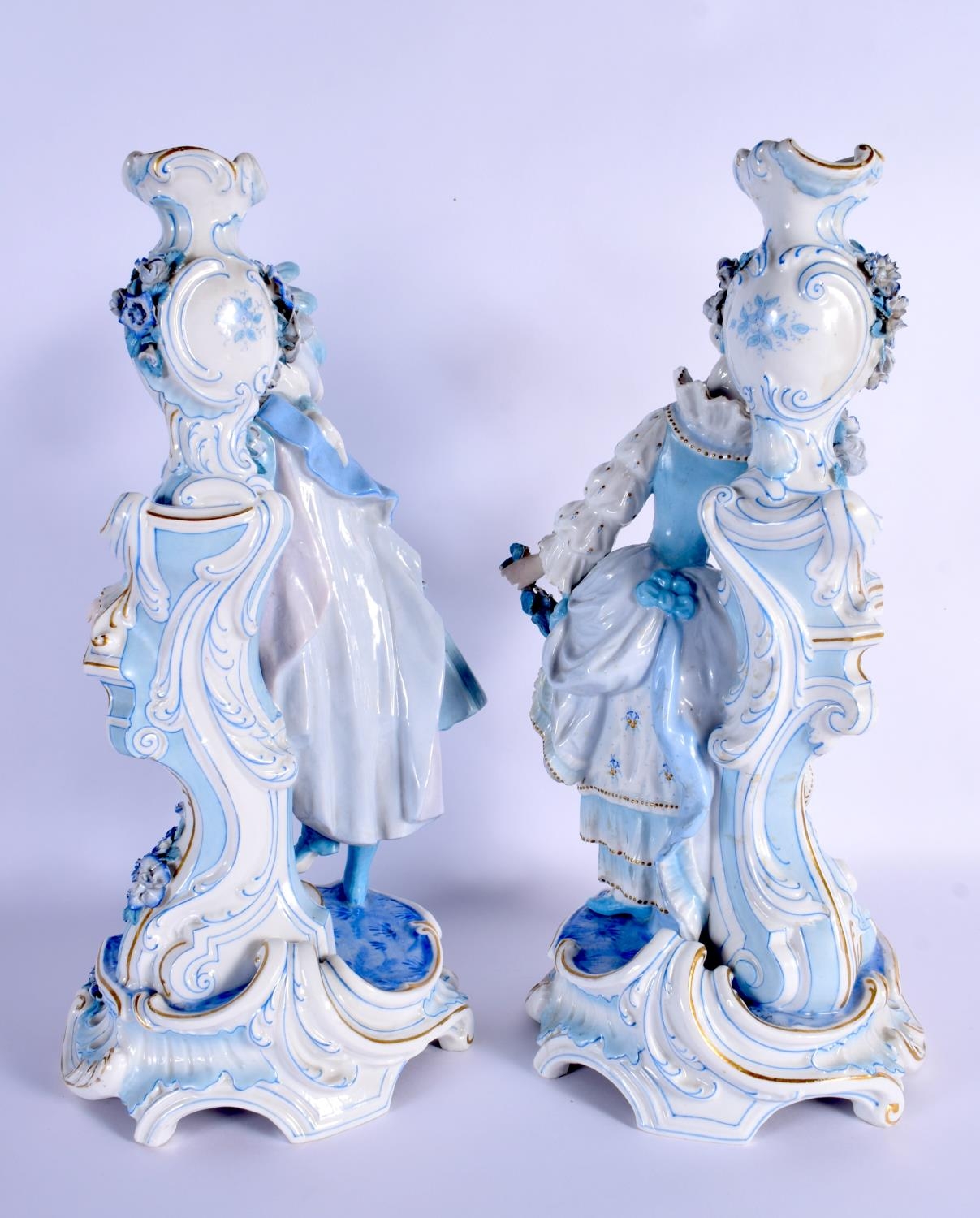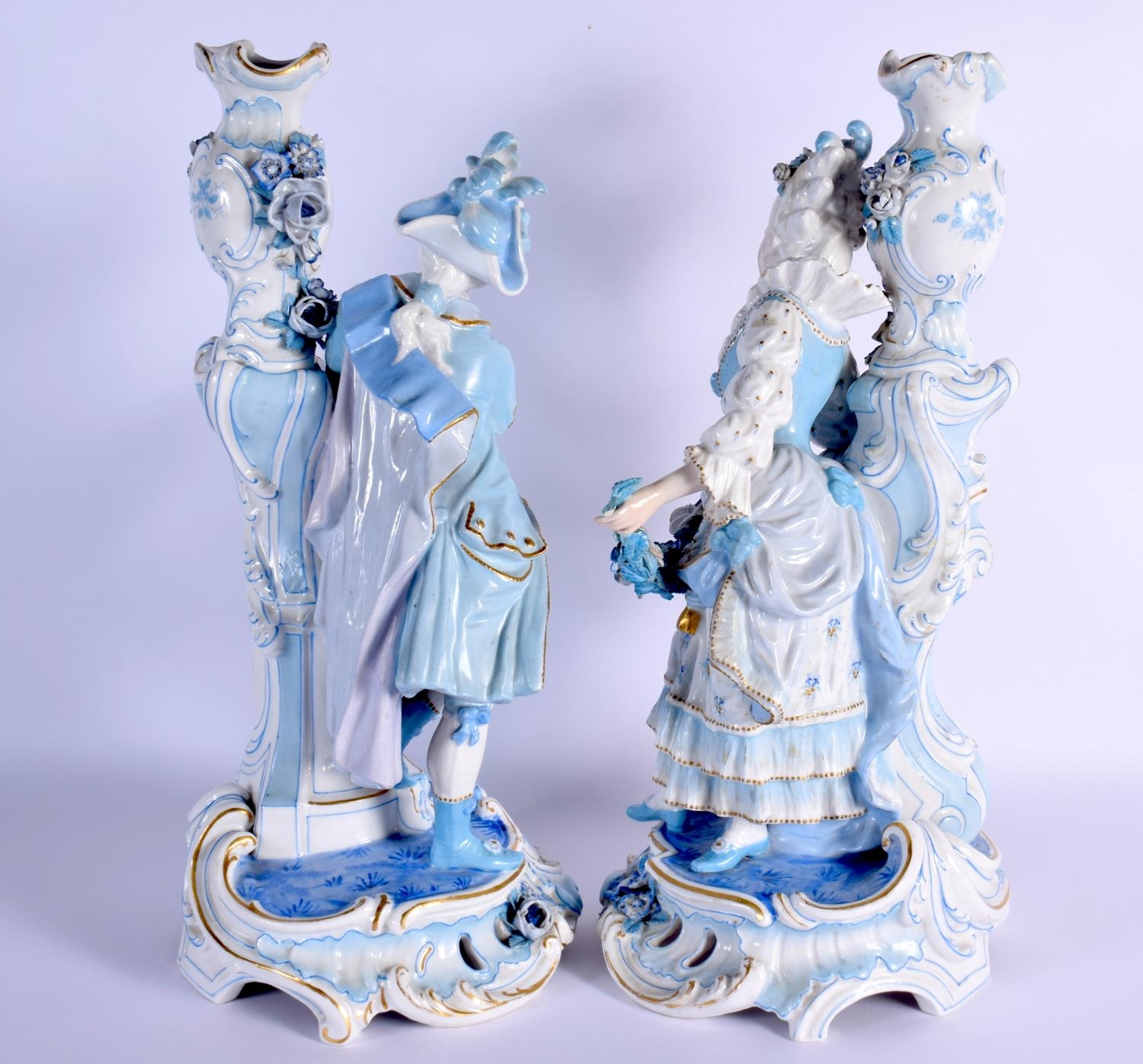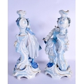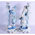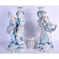 A GOOD LARGE PAIR OF 19TH CENTURY GERMAN BLUE AND WHITE PORCELAIN FIGURES modelled as a female and female beside vases. 40 cm x 13 cm.