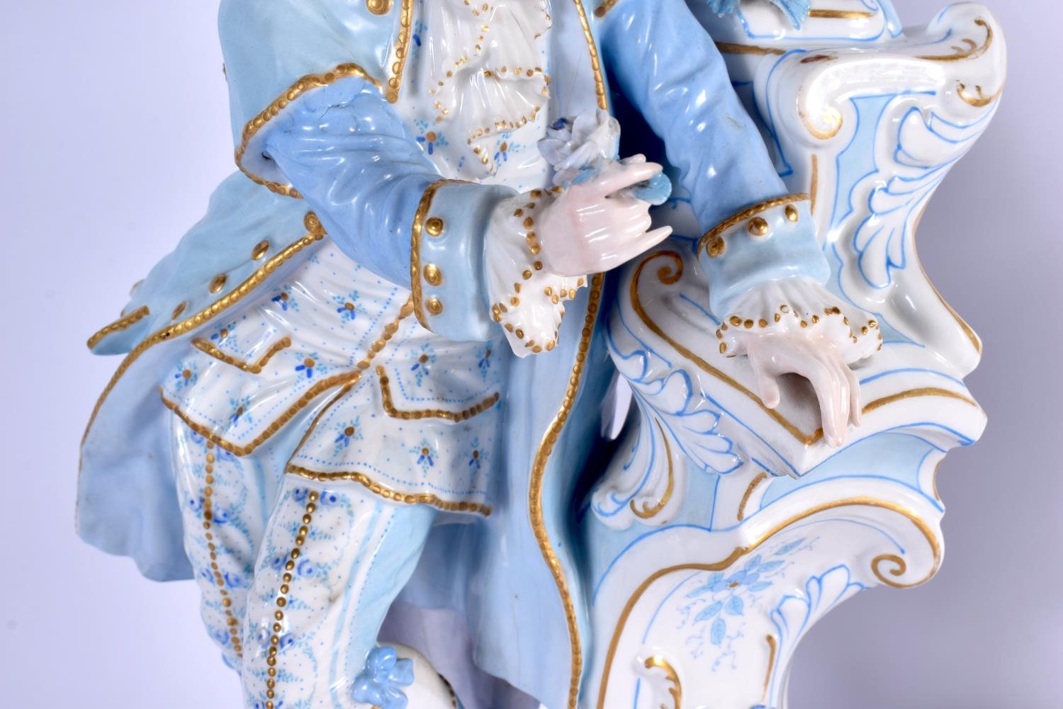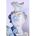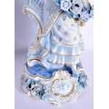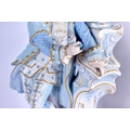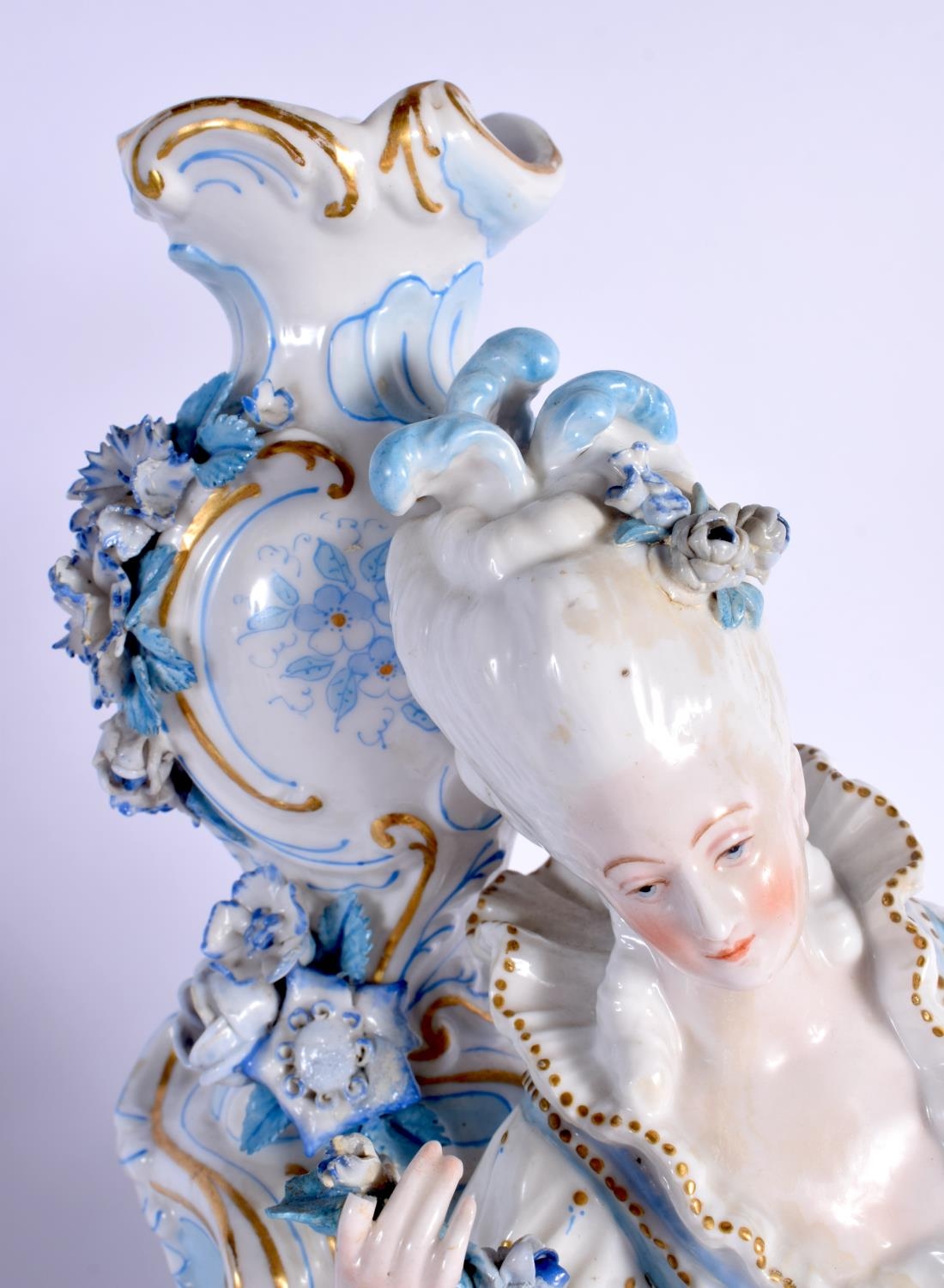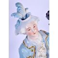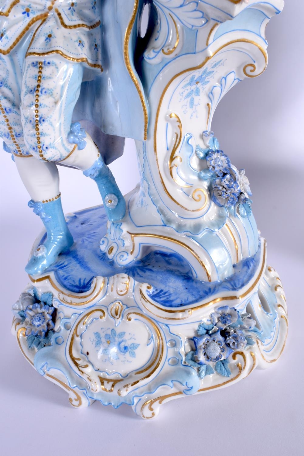 A GOOD LARGE PAIR OF 19TH CENTURY GERMAN BLUE AND WHITE PORCELAIN FIGURES modelled as a female and female beside vases. 40 cm x 13 cm.
