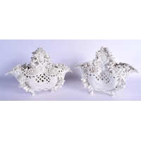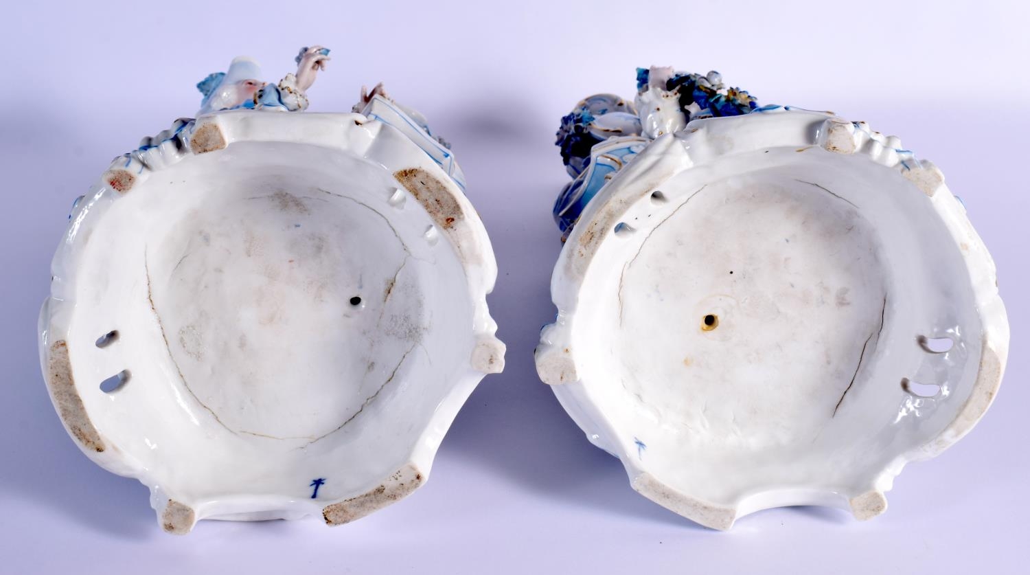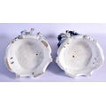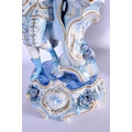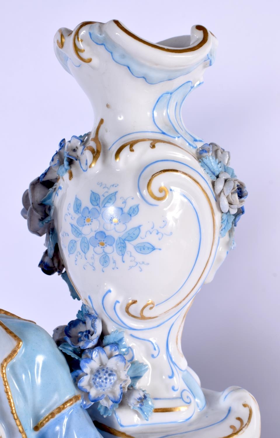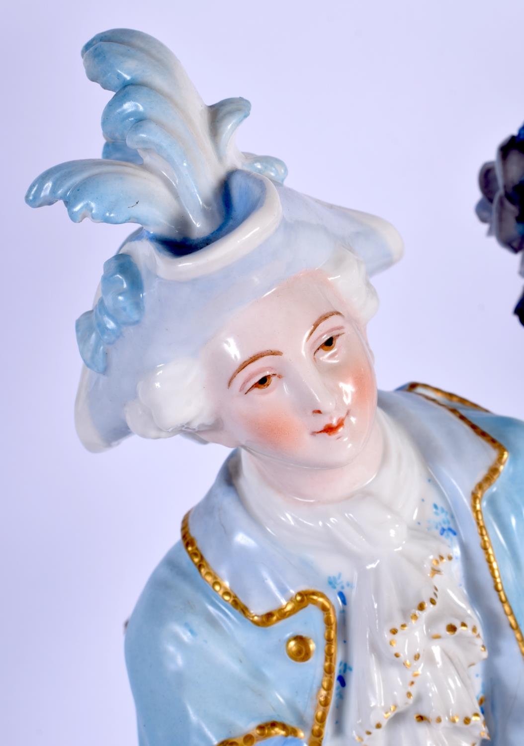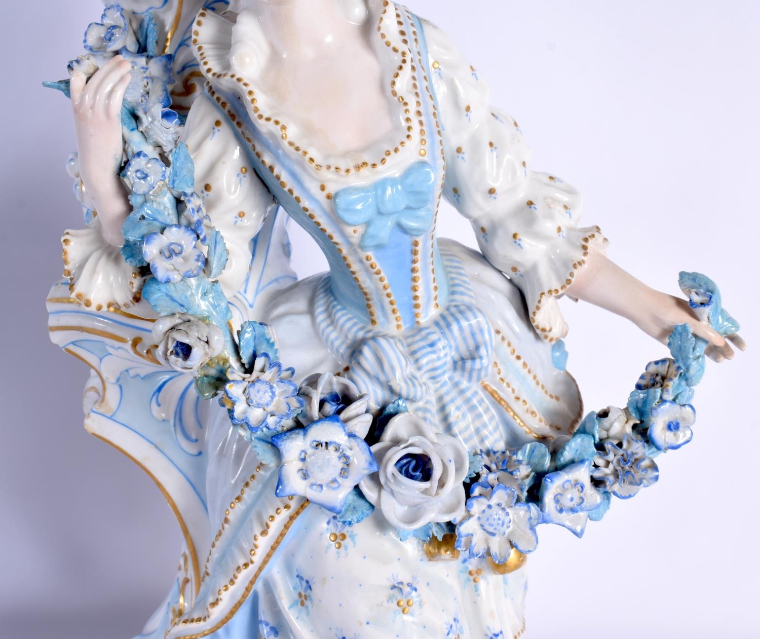 A GOOD LARGE PAIR OF 19TH CENTURY GERMAN BLUE AND WHITE PORCELAIN FIGURES modelled as a female and female beside vases. 40 cm x 13 cm.