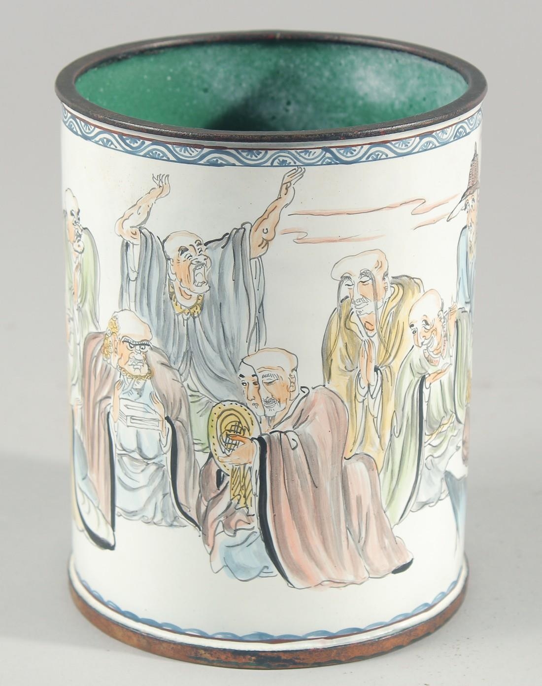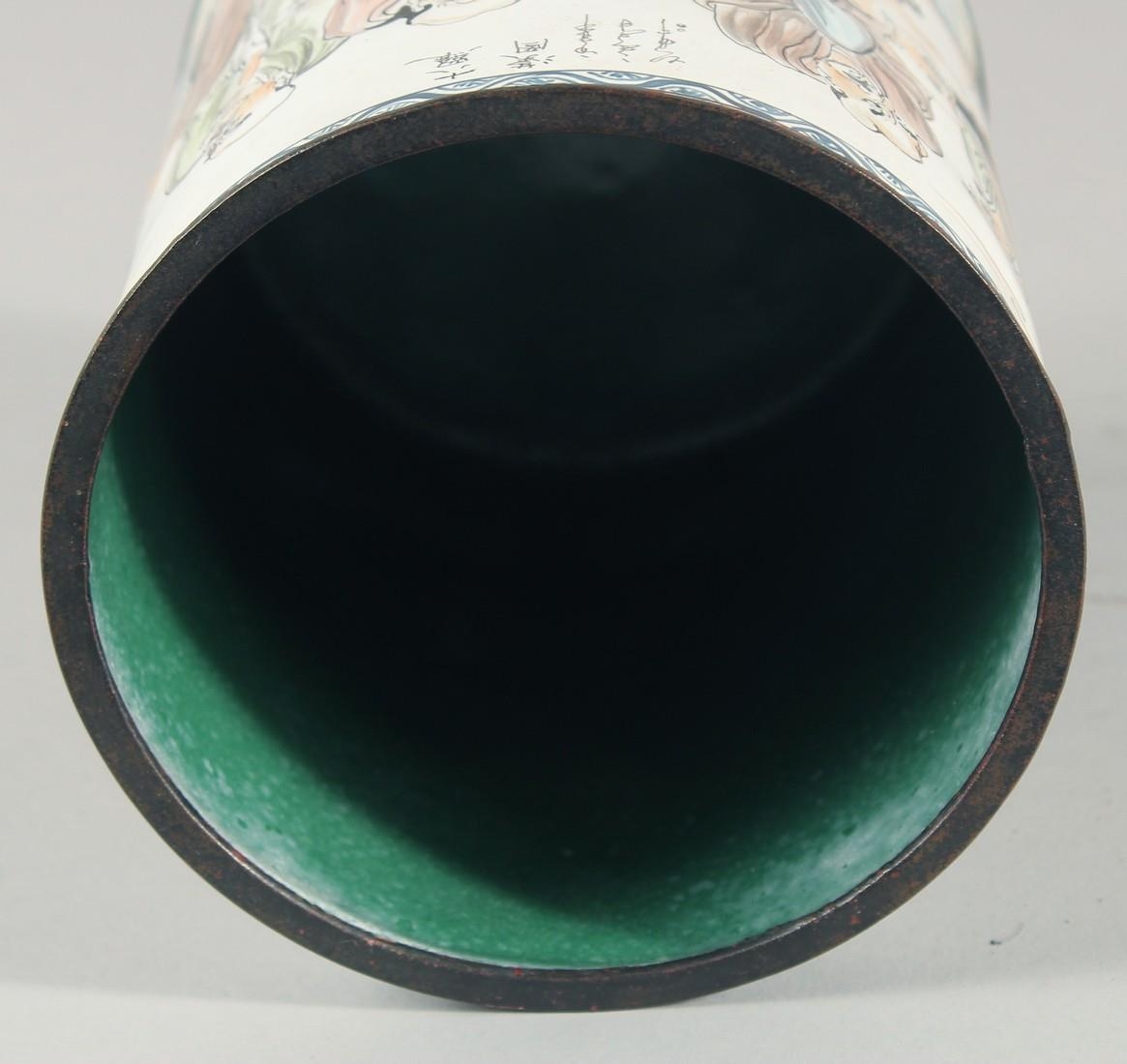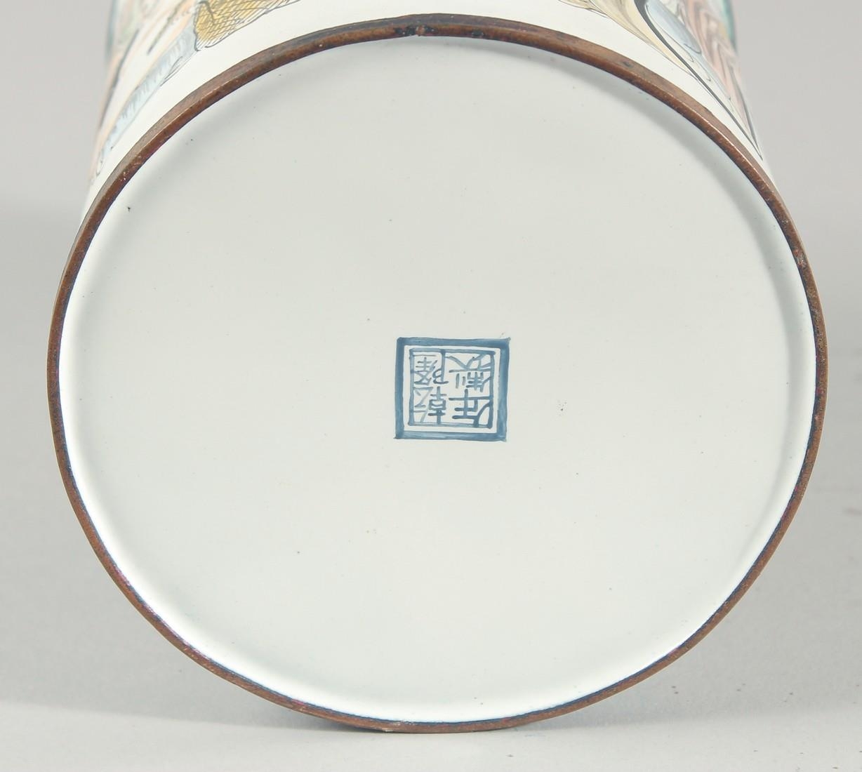 A CHINESE ENAMELLED CYLINDRICAL POT, painted with various figures and inscribed, character mark to base, 14cm high.