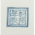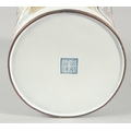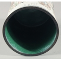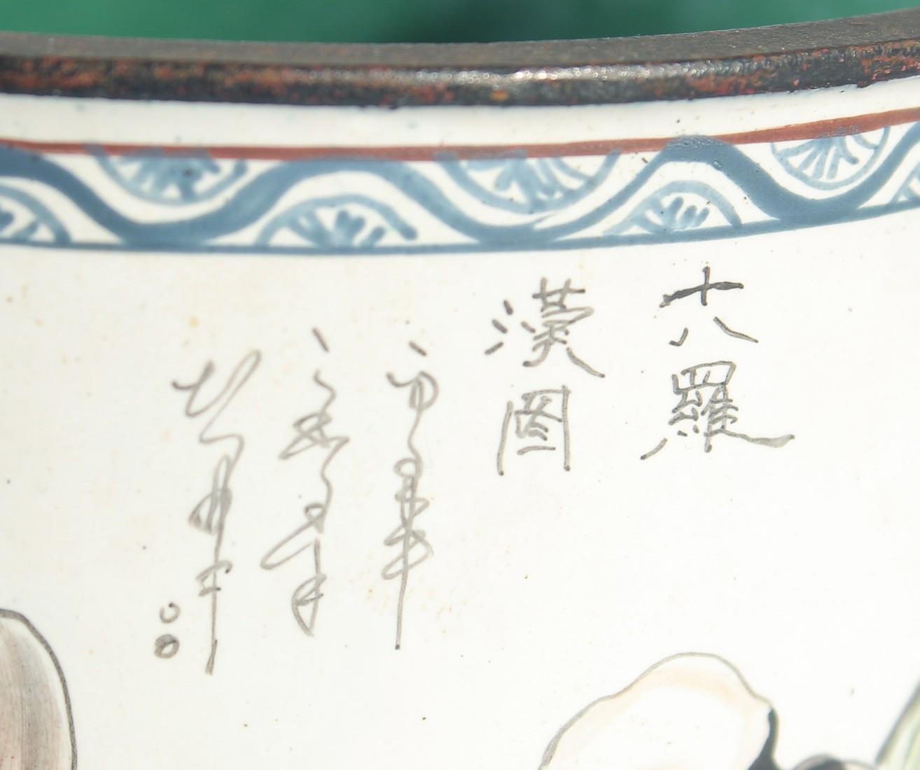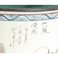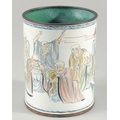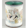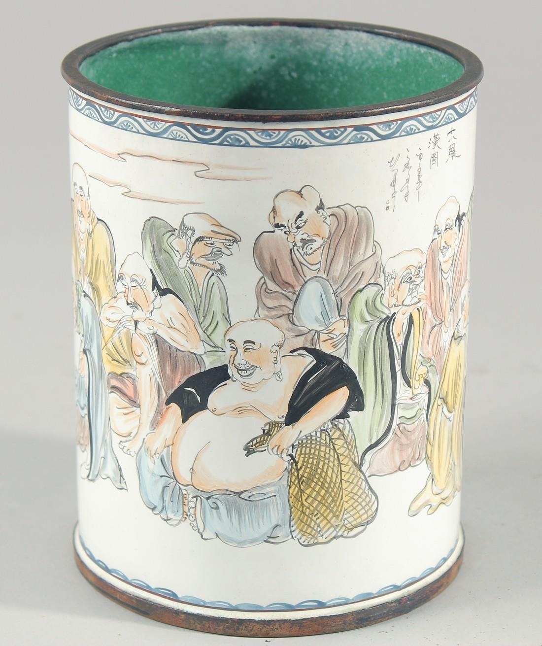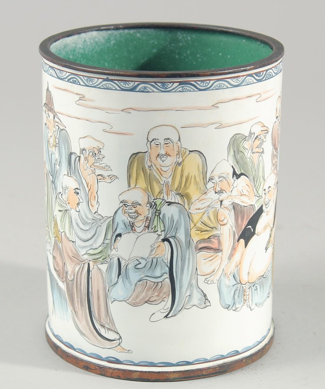 A CHINESE ENAMELLED CYLINDRICAL POT, painted with various figures and inscribed, character mark to base, 14cm high.