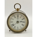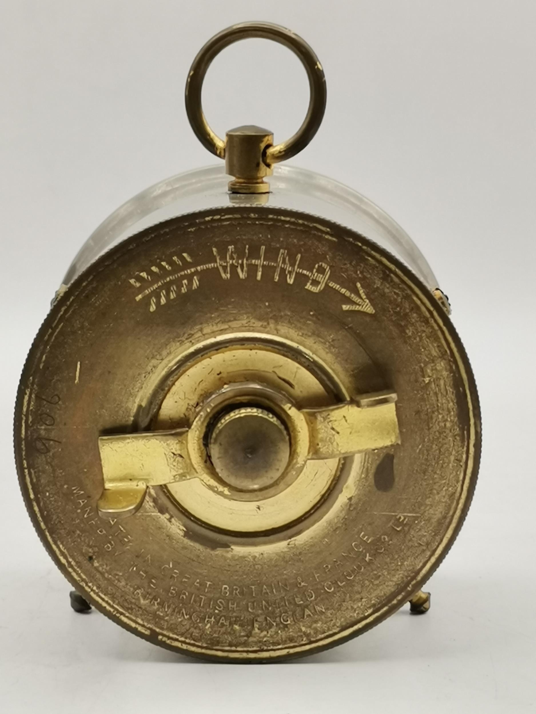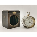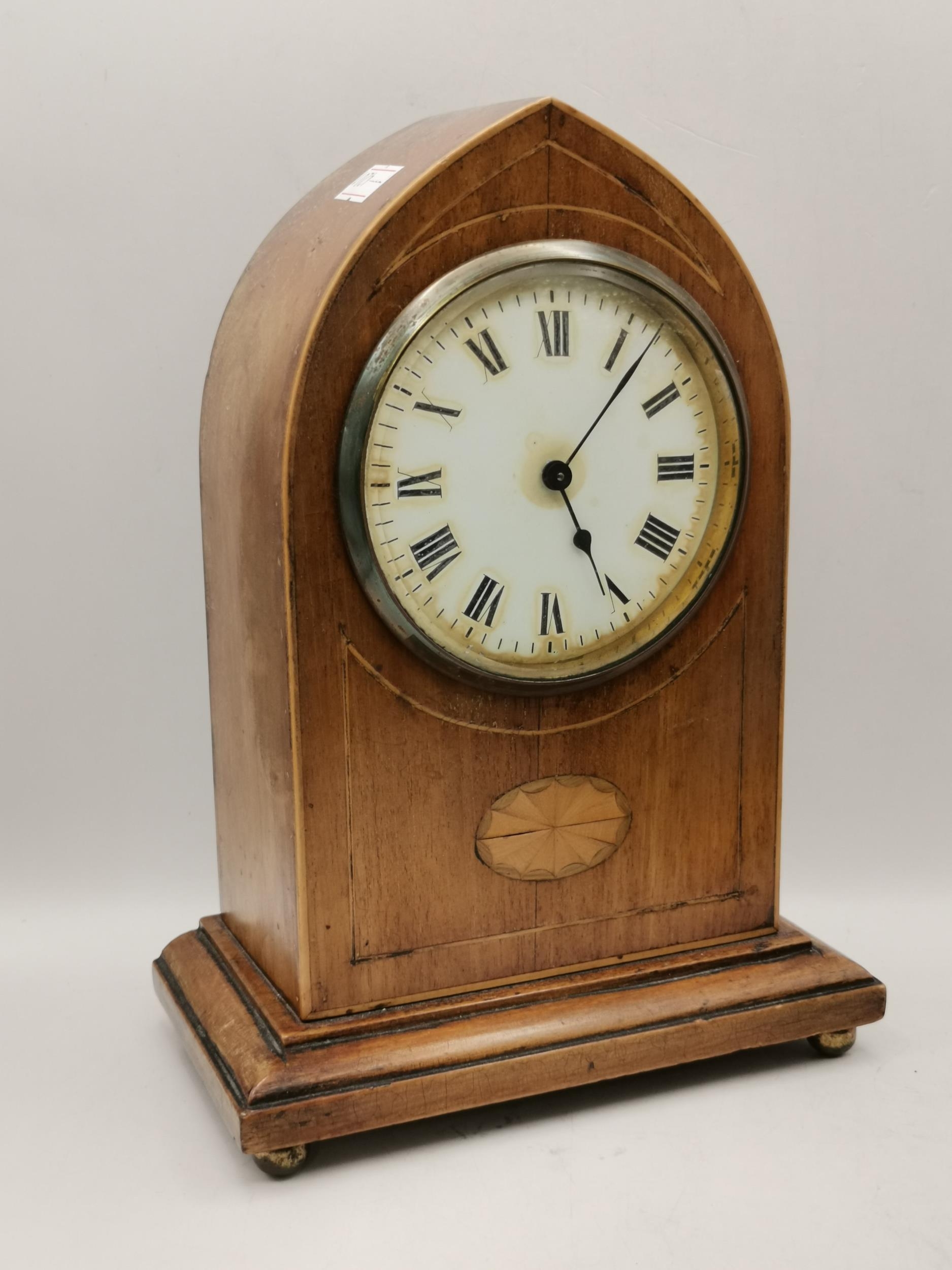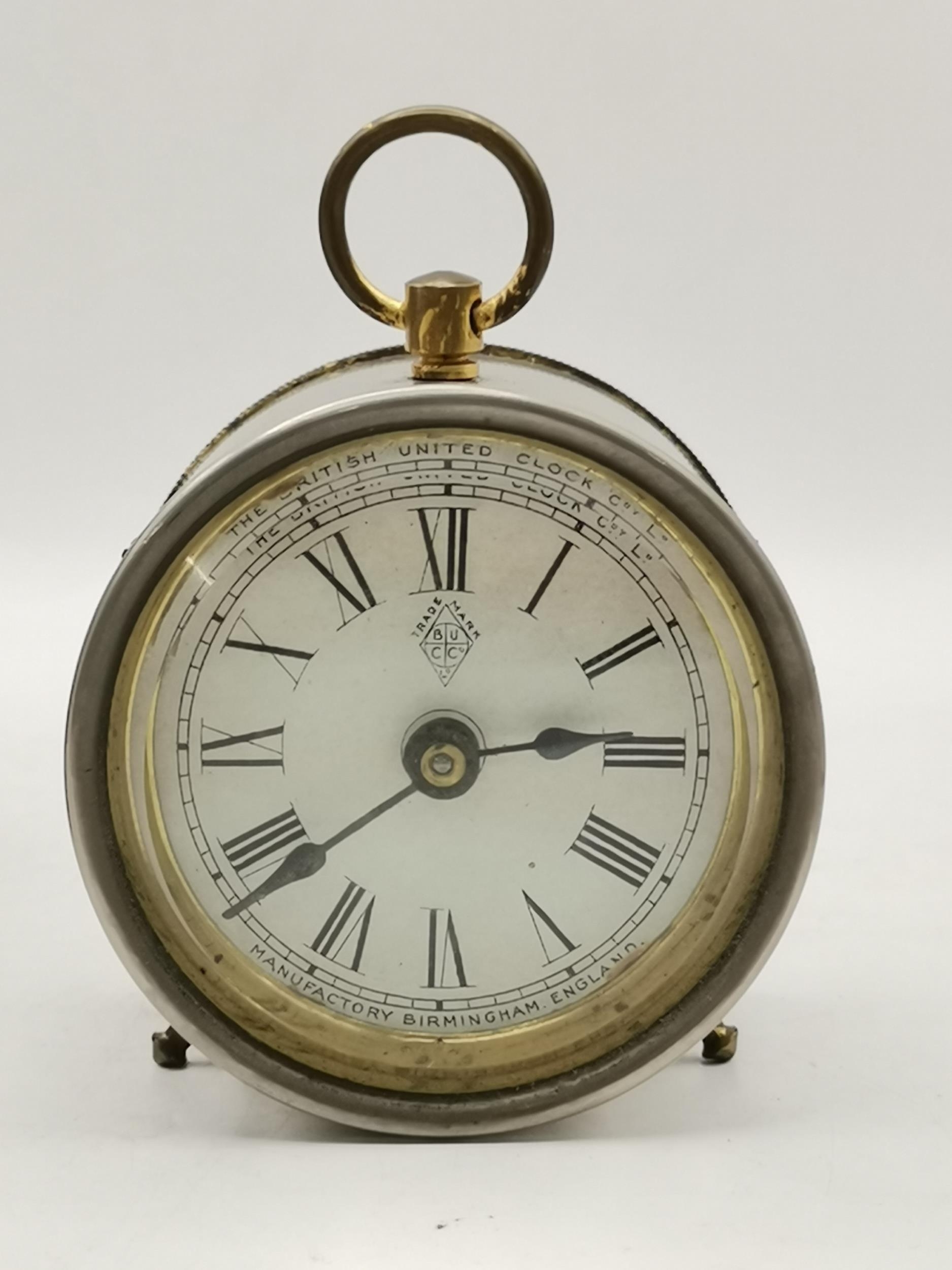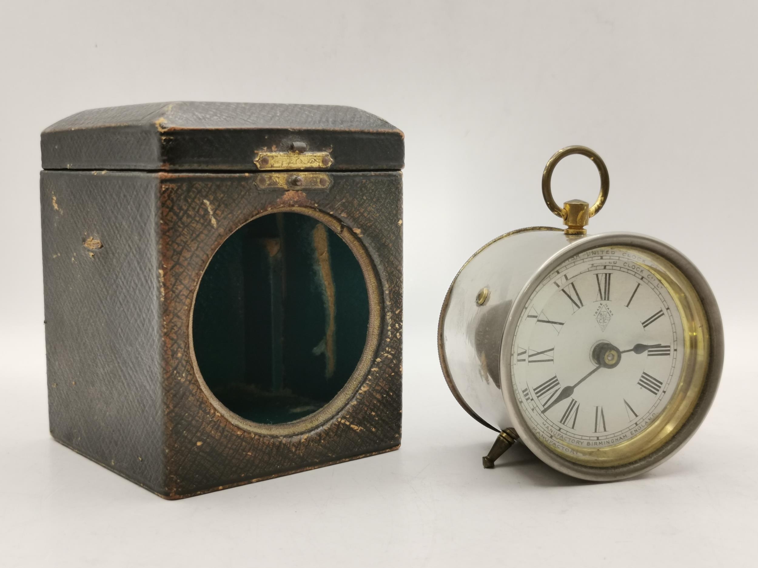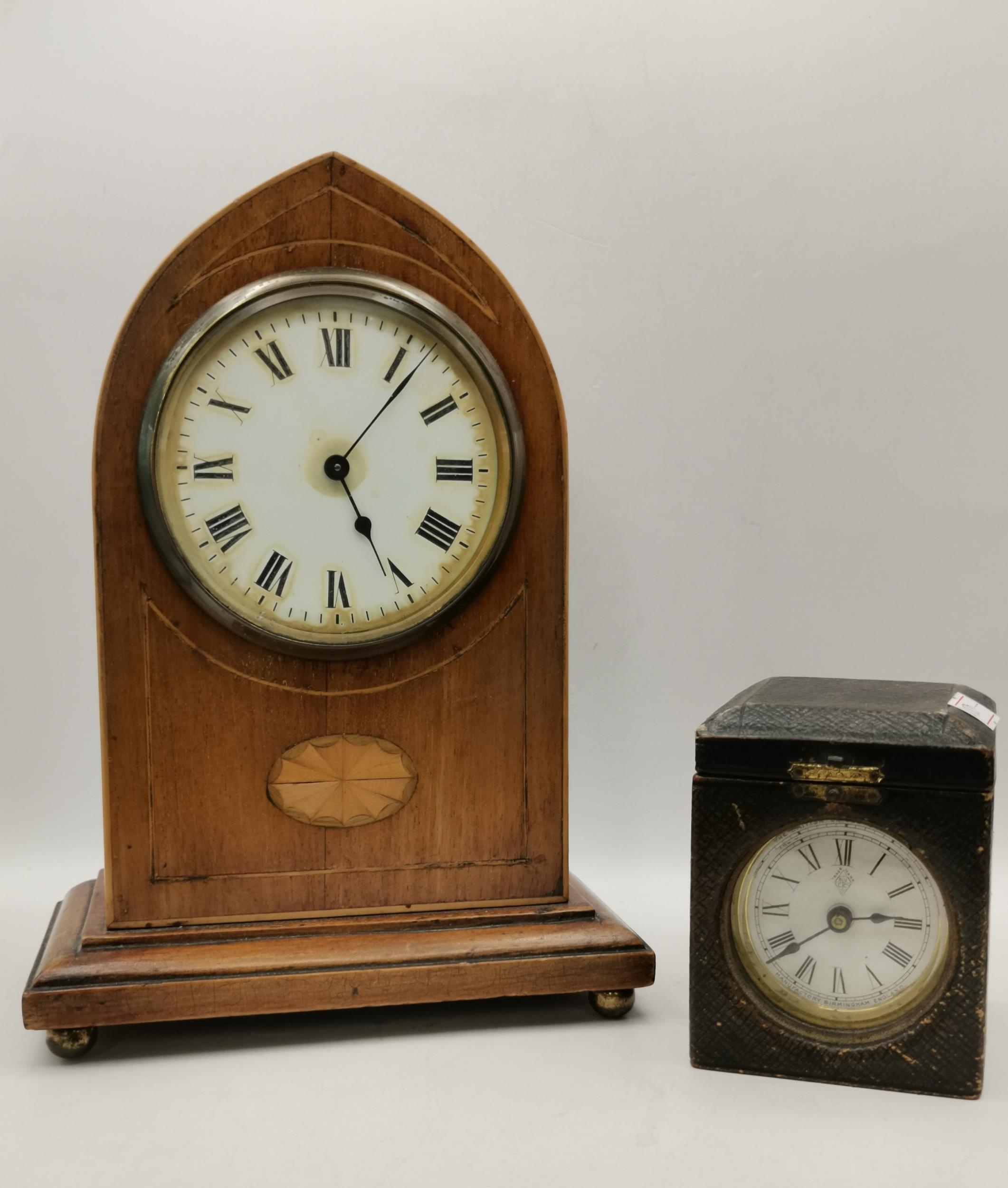 Edwardian mahogany Inlaid mantel clock, plus Small drum cased mantel clock in leather travel case by British united clock company based in Birmingham dial has roman Numerals and the company name BUCC.