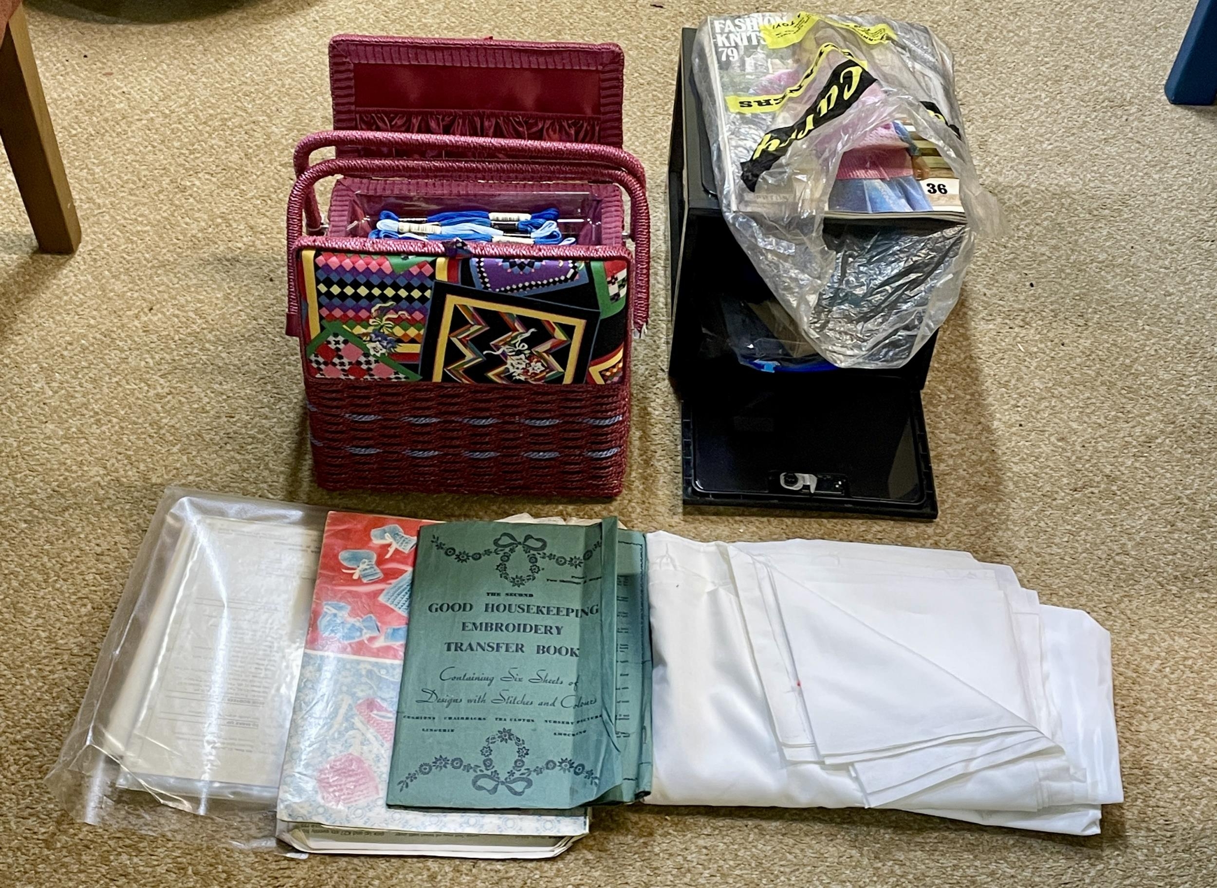 NEEDLEWORK BASKET CONTAINING EMBROIDERY FLOSS AND ACCESSORIES, QTY SCRAP FABRICS AND VINTAGE KNITTING PATTERNS TOGETHER WITH A SMALL STORAGE BOX (LOCK CODE 271)