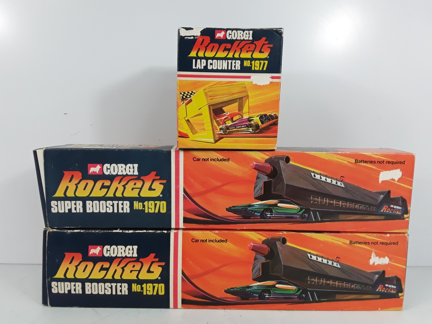 Two boxed Corgi Rockets Super Booster No.1970 and a Corgi Rockets Lap Counter No.1977