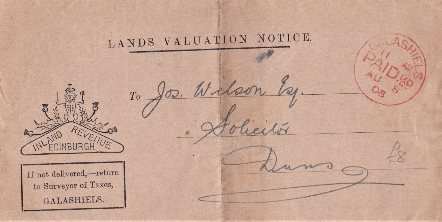 Great Britain Postal History - Galashields 1908 Lands Valuation Notice, posted Inland Revenue Galashields, paid in red