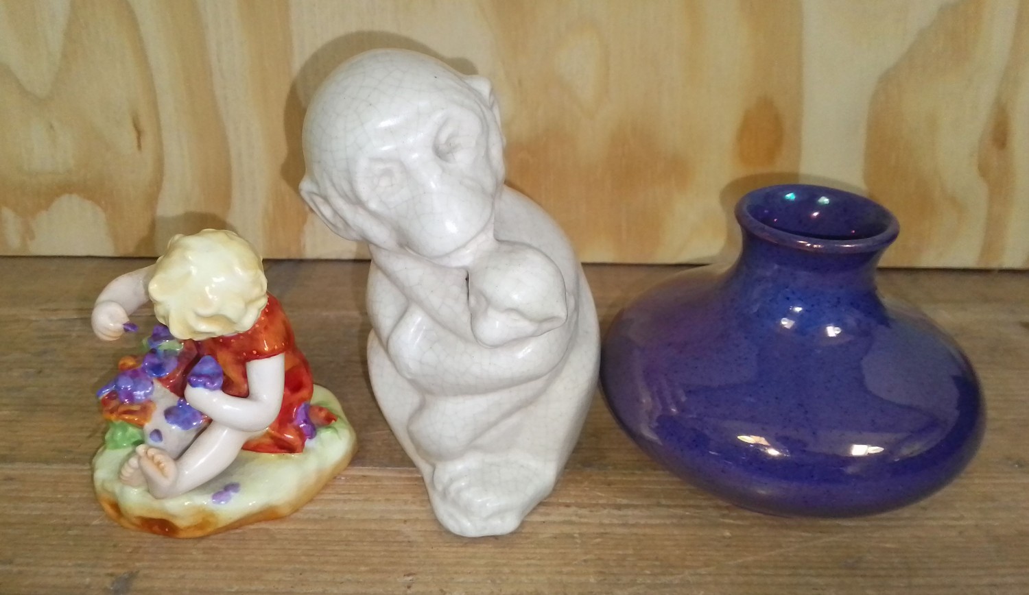 Three pieces of pottery comprising a John Skeaping style monkey model, a Moorcroft pottery vase and a Royal Worcester figure,