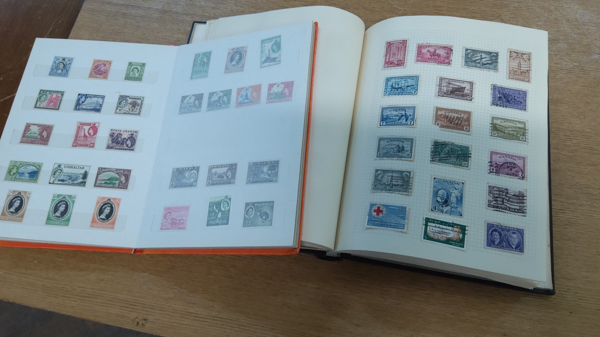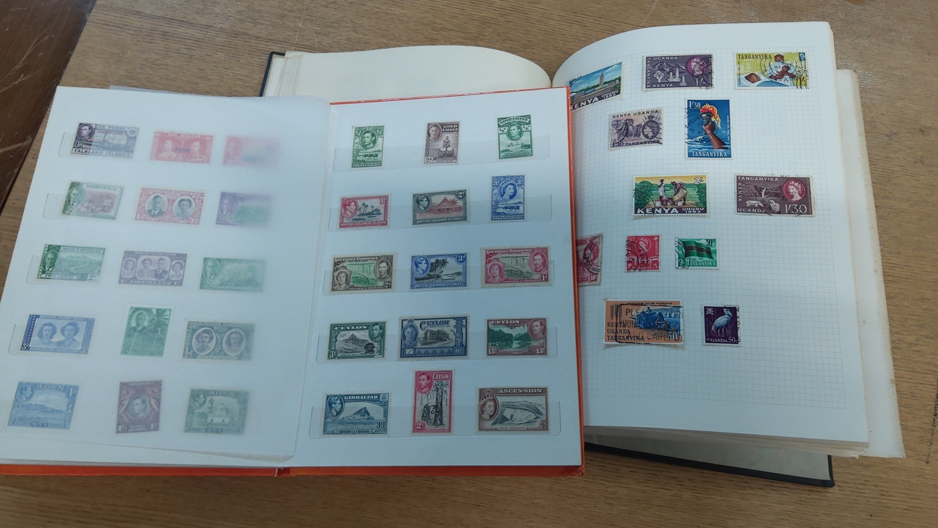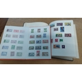 Collection of two albums housing assorted mid-20th-century postage stamps, chiefly British Empire issues, mounted on album pages.