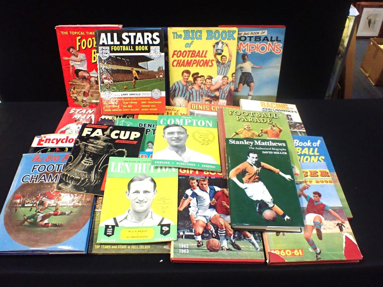 A DAY & MASON 1953 FA CUP ANNUAL and a quantity of vintage football and sport books , Denis Compton Annuals, Stanley Matthews Albums etc (some damage)