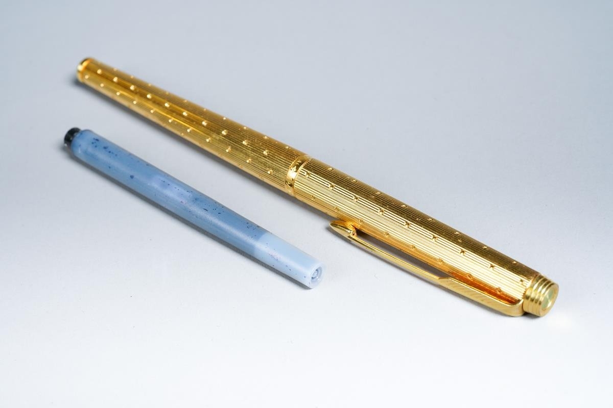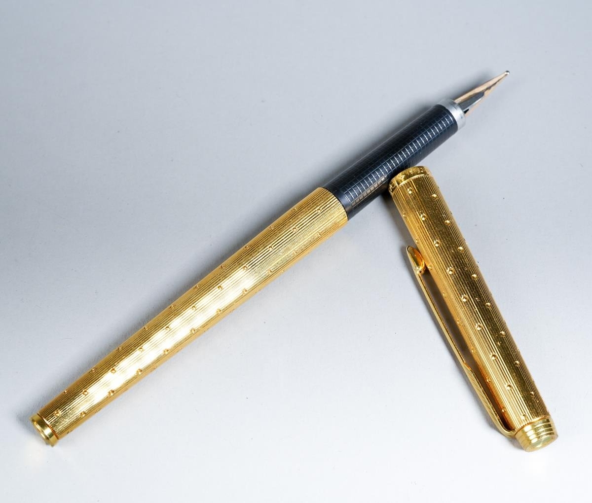 A Parker 180 gold plated fountain pen, the barrel and cap engine turned with dot decoration, the nib stamped 585 M, the cap stamped MADE IN FRANCE PARKER, no box [1]