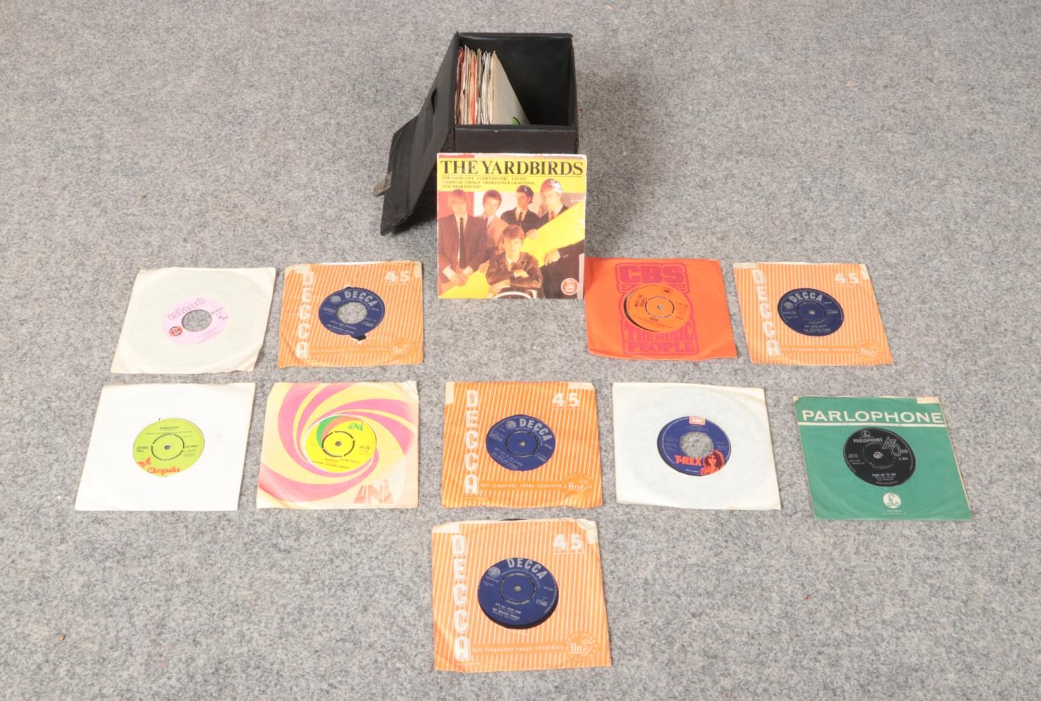 A carry case collection of mostly 60's and 70's vinyl Rock singles to comprise of, The Beatles, The Rolling Stones, The Moody Blues, T.Rex and Mott The Hoople etc.