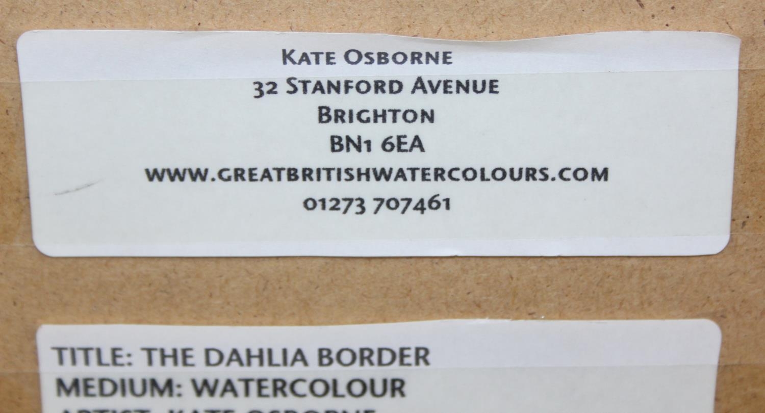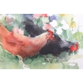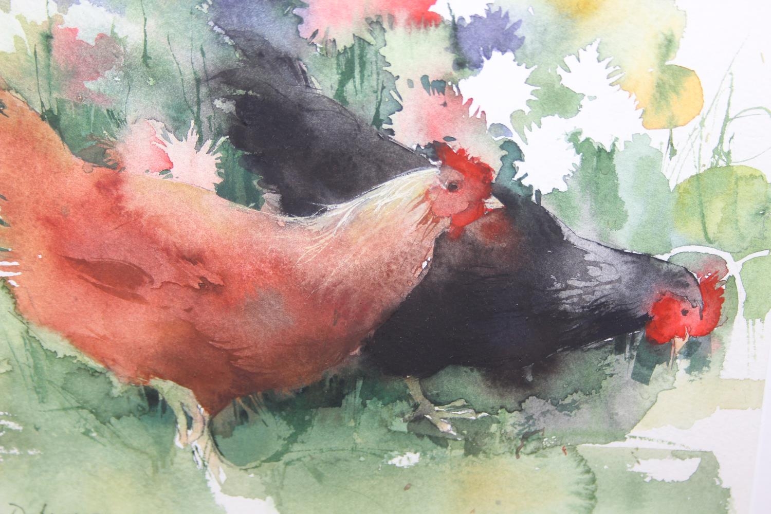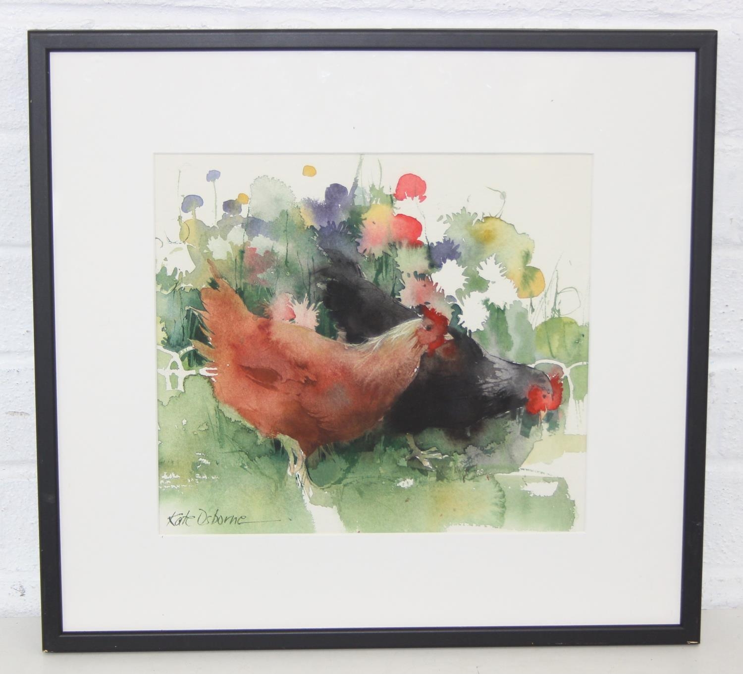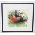 Kate Osborne (British, Contemporary), "The Dahlia Border" watercolour of chickens eating flowers, in simple black frame, original price of £245, 44cm x 41cm