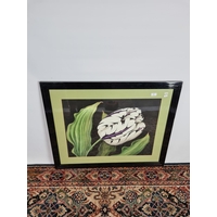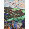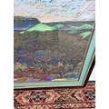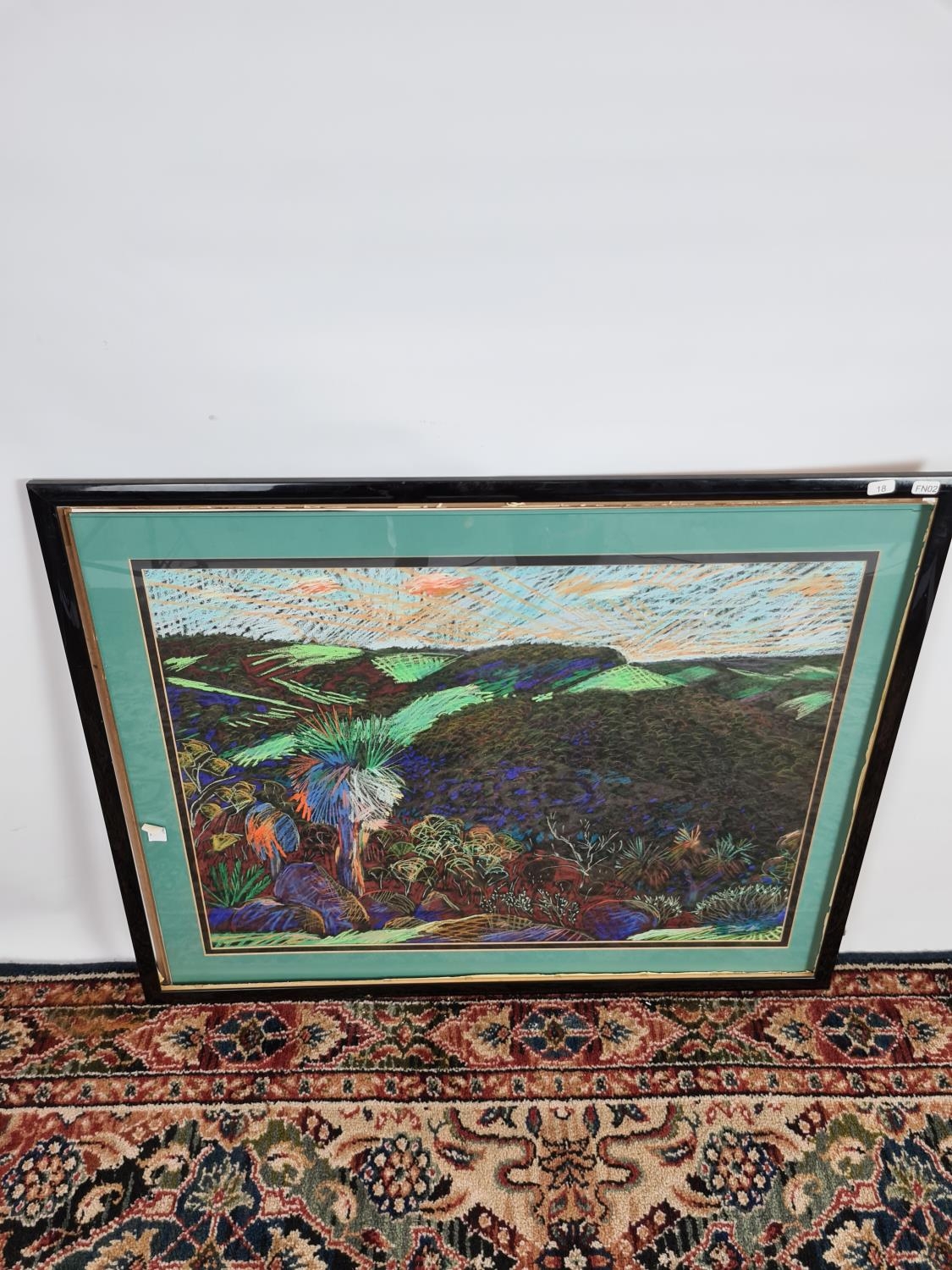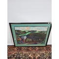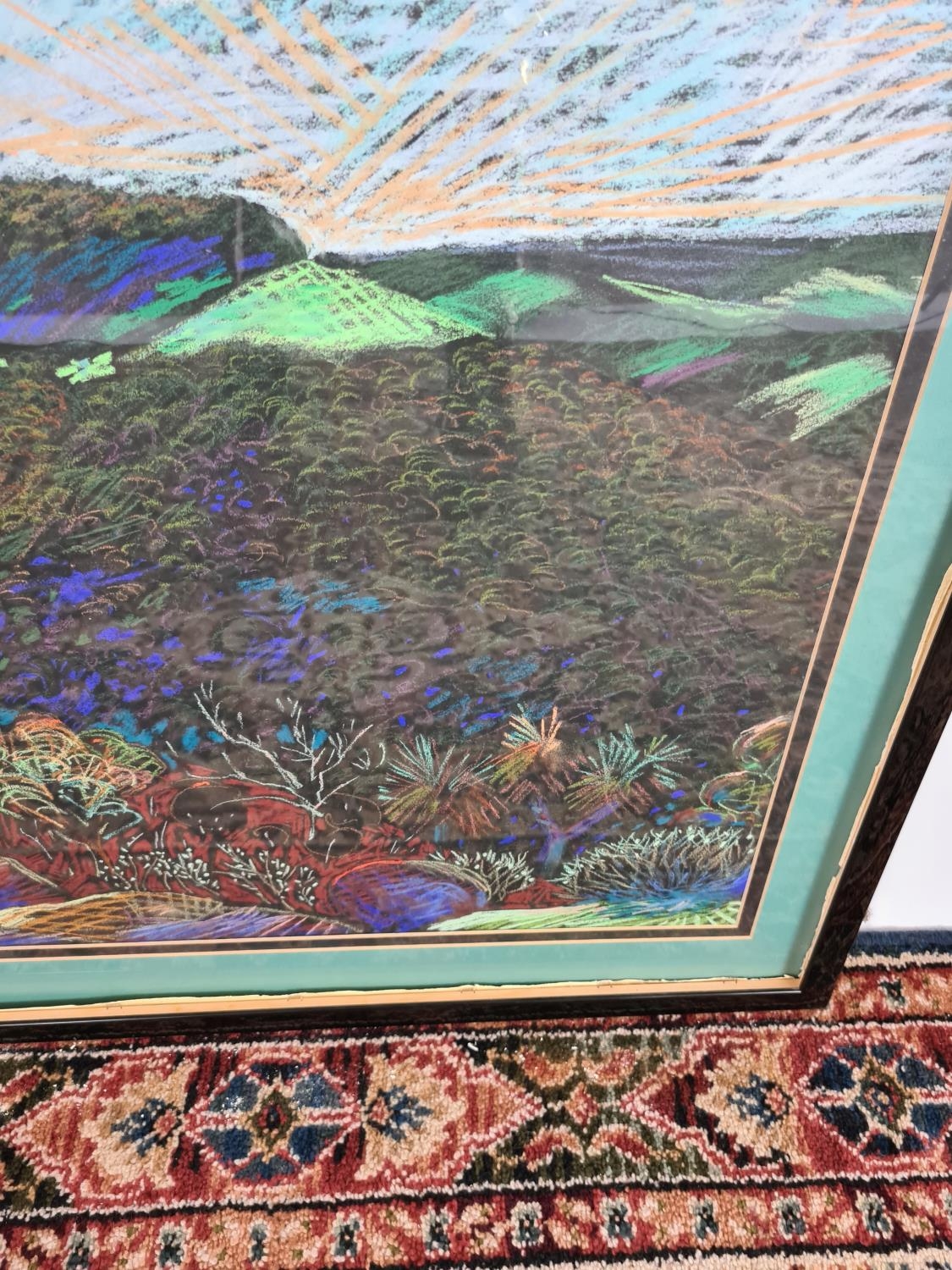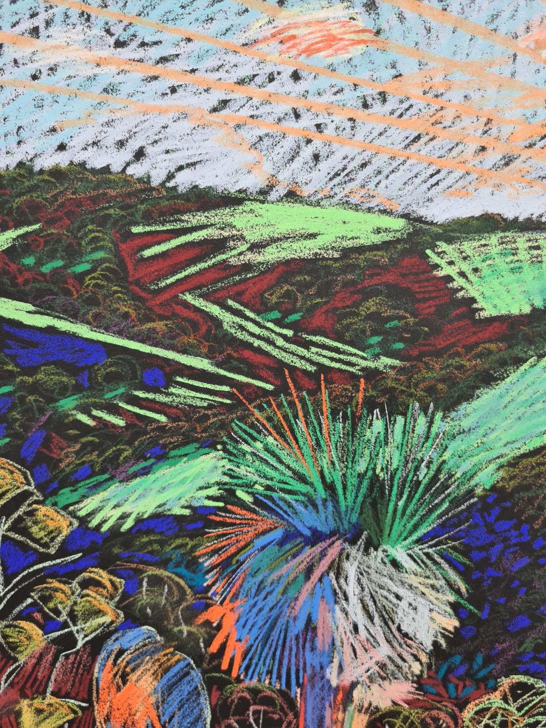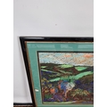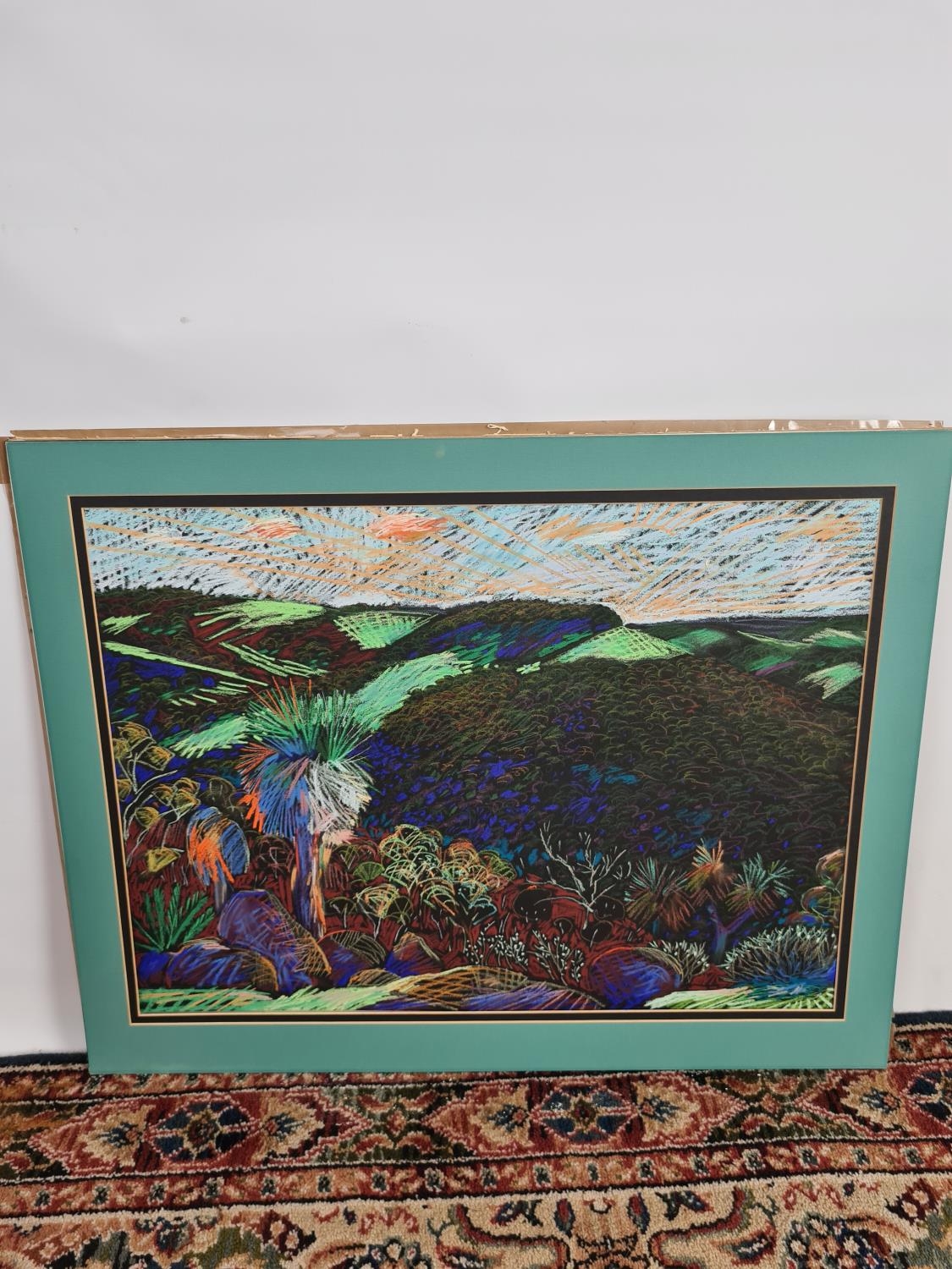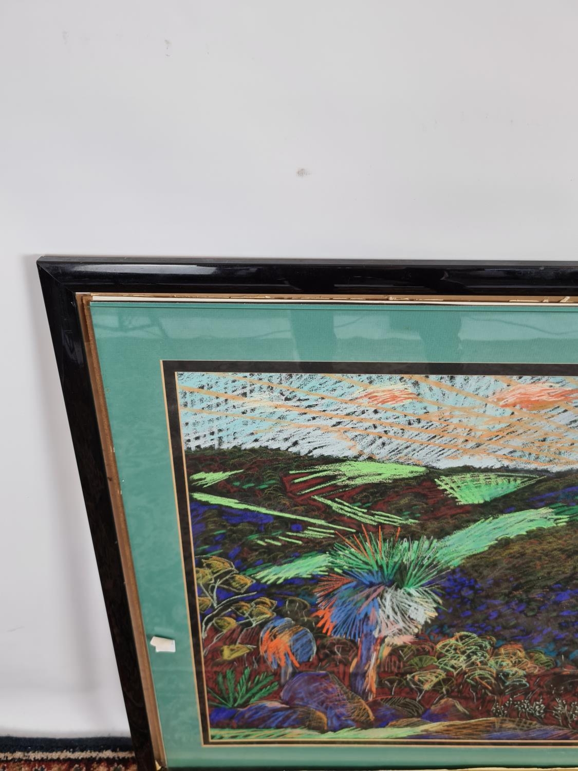 A framed chalk picture of a multicoloured desert landscape in the style of William Crozier
