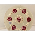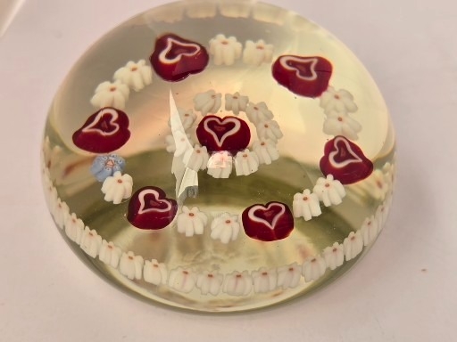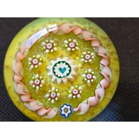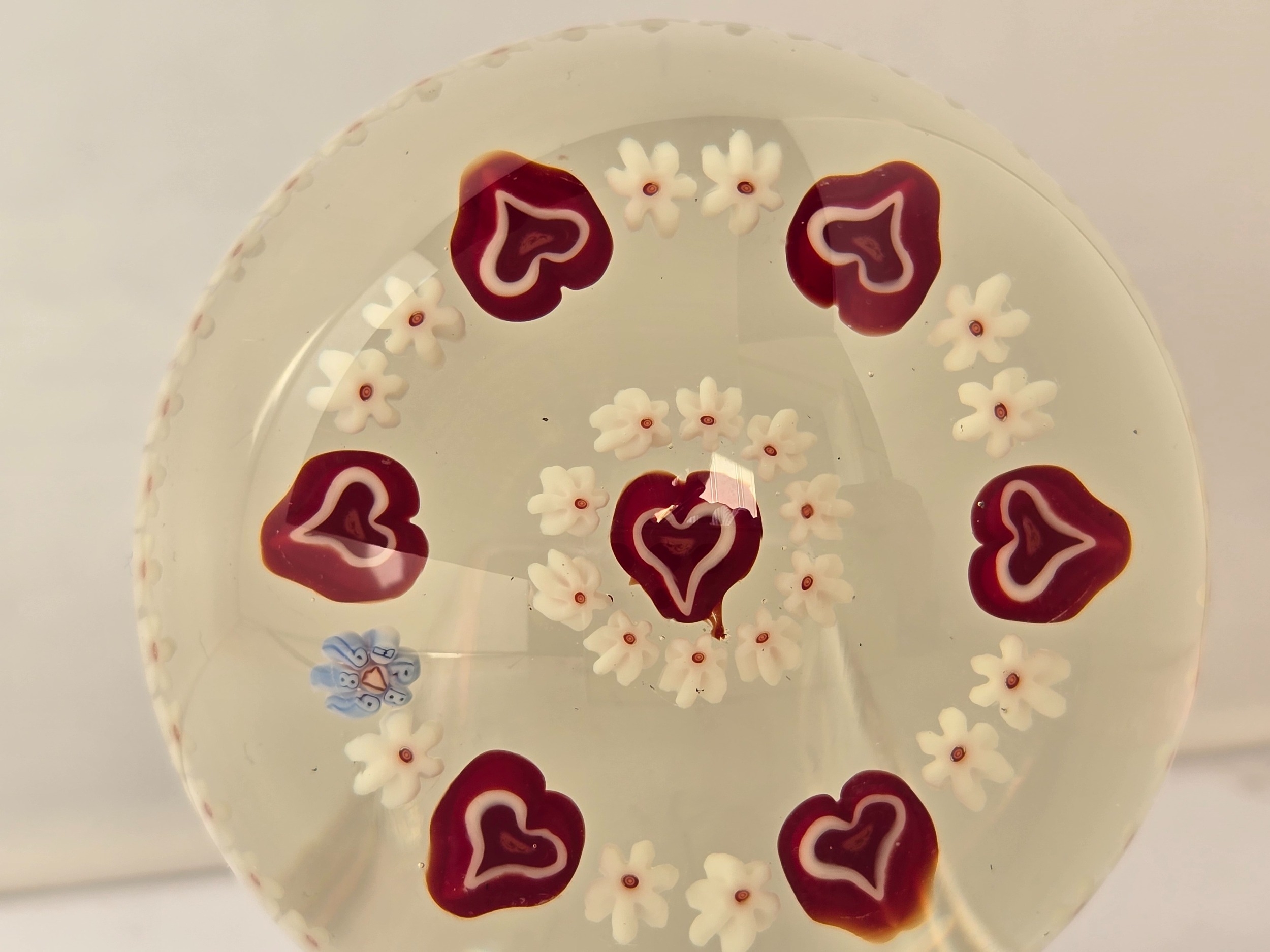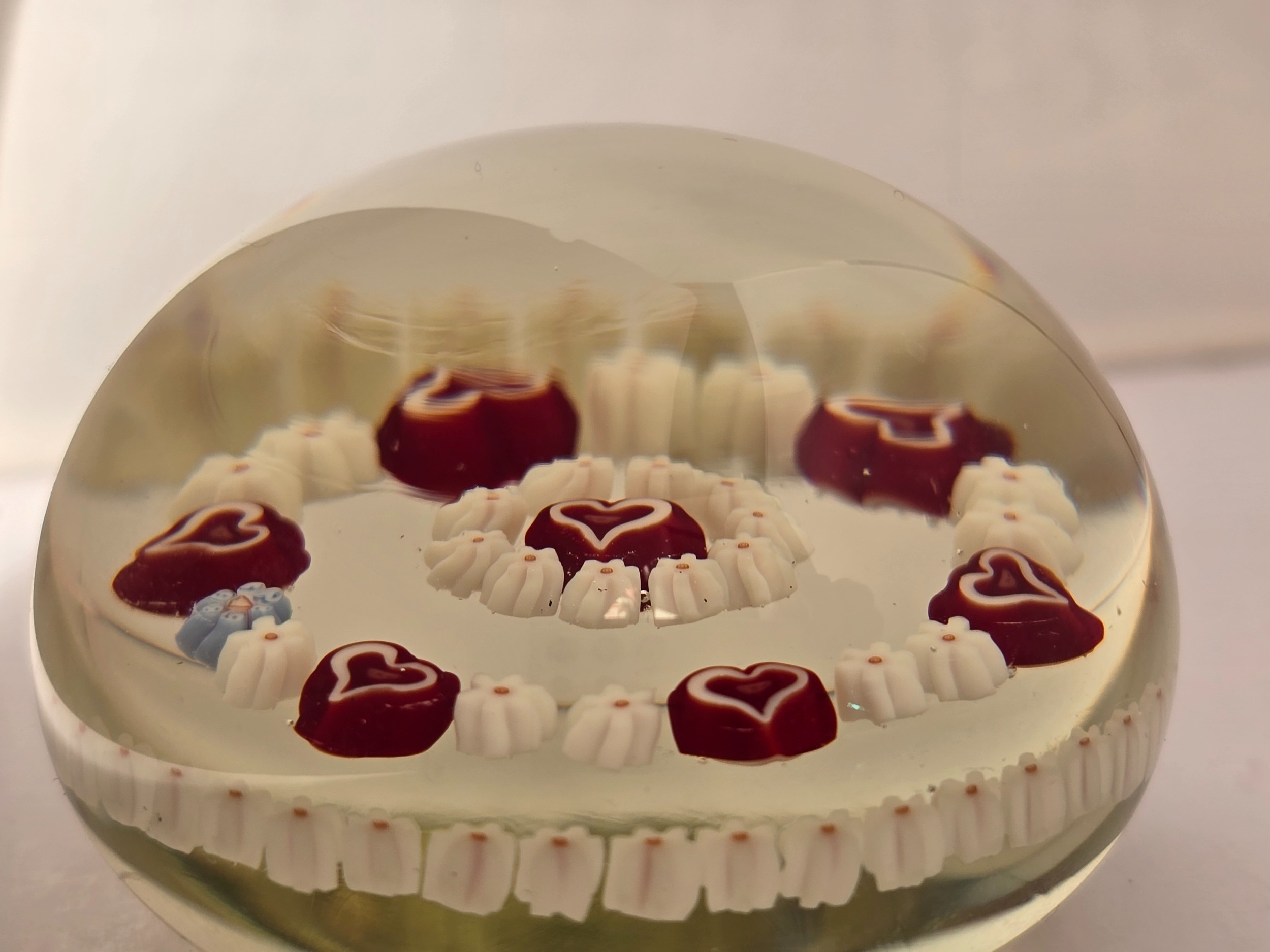 Parabelle Glass paperweight - Most attractive gift for a loved one. 1989 weight showing central heart cane, white canes, then a circle of 6 heart canes with 2 white star canes between each, and garland. On clear. PB1989 cane. Diam: 62mm or 2 7/16th ins. Excellent condition