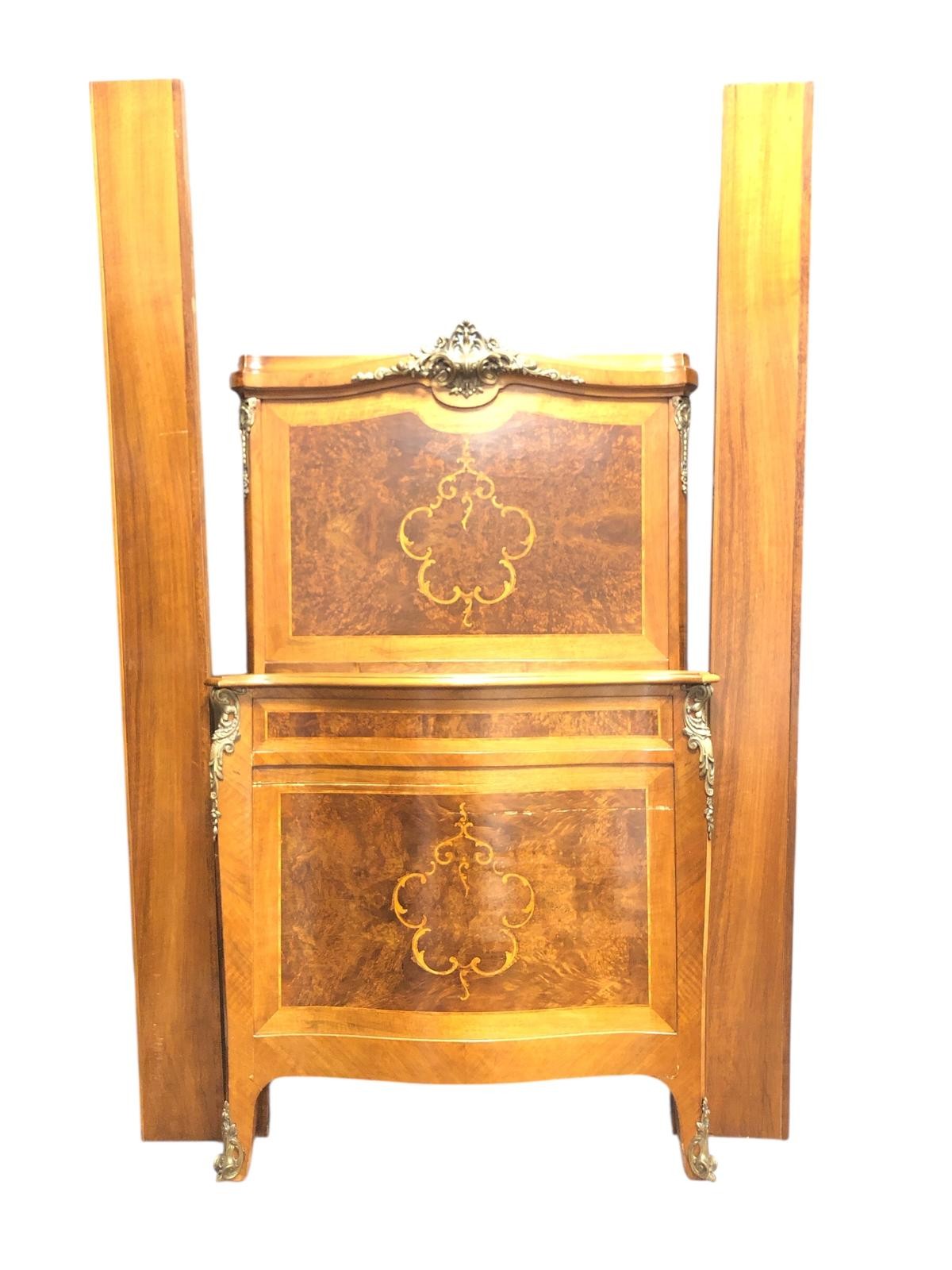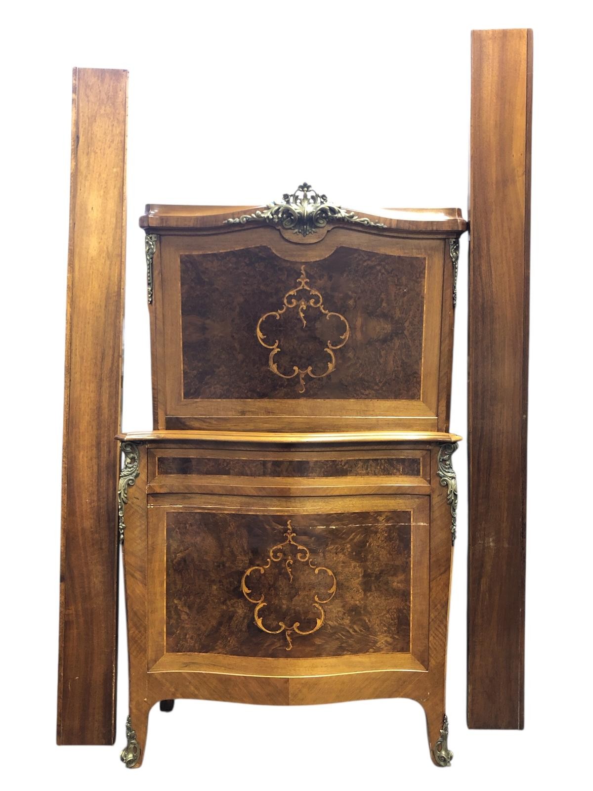 A FINE PAIR OF FRENCH WALNUT, MAHOGANY, SATINWOOD AND GILT BRASS MOUNTED TWIN BEDS each with a rectangular headboard with gilt brass mount with conforming footboard with siderails Each 160cm (h) x 87cm (w) x 213cm (d)