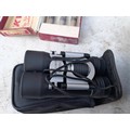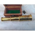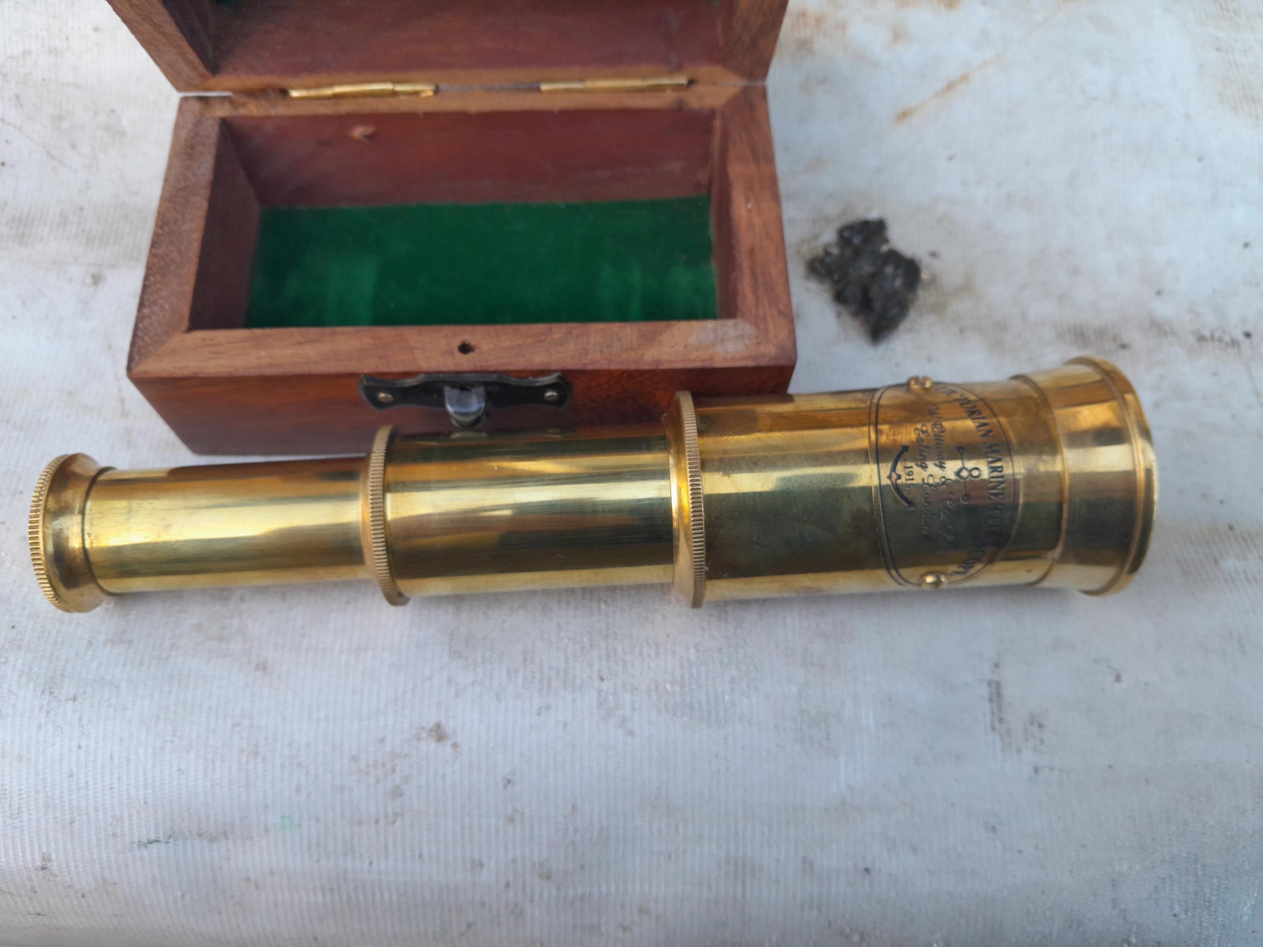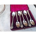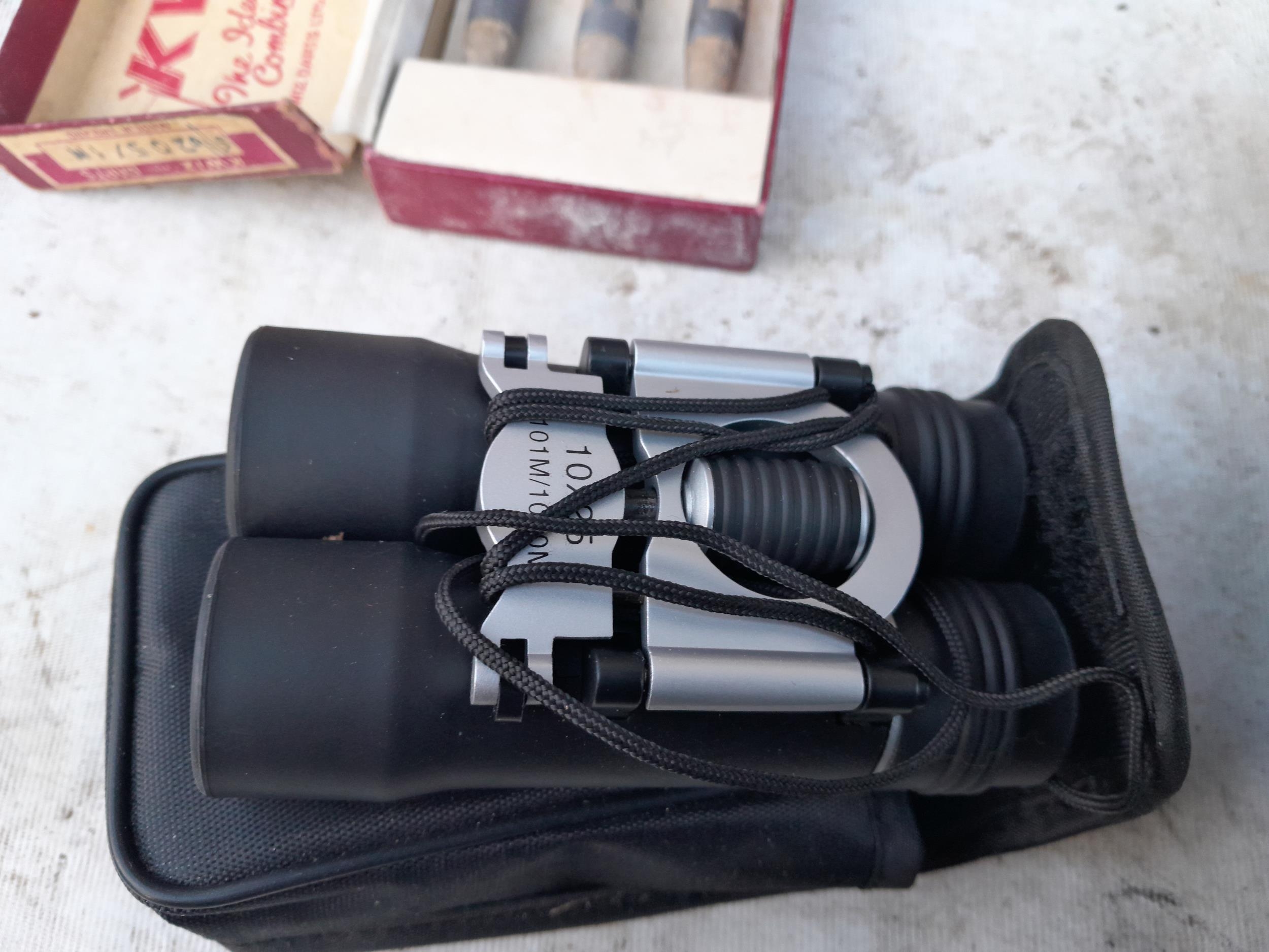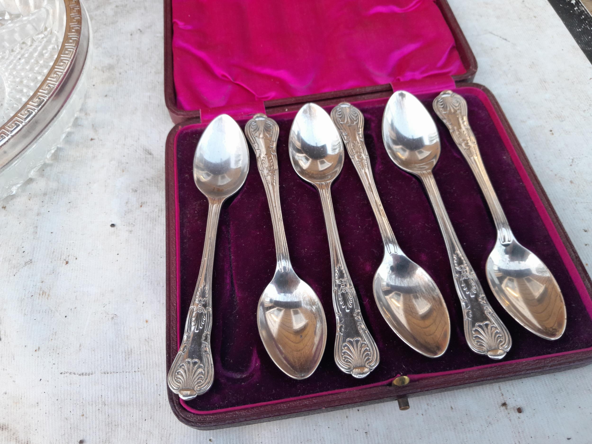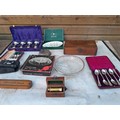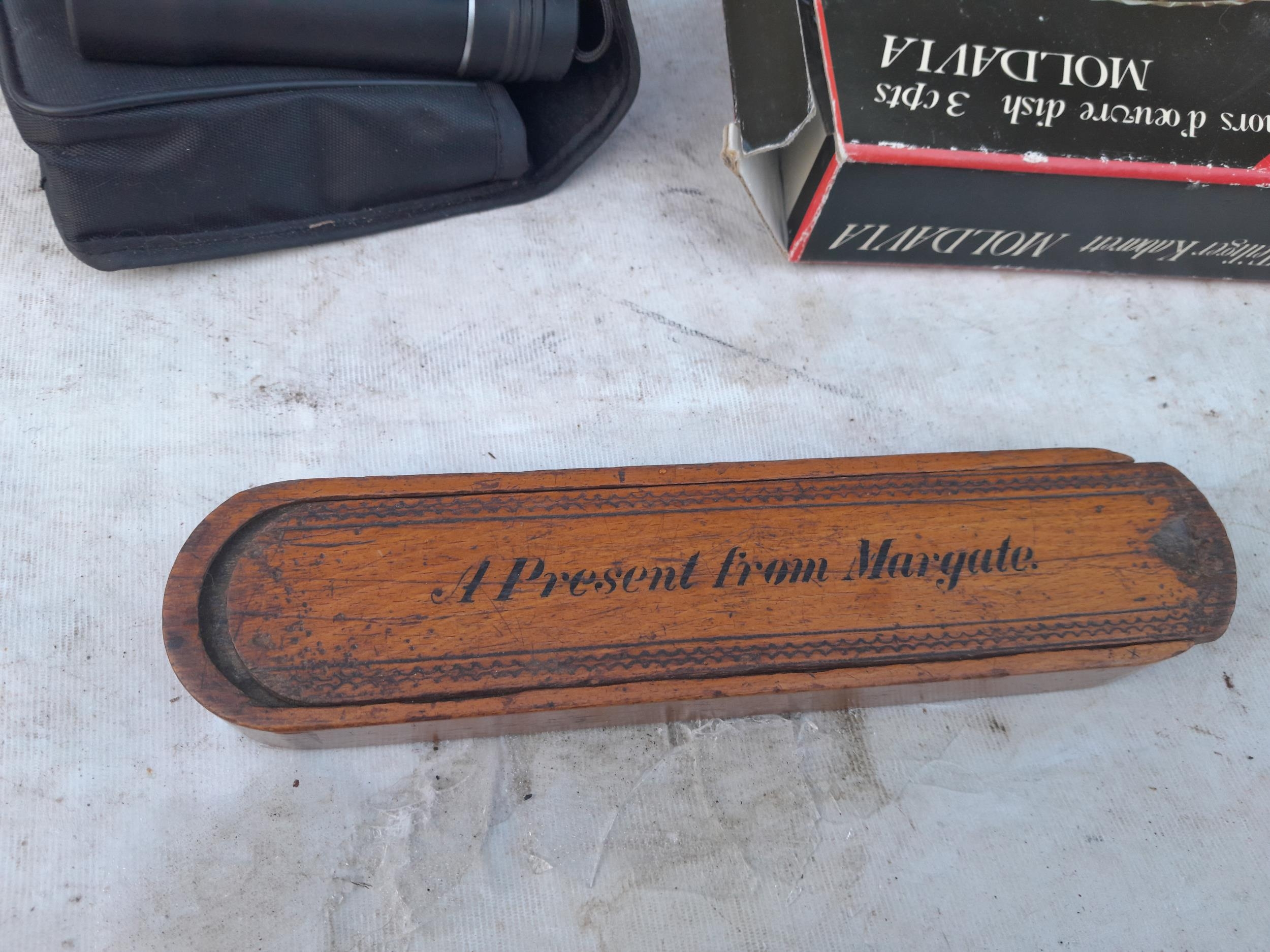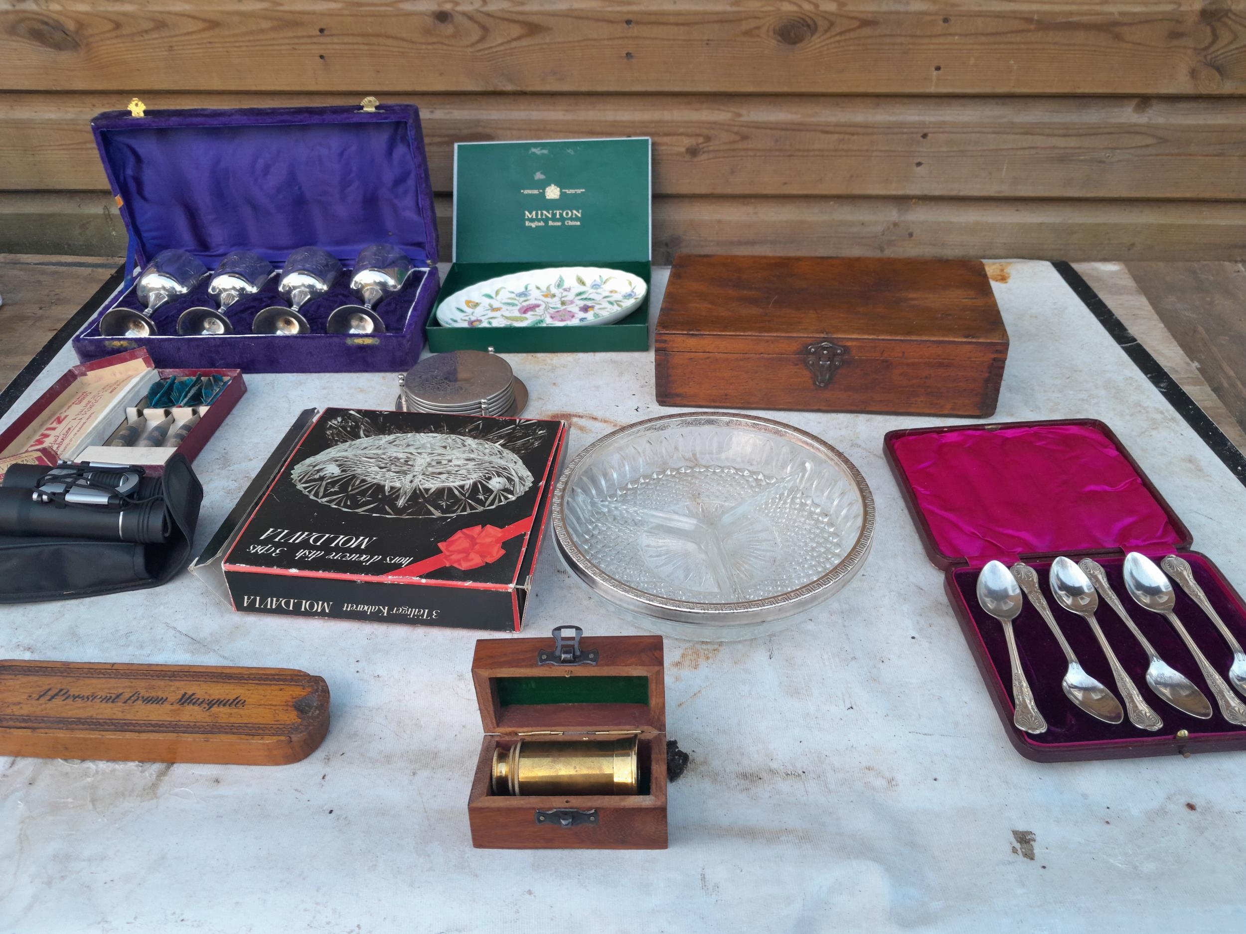 Box of oddments : silver plated spoons, binoculars, tourist ware, reproduction telescope in hardwood box