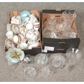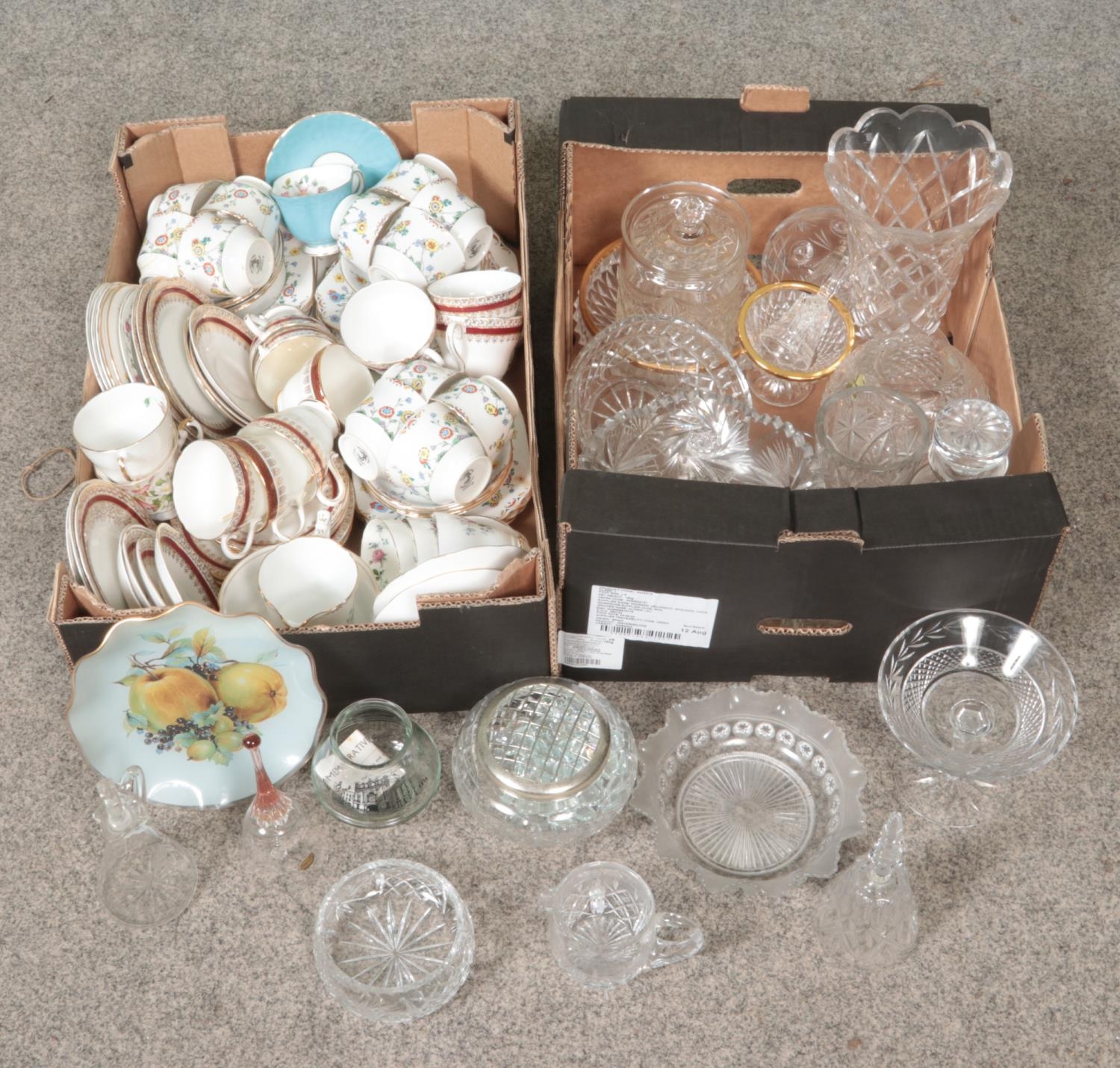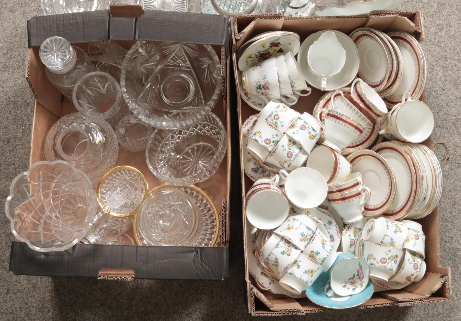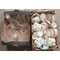 Two boxes of miscellaneous. Includes bone china teawares; Wellington China, Salisbury, Aynsley and a quantity of glass and crystal.