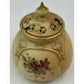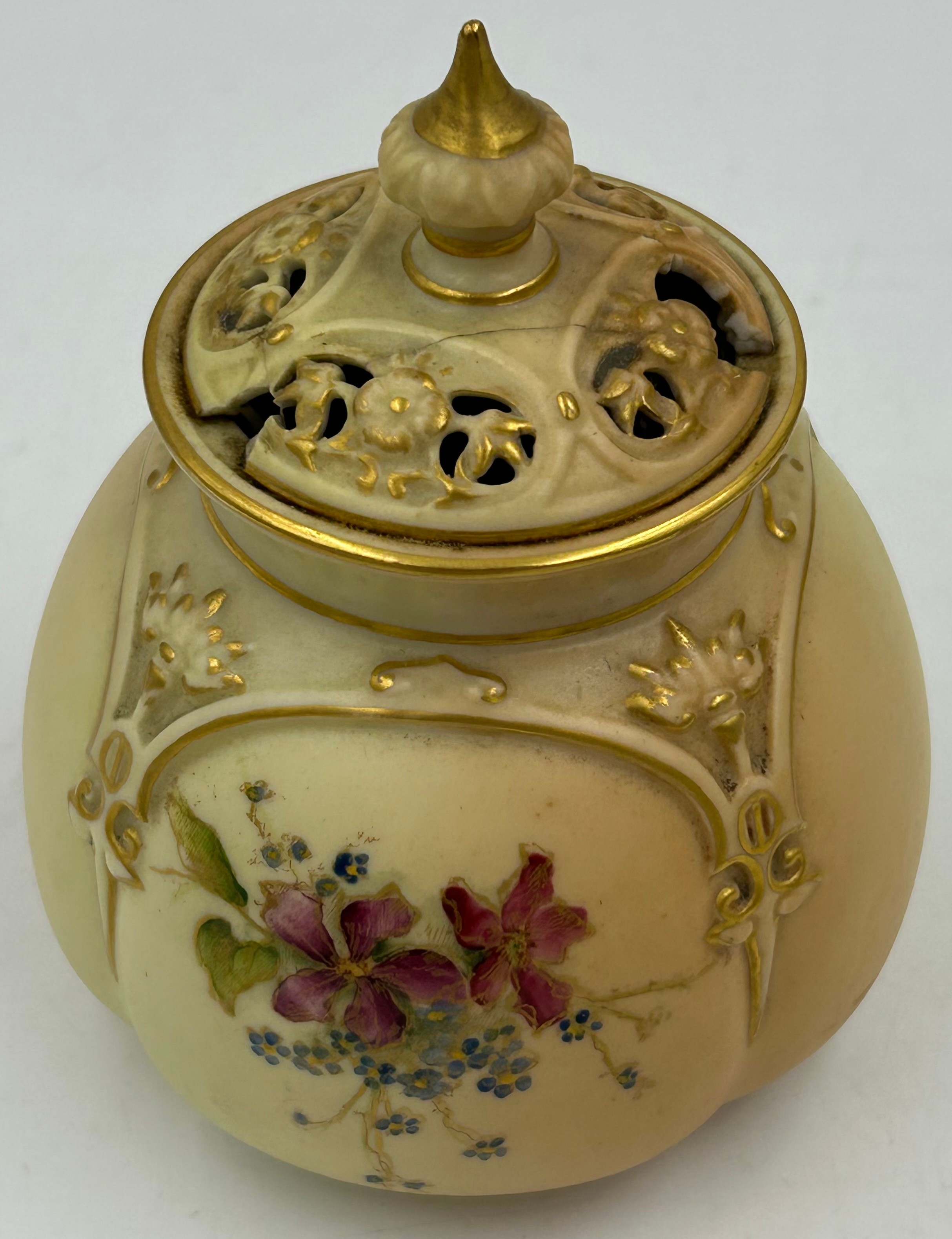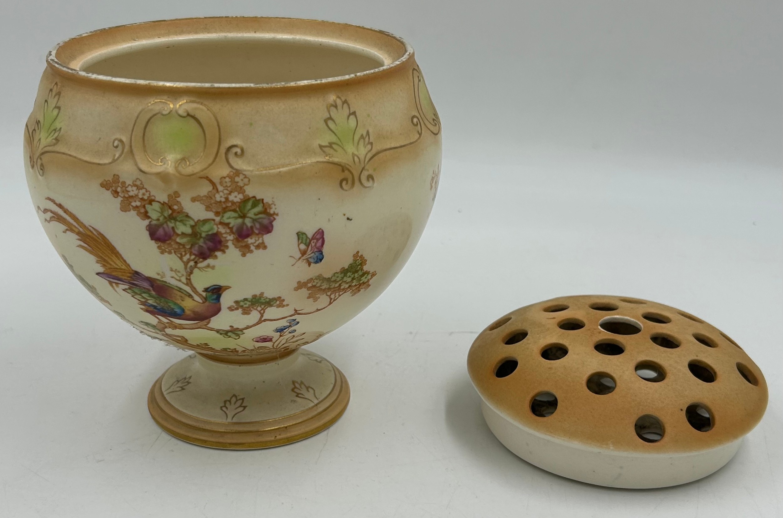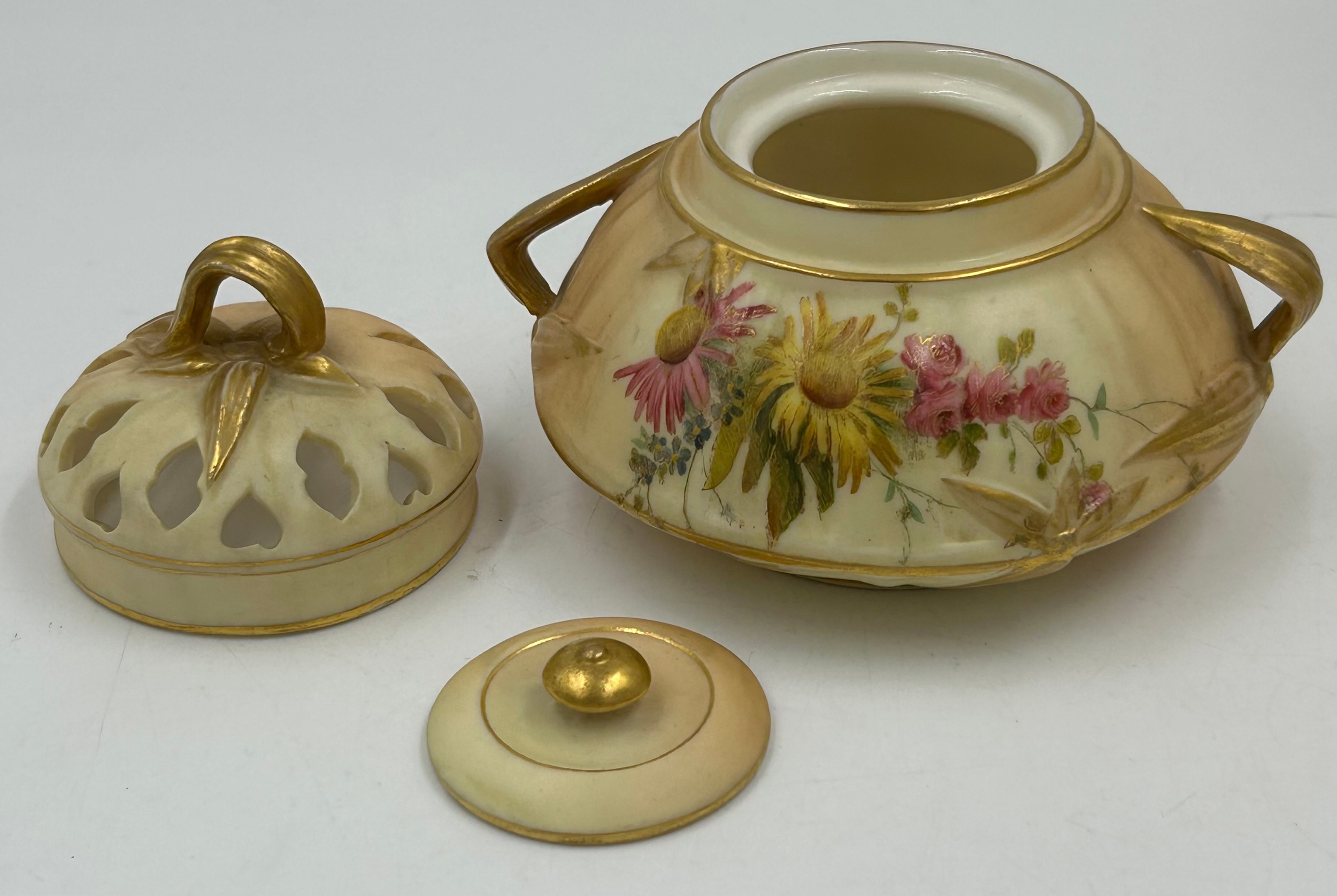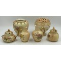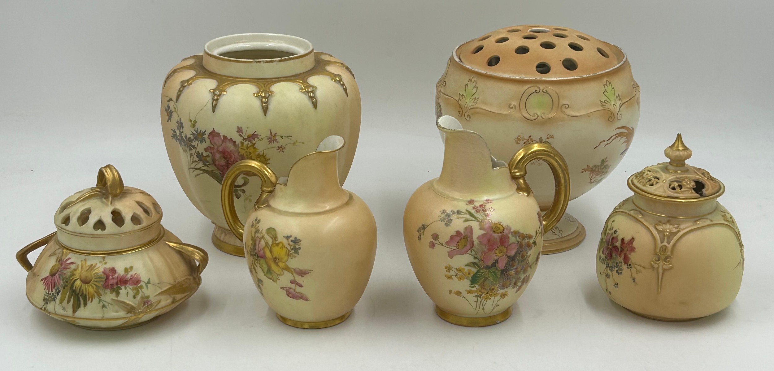 Royal Worcester blush ivory comprising: pot pourri shape 1312 No.112589 lacking lids, 2 x jugs, largest 13cm h, shape 1094, pot pourri twin handled shape 1326 No.114300 with two lids, a pot pourri 175 with fixed glued lid a/f together with a Crown ducal Ware Avis pedestal pot pourri bowl with lid.