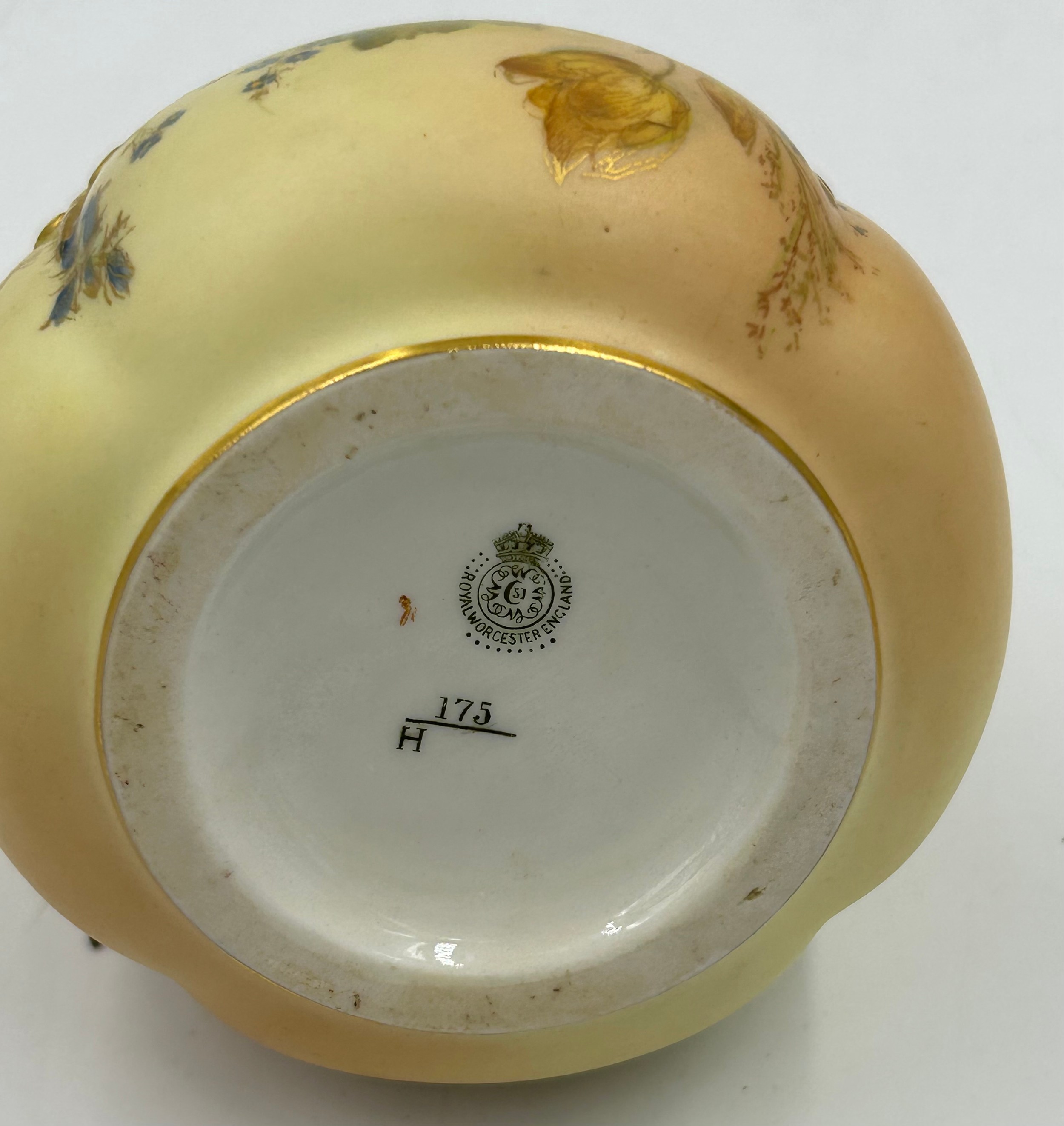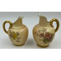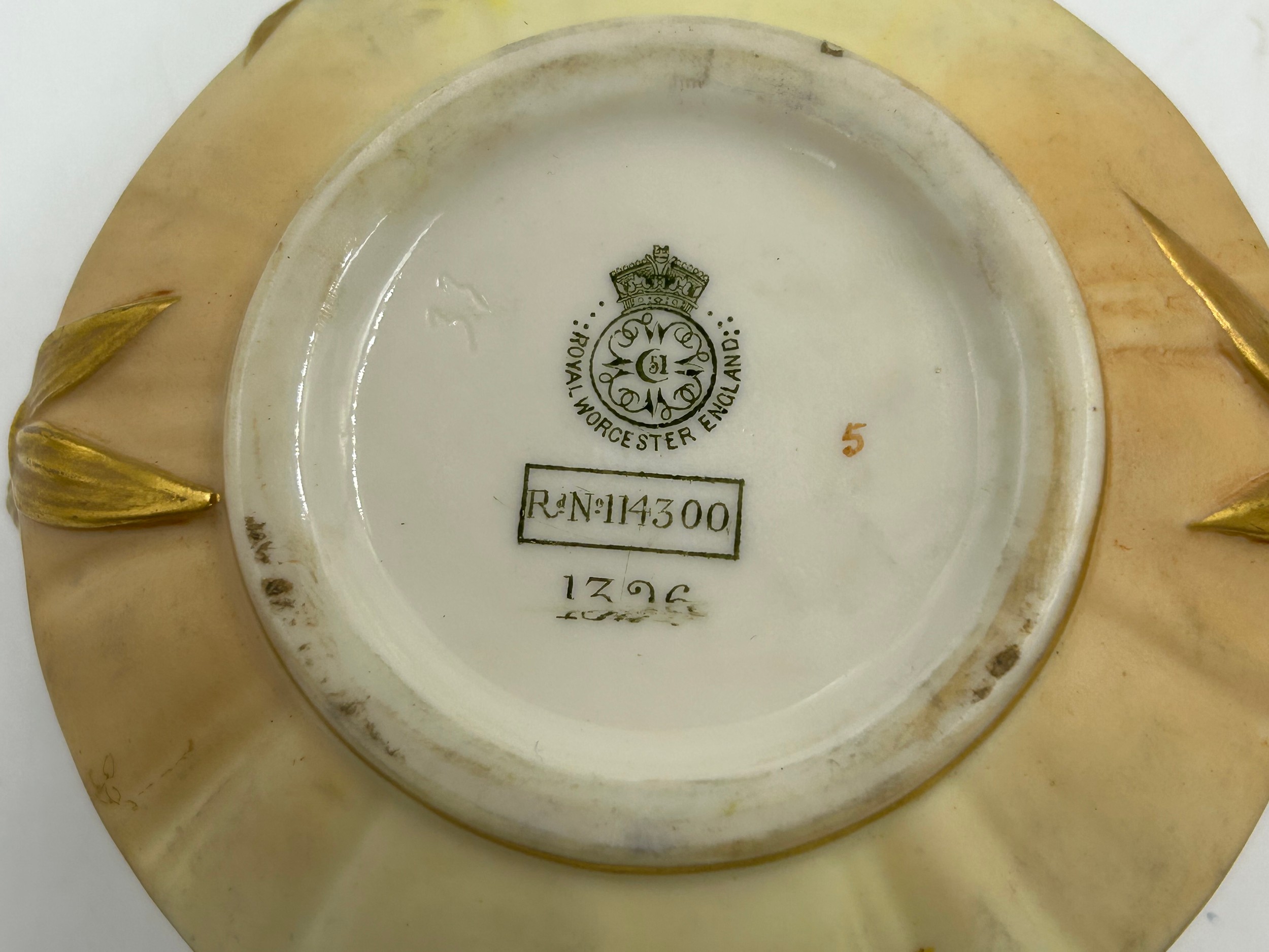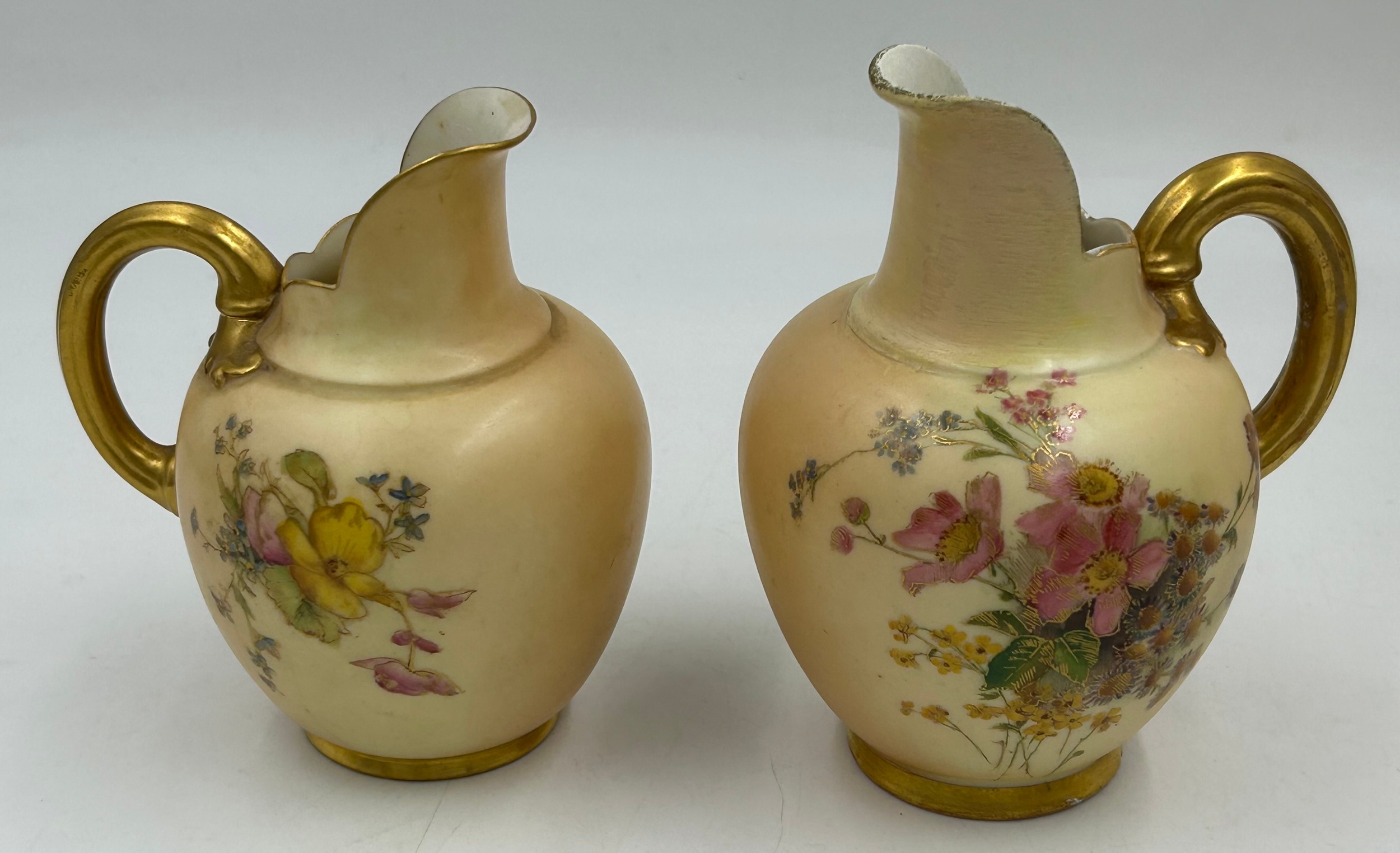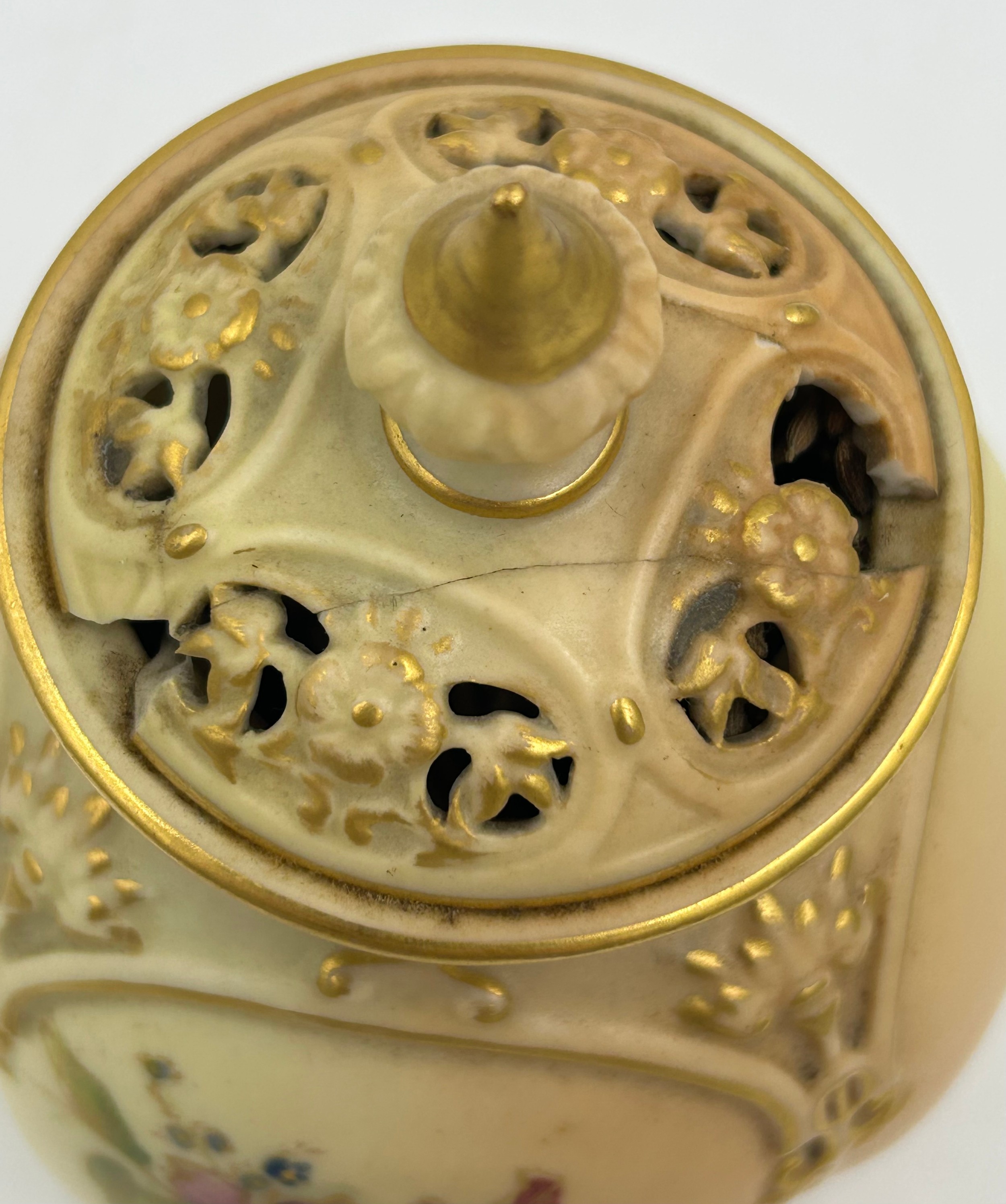 Royal Worcester blush ivory comprising: pot pourri shape 1312 No.112589 lacking lids, 2 x jugs, largest 13cm h, shape 1094, pot pourri twin handled shape 1326 No.114300 with two lids, a pot pourri 175 with fixed glued lid a/f together with a Crown ducal Ware Avis pedestal pot pourri bowl with lid.