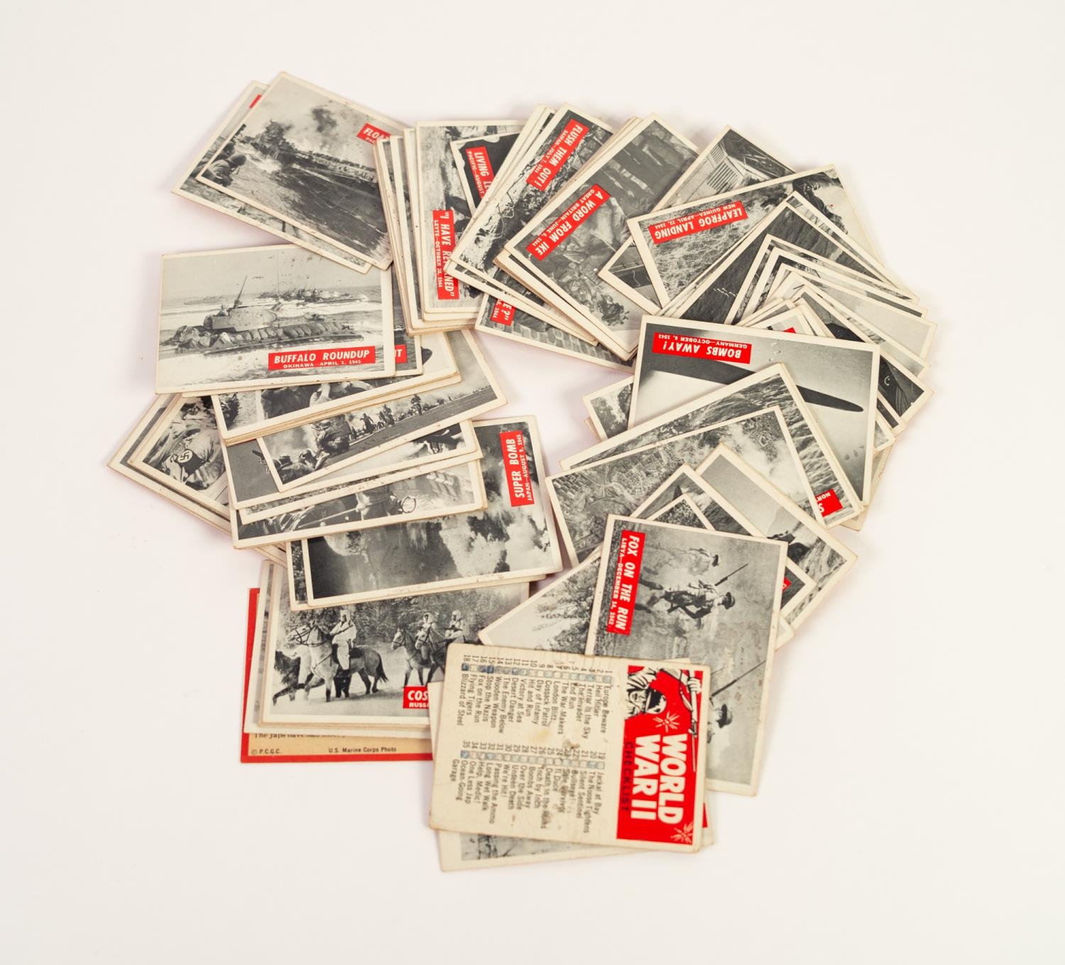 COLLECTION OF 79 'WAR BULLETIN' BLACK AND WHITE PHOTO CARDS OF WWII BATTLE SCENES, with descriptive text verso, printed in USA, together with a CHECK LIST CARD