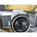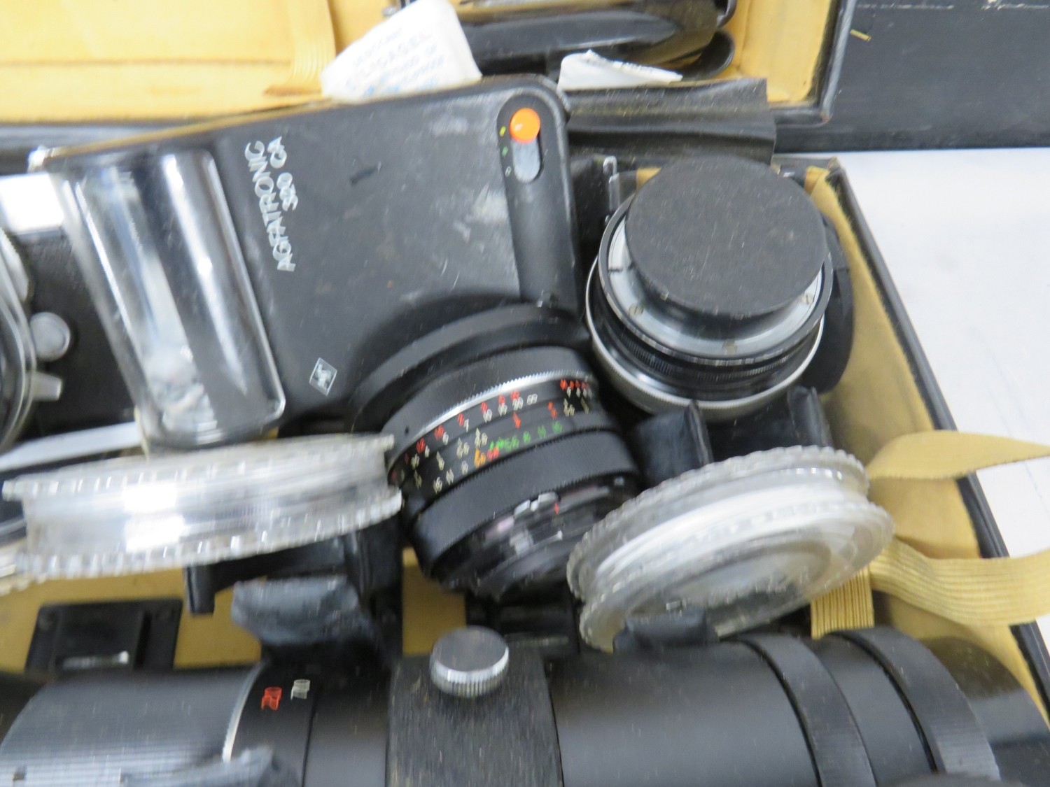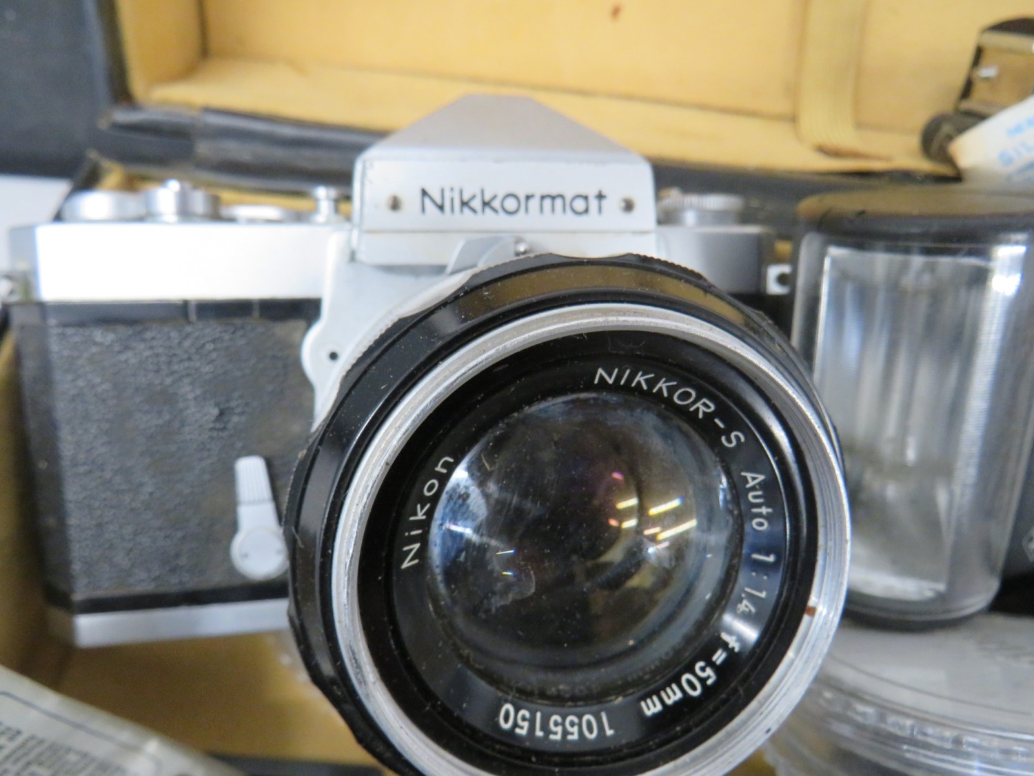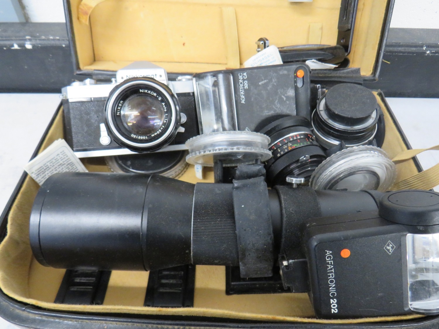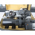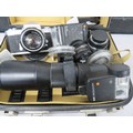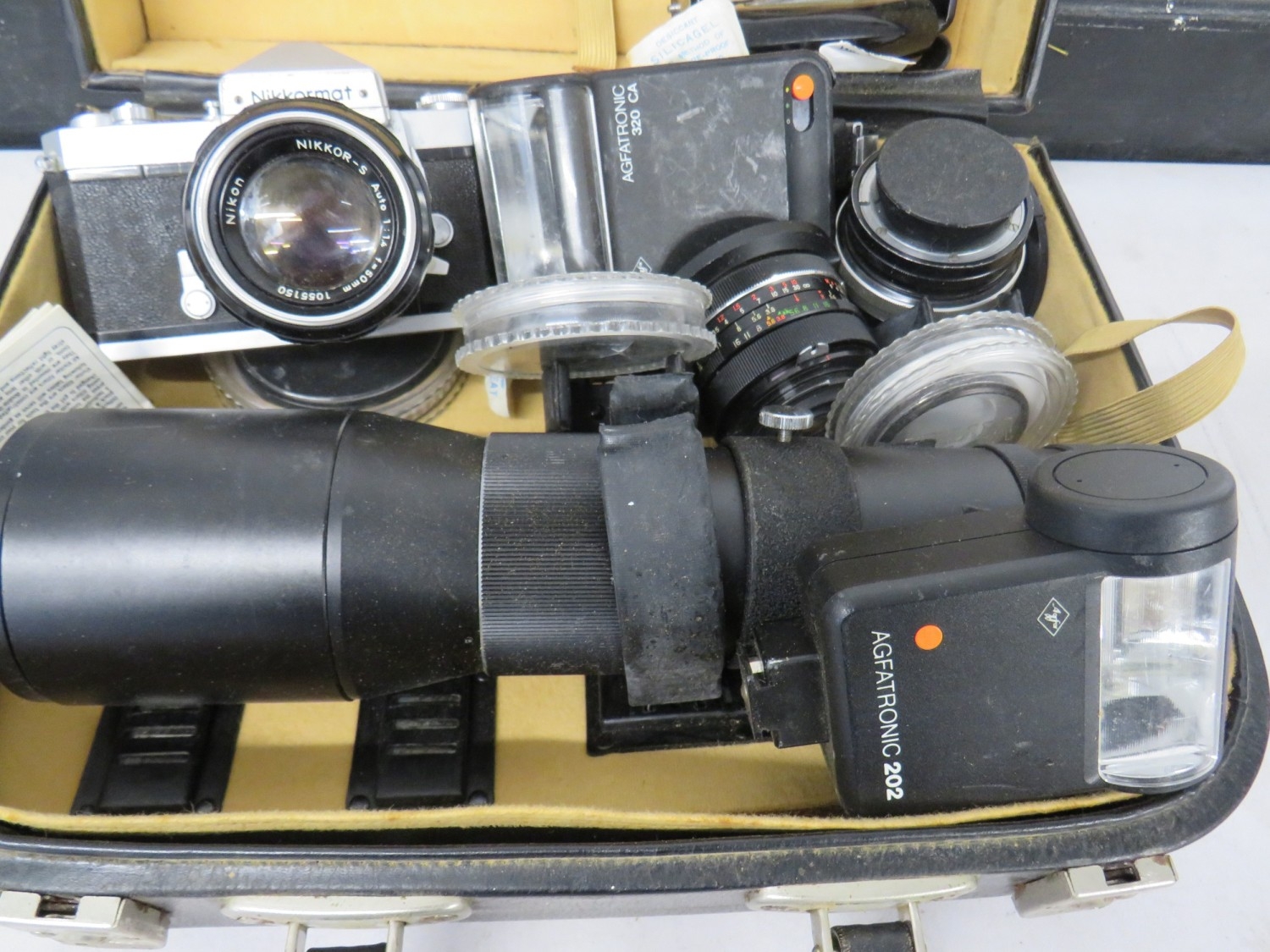 Nikkormat camera with an assortment of lenses